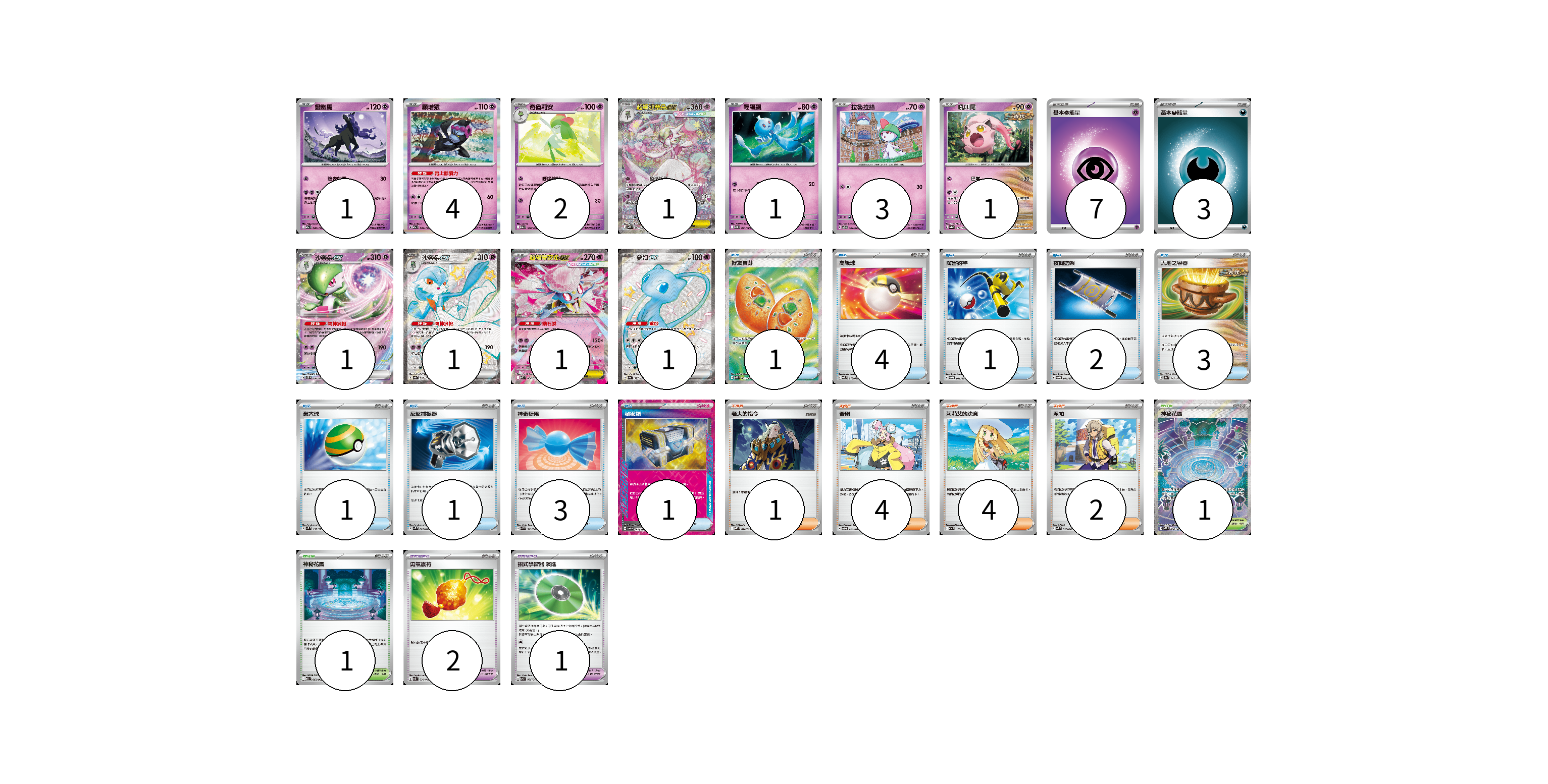 牌組構築方案 以此牌組為基礎新構築牌組 顯示卡面 顯示列表 寶可夢卡(17) 1 4 2 1 1 3 1 1 1 1 1 寶可夢道具(3) 2 1 物品卡(17) 1 4 1 2 3 1 1 3 1 支援者卡(11) 1 4 4 2 競技場卡(2) 1 1 能量卡(10) 7 3 寶可夢卡(17) 卡牌名稱 張數 卡牌名稱 張數 靈幽馬 M2a 080/193 01 願增猿 M2a 081/193 04 奇魯莉安 M2a 070/193 02 超級沙奈朵ex M1S 087/063 01 輕飄飄 SV11W 041/086 01 拉魯拉絲 SVTS 002/022 03 吼叫尾 SV8a 071/187 01 沙奈朵ex SVTS 004/022 01 沙奈朵ex SV4a 328/190 01 超級蒂安希ex MBD 006/022 01 夢幻ex SV4a 327/190 01 寶可夢道具(3) 卡牌名稱 張數 卡牌名稱 張數 勇氣護符 SVK 024/042 02 招式學習器 演進 SVK 025/042 01 物品卡(17) 卡牌名稱 張數 卡牌名稱 張數 好友寶芬 M1S 081/063 01 高級球 SVQL 015/022 04 厲害釣竿 SVOM 011/021 01 夜間擔架 SVOM 016/021 02 大地之容器 SV8a 143/187 03 巢穴球 SVM 133/175 01 反擊捕捉器 SVK 009/042 01 神奇糖果 SVK 019/042 03 秘密箱 SV6 092/101 01 支援者卡(11) 卡牌名稱 張數 卡牌名稱 張數 老大的指令 MBD 020/022 01 奇樹 SVOD 016/020 04 莉莉艾的決意 M2a 175/193 04 派帕 SVK 035/042 02 競技場卡(2) 卡牌名稱 張數 卡牌名稱 張數 神秘花園 M1S 086/063 01 神秘花園 M1S 063/063 01 能量卡(10) 卡牌名稱 張數 卡牌名稱 張數 基本【超】能量 M-P PSY 07 基本【惡】能量 M-P DAR 03 以此牌組為基礎新構築牌組 牌組編碼 BJgVxA-TKnYVO-AcWJDq copy 列印牌組單 牌組編碼已複製 分享至SNS