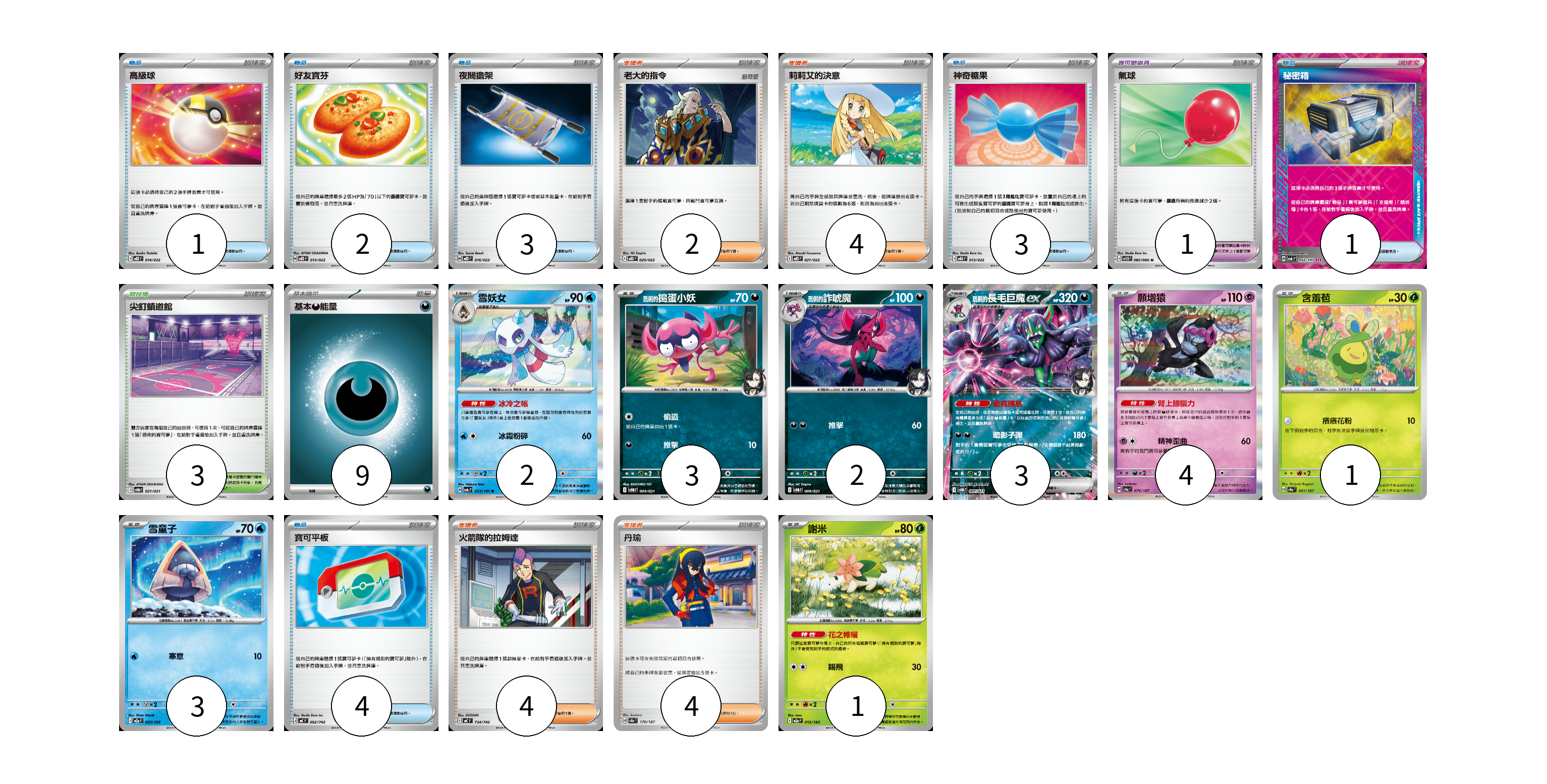 牌組構築方案 以此牌組為基礎新構築牌組 顯示卡面 顯示列表 寶可夢卡(19) 2 3 2 3 4 1 3 1 寶可夢道具(1) 1 物品卡(14) 1 2 3 3 1 4 支援者卡(14) 2 4 4 4 競技場卡(3) 3 能量卡(9) 9 寶可夢卡(19) 卡牌名稱 張數 卡牌名稱 張數 雪妖女 SV6 033/101 02 <瑪俐的>搗蛋小妖 SVOM 005/021 03 <瑪俐的>詐唬魔 SVOM 006/021 02 <瑪俐的>長毛巨魔ex SVOM 007/021 03 願增猿 SV8a 075/187 04 含羞苞 SV8a 001/187 01 雪童子 M2a 035/193 03 謝米 M2a 012/193 01 寶可夢道具(1) 卡牌名稱 張數 卡牌名稱 張數 氣球 SV11B 082/086 01 物品卡(14) 卡牌名稱 張數 卡牌名稱 張數 高級球 MBD 014/022 01 好友寶芬 MBD 013/022 02 夜間擔架 MBD 016/022 03 神奇糖果 MBG 013/022 03 秘密箱 SV6 092/101 01 寶可平板 MC 662/742 04 支援者卡(14) 卡牌名稱 張數 卡牌名稱 張數 老大的指令 MBD 020/022 02 莉莉艾的決意 MBD 021/022 04 火箭隊的拉姆達 MC 734/742 04 丹瑜 SV8a 170/187 04 競技場卡(3) 卡牌名稱 張數 卡牌名稱 張數 尖釘鎮道館 SVOM 021/021 03 能量卡(9) 卡牌名稱 張數 卡牌名稱 張數 基本【惡】能量 MBG DAR 09 以此牌組為基礎新構築牌組 牌組編碼 BJvWYB-TRwNtf-mHKiHs copy 列印牌組單 牌組編碼已複製 分享至SNS