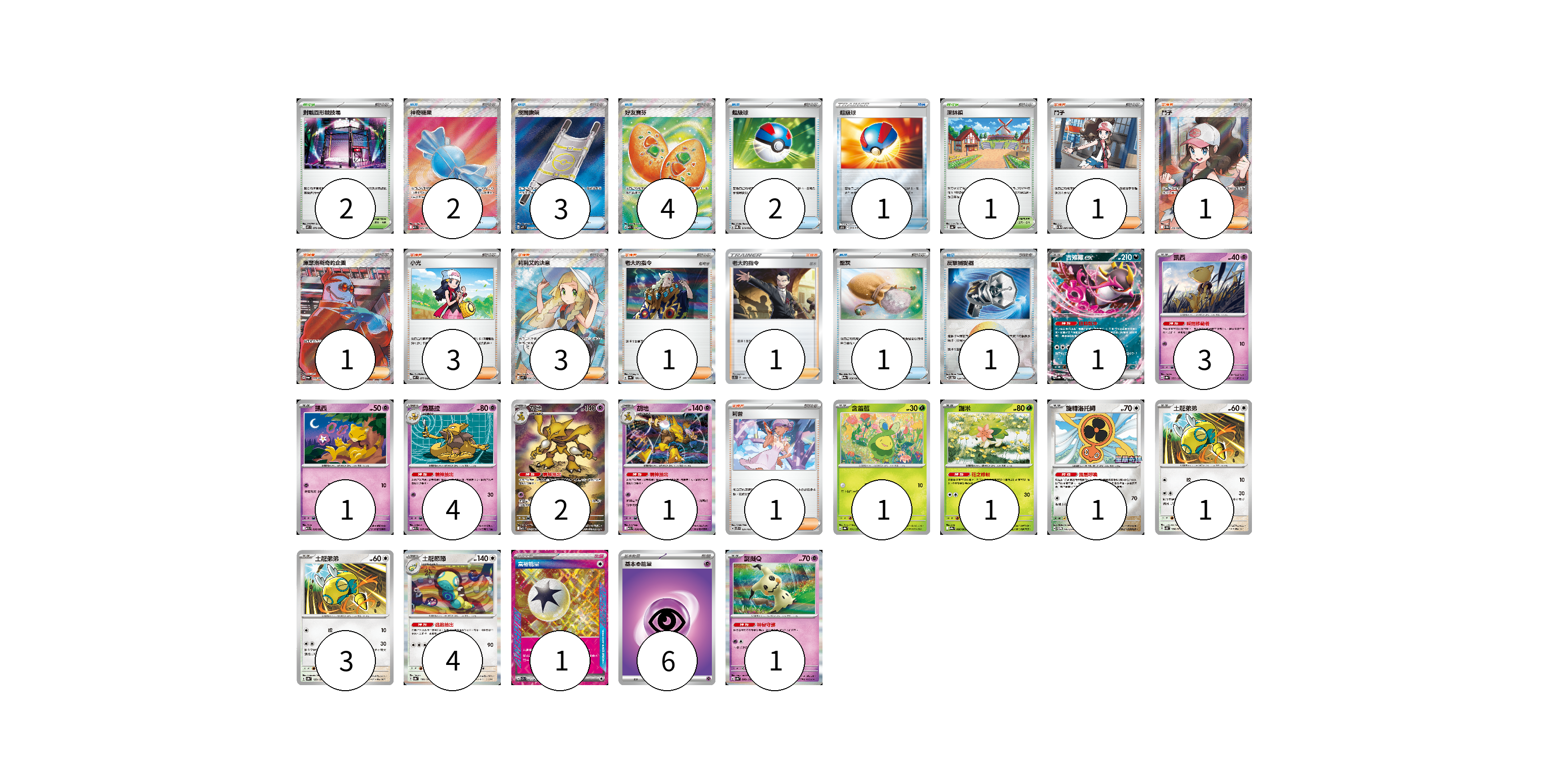 牌組構築方案 以此牌組為基礎新構築牌組 顯示卡面 顯示列表 寶可夢卡(24) 1 3 1 4 2 1 1 1 1 1 3 4 1 物品卡(14) 2 3 4 2 1 1 1 支援者卡(12) 1 1 1 3 3 1 1 1 競技場卡(3) 2 1 能量卡(7) 1 6 寶可夢卡(24) 卡牌名稱 張數 卡牌名稱 張數 吉雉雞ex SV8a 104/187 01 凱西 SV8a 057/187 03 凱西 M1S 036/063 01 勇基拉 M1S 037/063 04 胡地 M1S 071/063 02 胡地 M1S 038/063 01 含羞苞 SV8a 001/187 01 謝米 SV9a 006/063 01 旋轉洛托姆 SV-P 146/SV-P 01 土龍弟弟 SV5K 056/071 01 土龍弟弟 SV8a 129/187 03 土龍節節 SV8a 130/187 04 謎擬Q SV4a 088/190 01 物品卡(14) 卡牌名稱 張數 卡牌名稱 張數 神奇糖果 M1S 082/063 02 夜間擔架 M1L 083/063 03 好友寶芬 M1S 081/063 04 超級球 SVQL 014/022 02 超級球 SO 019/030 01 聖灰 SV9a 056/063 01 反擊捕捉器 SV8a 139/187 01 支援者卡(12) 卡牌名稱 張數 卡牌名稱 張數 鬥子 SV11W 085/086 01 鬥子 SV11W 166/086 01 庫瑟洛斯奇的企圖 SV6a 086/064 01 小光 M2 077/080 03 莉莉艾的決意 M1L 086/063 03 老大的指令 SV4a 181/190 01 老大的指令(坂木) SC1b 148/153 01 莉普 SVTS 021/022 01 競技場卡(3) 卡牌名稱 張數 卡牌名稱 張數 對戰圓形競技場 M2 079/080 02 深缽鎮 SV4a 185/190 01 能量卡(7) 卡牌名稱 張數 卡牌名稱 張數 富裕能量 SV7a 064/064 01 基本【超】能量 SVAW PSY 06 以此牌組為基礎新構築牌組 牌組編碼 BNJvGp-LOrUgK-xgUHIy copy 列印牌組單 牌組編碼已複製 分享至SNS