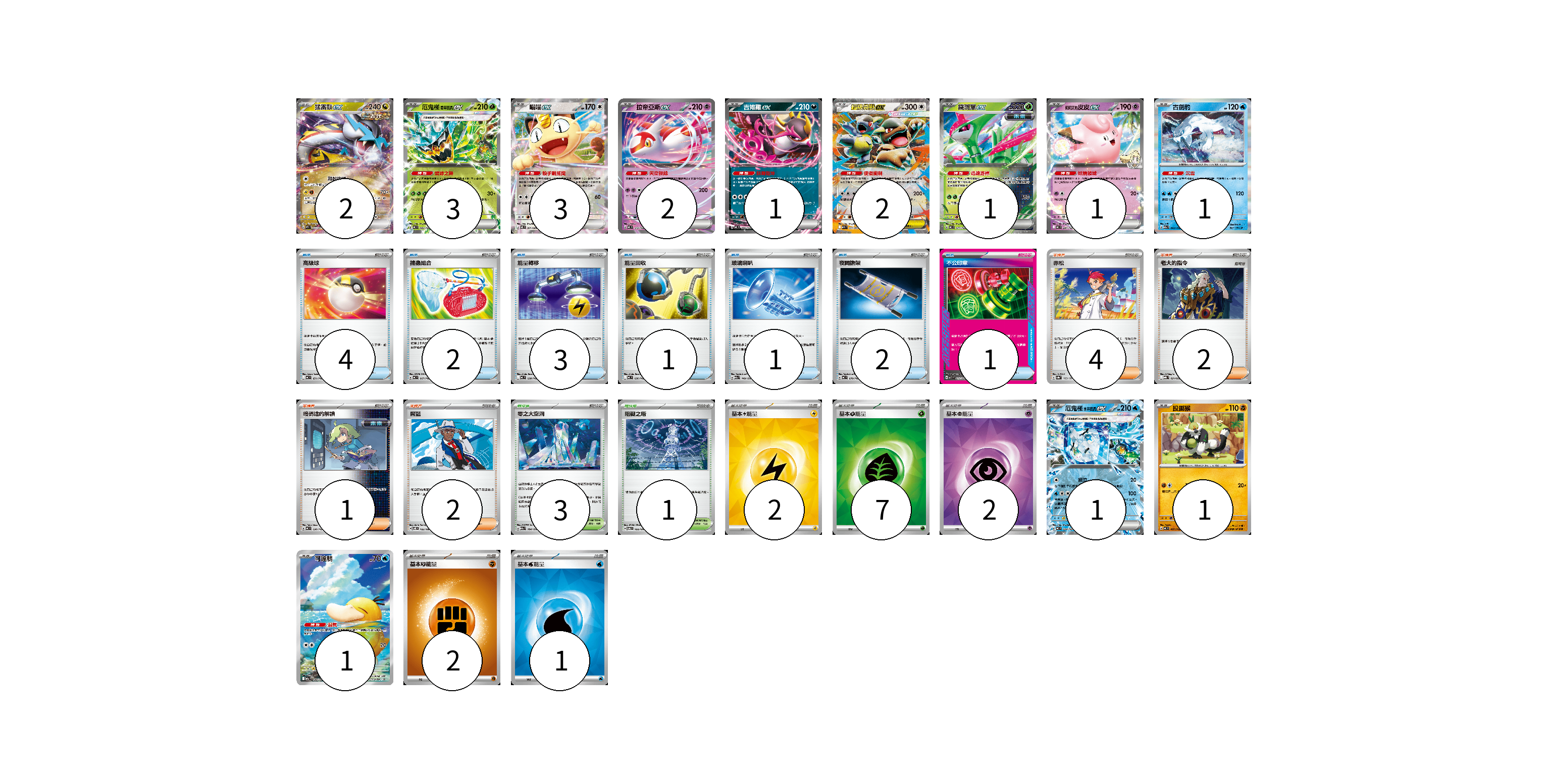 牌組構築方案 以此牌組為基礎新構築牌組 顯示卡面 顯示列表 寶可夢卡(19) 2 3 3 2 1 2 1 1 1 1 1 1 物品卡(14) 4 2 3 1 1 2 1 支援者卡(9) 4 2 1 2 競技場卡(4) 3 1 能量卡(14) 2 7 2 2 1 寶可夢卡(19) 卡牌名稱 張數 卡牌名稱 張數 猛雷鼓ex SV5K 053/071 02 厄鬼椪 碧草面具ex MC 082/742 03 喵喵ex M3 061/080 03 拉帝亞斯ex MC 312/742 02 吉雉雞ex MC 489/742 01 超級袋獸ex M1S 051/063 02 鐵斑葉ex MC 077/742 01 莉莉艾的皮皮ex MC 287/742 01 古劍豹 M2a 043/193 01 厄鬼椪 水井面具ex MC 224/742 01 投擲猴 MC 407/742 01 可達鴨 M2a 199/193 01 物品卡(14) 卡牌名稱 張數 卡牌名稱 張數 高級球 MC 651/742 04 捕蟲組合 MC 667/742 02 能量轉移 MC 638/742 03 能量回收 MC 636/742 01 玻璃喇叭 M2a 149/193 01 夜間擔架 MC 670/742 02 不公印章 MBD 011/022 01 支援者卡(9) 卡牌名稱 張數 卡牌名稱 張數 赤松 SV8a 163/187 04 老大的指令 MBG 021/022 02 暗碼迷的解讀 MC 698/742 01 席藍 SV8 102/106 02 競技場卡(4) 卡牌名稱 張數 卡牌名稱 張數 零之大空洞 M2a 184/193 03 阻礙之塔 SV6 100/101 01 能量卡(14) 卡牌名稱 張數 卡牌名稱 張數 基本【雷】能量 SVK LIG 02 基本【草】能量 SVK GRA 07 基本【超】能量 SVK PSY 02 基本【鬥】能量 MC FIG 02 基本【水】能量 SVK WAT 01 以此牌組為基礎新構築牌組 牌組編碼 BNvcLR-fercvy-iyTTcq copy 列印牌組單 牌組編碼已複製 分享至SNS