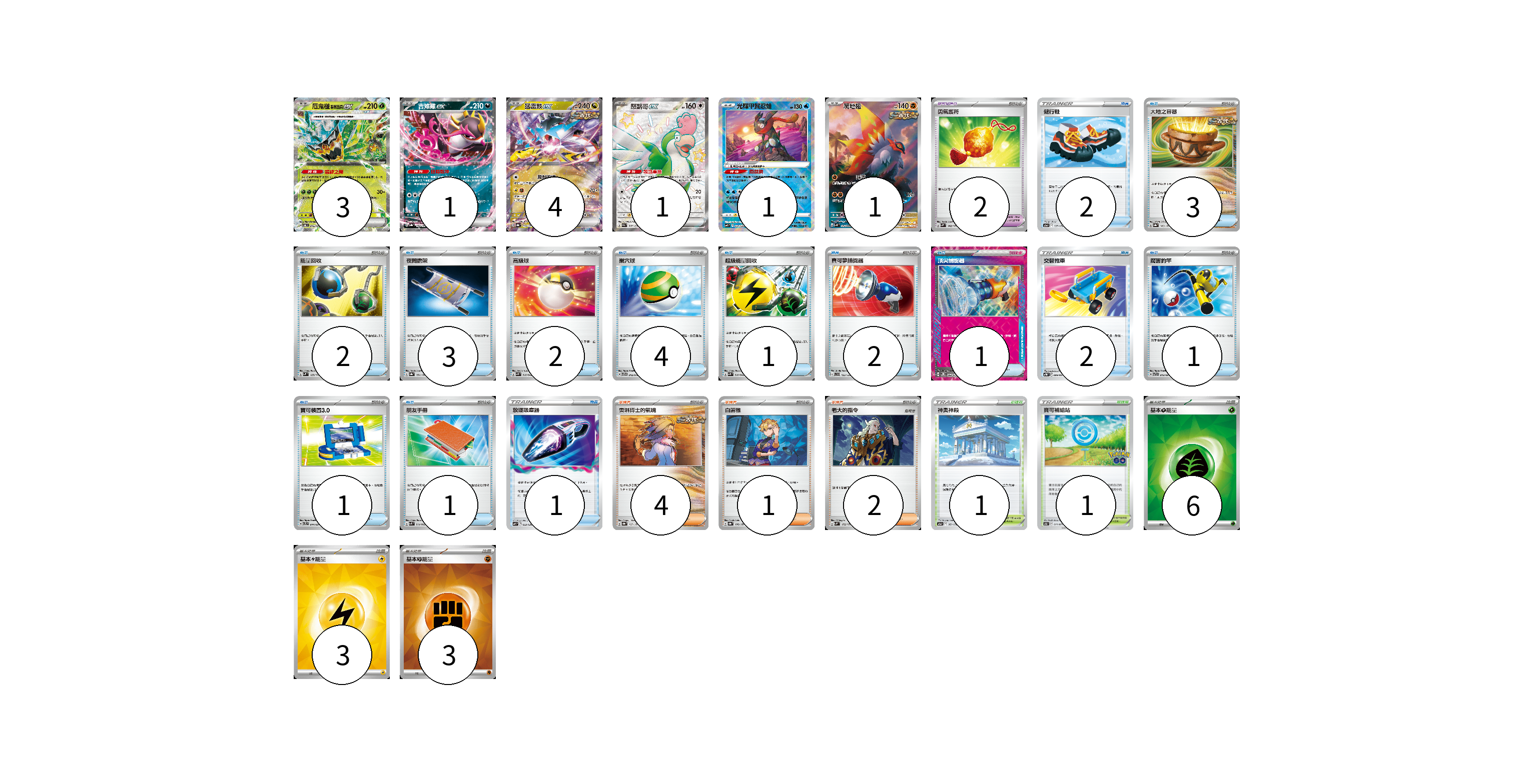 牌組構築方案 以此牌組為基礎新構築牌組 顯示卡面 顯示列表 寶可夢卡(11) 3 1 4 1 1 1 寶可夢道具(2) 2 物品卡(26) 2 3 2 3 2 4 1 2 1 2 1 1 1 1 支援者卡(7) 4 1 2 競技場卡(2) 1 1 能量卡(12) 6 3 3 寶可夢卡(11) 卡牌名稱 張數 卡牌名稱 張數 厄鬼椪 碧草面具ex SV6 016/101 03 吉雉雞ex SV8a 104/187 01 猛雷鼓ex SV8a 124/187 04 怒鸚哥ex SV4a 337/190 01 光輝甲賀忍蛙 SVF 004/038 01 爬地翅 SV4K 074/066 01 寶可夢道具(2) 卡牌名稱 張數 卡牌名稱 張數 勇氣護符 SVM 142/175 02 物品卡(26) 卡牌名稱 張數 卡牌名稱 張數 健行鞋 S12a 137/172 02 大地之容器 SV8a 143/187 03 能量回收 SVM 125/175 02 夜間擔架 SV8a 151/187 03 高級球 SVK 018/042 02 巢穴球 SVTG 012/019 04 超級能量回收 SVK 010/042 01 寶可夢捕捉器 SVD 123/139 02 頂尖捕捉器 SV5M 062/071 01 交替推車 SVTR 009/021 02 厲害釣竿 SVTR 012/021 01 寶可裝置3.0 SVTL 014/021 01 朋友手冊 SVK 014/042 01 放逐吸塵器 SVF 023/038 01 支援者卡(7) 卡牌名稱 張數 卡牌名稱 張數 奧琳博士的氣魄 SV8a 167/187 04 白蕾雅 SV8a 176/187 01 老大的指令 SVM 172/175 02 競技場卡(2) 卡牌名稱 張數 卡牌名稱 張數 神奧神殿 S12a 169/172 01 寶可補給站 S10b 071/071 01 能量卡(12) 卡牌名稱 張數 卡牌名稱 張數 基本【草】能量 SVK GRA 06 基本【雷】能量 SVK LIG 03 基本【鬥】能量 SVK FIG 03 以此牌組為基礎新構築牌組 牌組編碼 BOSFto-eTeAfw-RFgHpy copy 列印牌組單 牌組編碼已複製 分享至SNS