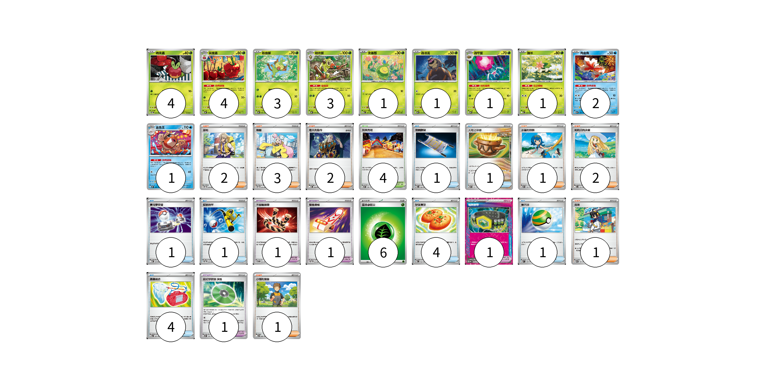 牌組構築方案 以此牌組為基礎新構築牌組 顯示卡面 顯示列表 寶可夢卡(21) 4 4 3 3 1 1 1 1 2 1 寶可夢道具(4) 1 1 1 1 物品卡(13) 1 1 1 1 4 1 4 支援者卡(12) 2 3 2 1 2 1 1 競技場卡(4) 4 能量卡(6) 6 寶可夢卡(21) 卡牌名稱 張數 卡牌名稱 張數 啃果蟲 SV6 011/101 04 裹蜜蟲 SV8a 009/187 04 敲音猴 SV8a 006/187 03 啪咚猴 SV8a 007/187 03 含羞苞 M2a 011/193 01 蟲滾泥 SV8a 013/187 01 蟲甲聖 SV8a 014/187 01 謝米 M2a 012/193 01 角金魚 SV8a 028/187 02 金魚王 SV8a 029/187 01 寶可夢道具(4) 卡牌名稱 張數 卡牌名稱 張數 不服輸頭帶 SVTL 016/021 01 緊急滑板 SVOD 015/020 01 極限腰帶 SV8a 159/187 01 招式學習器 演進 SV8a 160/187 01 物品卡(13) 卡牌名稱 張數 卡牌名稱 張數 夜間擔架 M2a 159/193 01 大地之容器 SV8a 143/187 01 寶可夢交替 MBG 015/022 01 厲害釣竿 SVOD 010/020 01 好友寶芬 M2a 153/193 04 巢穴球 SVM 133/175 01 捕蟲組合 M2a 157/193 04 支援者卡(12) 卡牌名稱 張數 卡牌名稱 張數 派帕 SVOD 018/020 02 奇樹 SVOD 016/020 03 老大的指令 MBD 020/022 02 水蓮的照顧 SV8a 168/187 01 莉莉艾的決意 M2a 175/193 02 烏栗 SV8a 169/187 01 小剛的發掘 SV9 096/100 01 競技場卡(4) 卡牌名稱 張數 卡牌名稱 張數 祭典會場 SV8a 180/187 04 能量卡(6) 卡牌名稱 張數 卡牌名稱 張數 基本【草】能量 M-P GRA 06 以此牌組為基礎新構築牌組 牌組編碼 BPmJoy-uENHOW-kanlAn copy 列印牌組單 牌組編碼已複製 分享至SNS