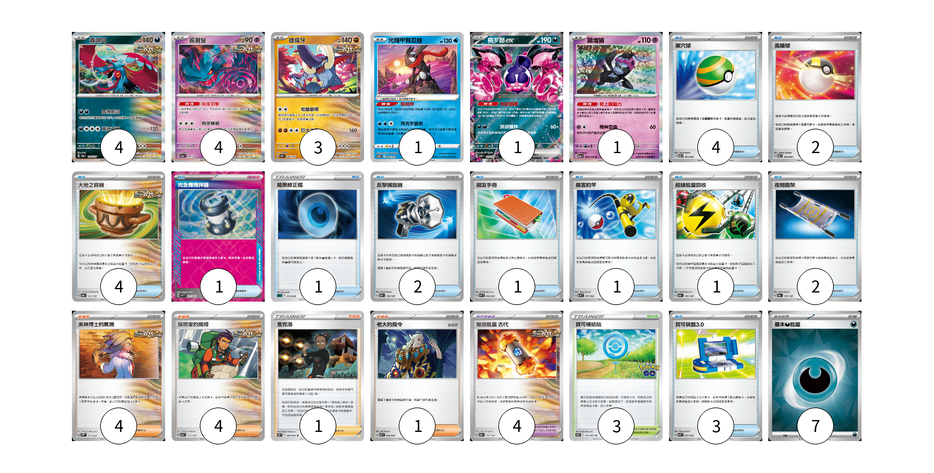 牌組構築方案 以此牌組為基礎新構築牌組 顯示卡面 顯示列表 寶可夢卡(14) 4 4 3 1 1 1 寶可夢道具(4) 4 物品卡(22) 4 2 4 1 1 2 1 1 1 2 3 支援者卡(10) 4 4 1 1 競技場卡(3) 3 能量卡(7) 7 寶可夢卡(14) 卡牌名稱 張數 卡牌名稱 張數 轟鳴月 SV8a 100/187 04 振翼髮 SV8a 072/187 04 雄偉牙 SV8a 086/187 03 光輝甲賀忍蛙 SVTG 002/019 01 桃歹郎ex SV8a 105/187 01 願增猿 SV6 055/101 01 寶可夢道具(4) 卡牌名稱 張數 卡牌名稱 張數 驅勁能量 古代 SV8a 157/187 04 物品卡(22) 卡牌名稱 張數 卡牌名稱 張數 巢穴球 SVTL 011/021 04 高級球 SVTL 012/021 02 大地之容器 SV8a 143/187 04 完全體攪拌器 SVK 017/042 01 暗黑修正檔 SLD 012/020 01 反擊捕捉器 SV8a 139/187 02 朋友手冊 SVK 014/042 01 厲害釣竿 SVK 011/042 01 超級能量回收 SV8a 141/187 01 夜間擔架 SV8a 151/187 02 寶可裝置3.0 SVK 021/042 03 支援者卡(10) 卡牌名稱 張數 卡牌名稱 張數 奧琳博士的氣魄 SVHK 017/022 04 探險家的嚮導 SV8a 172/187 04 查克洛 S10P 065/067 01 老大的指令 SVK 036/042 01 競技場卡(3) 卡牌名稱 張數 卡牌名稱 張數 寶可補給站 S10b 071/071 03 能量卡(7) 卡牌名稱 張數 卡牌名稱 張數 基本【惡】能量 SVM DAR 07 以此牌組為基礎新構築牌組 牌組編碼 BQiOEV-oCLvaa-kPeqOd copy 列印牌組單 牌組編碼已複製 分享至SNS