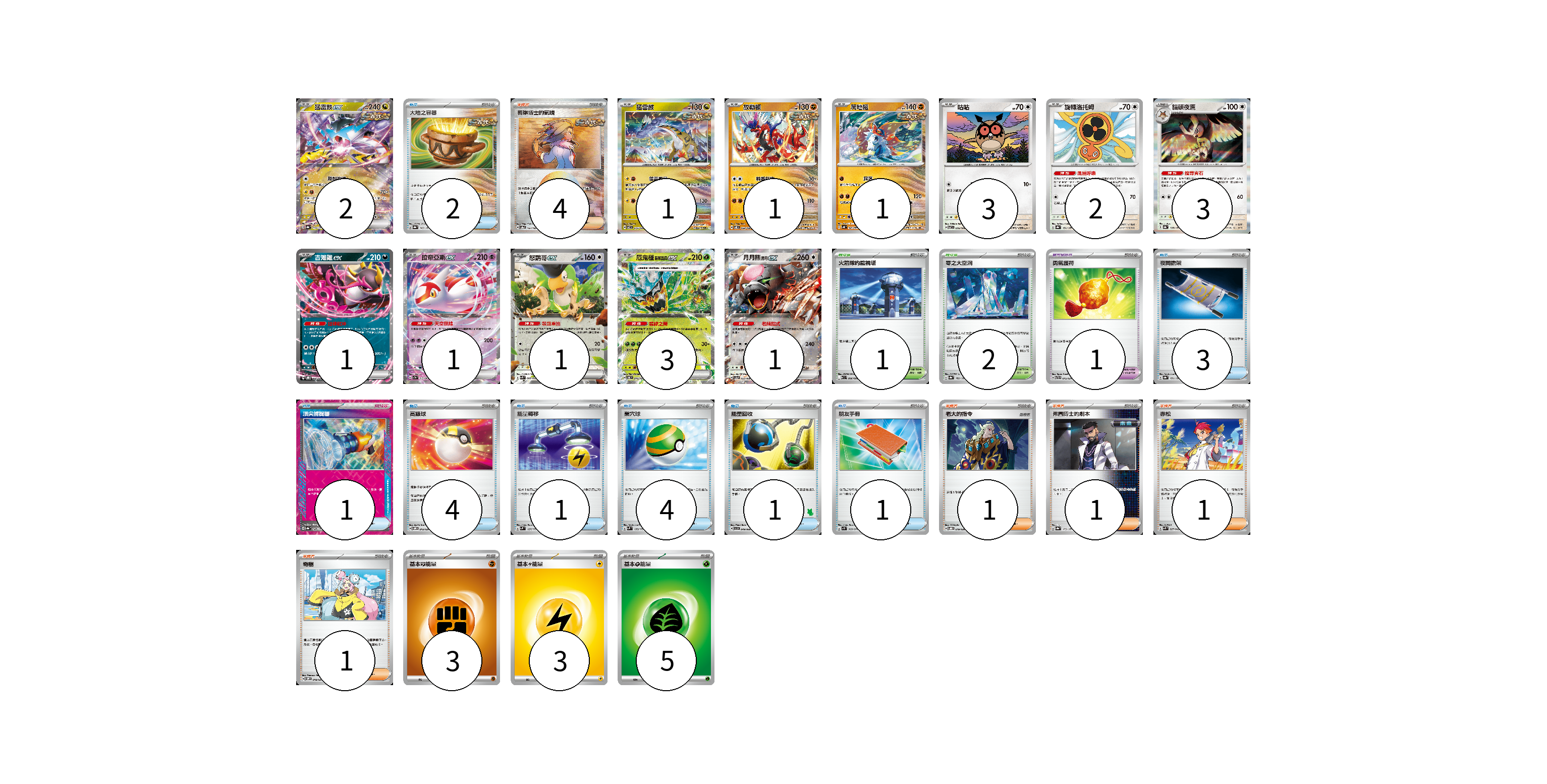 牌組構築方案 以此牌組為基礎新構築牌組 顯示卡面 顯示列表 寶可夢卡(20) 2 1 1 1 3 2 3 1 1 1 3 1 寶可夢道具(1) 1 物品卡(17) 2 3 1 4 1 4 1 1 支援者卡(8) 4 1 1 1 1 競技場卡(3) 1 2 能量卡(11) 3 3 5 寶可夢卡(20) 卡牌名稱 張數 卡牌名稱 張數 猛雷鼓ex SV8a 124/187 02 猛雷鼓 SV7 075/102 01 故勒頓 SV8 069/106 01 爬地翅 SV4K 041/066 01 咕咕 SV7 076/102 03 旋轉洛托姆 SV8a 131/187 02 貓頭夜鷹 SV8a 128/187 03 吉雉雞ex SVOD 004/020 01 拉帝亞斯ex SV7a 019/064 01 怒鸚哥ex SVK 006/042 01 厄鬼椪 碧草面具ex SV6 016/101 03 月月熊 赫月 ex SV5a 052/066 01 寶可夢道具(1) 卡牌名稱 張數 卡牌名稱 張數 勇氣護符 SVTR 015/021 01 物品卡(17) 卡牌名稱 張數 卡牌名稱 張數 大地之容器 SV8a 143/187 02 夜間擔架 SV8a 151/187 03 頂尖捕捉器 SV8a 148/187 01 高級球 SVOM 013/021 04 能量轉移 SVM 127/175 01 巢穴球 SVM 133/175 04 能量回收 SVI 049/066 01 朋友手冊 SV1S 069/078 01 支援者卡(8) 卡牌名稱 張數 卡牌名稱 張數 奧琳博士的氣魄 SV8a 167/187 04 老大的指令 SVOD 019/020 01 弗圖博士的劇本 SV8a 175/187 01 赤松 SVK 027/042 01 奇樹 SVOM 018/021 01 競技場卡(3) 卡牌名稱 張數 卡牌名稱 張數 火箭隊的監視塔 SV10 096/098 01 零之大空洞 SV8a 182/187 02 能量卡(11) 卡牌名稱 張數 卡牌名稱 張數 基本【鬥】能量 SVF FIG 03 基本【雷】能量 SVF LIG 03 基本【草】能量 SVF GRA 05 以此牌組為基礎新構築牌組 牌組編碼 BQquAa-pDgUQh-WCzWrp copy 列印牌組單 牌組編碼已複製 分享至SNS