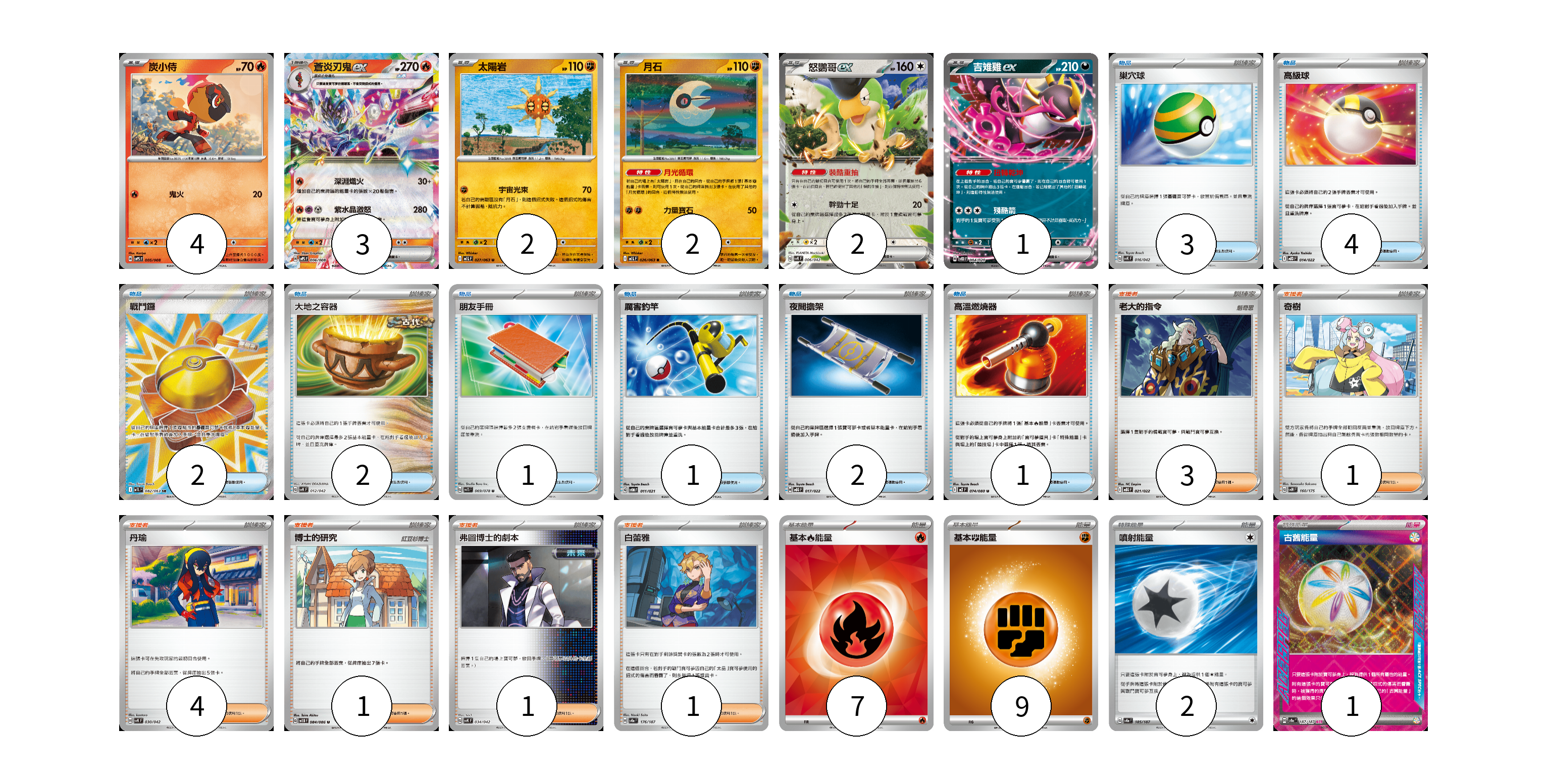 牌組構築方案 以此牌組為基礎新構築牌組 顯示卡面 顯示列表 寶可夢卡(14) 4 3 2 2 2 1 物品卡(16) 3 4 2 2 1 1 2 1 支援者卡(11) 3 1 4 1 1 1 能量卡(19) 7 9 2 1 寶可夢卡(14) 卡牌名稱 張數 卡牌名稱 張數 炭小侍 SVPS 005/008 04 蒼炎刃鬼ex SVPS 006/008 03 太陽岩 M1L 027/063 02 月石 M1L 026/063 02 怒鸚哥ex SVK 006/042 02 吉雉雞ex SVOD 004/020 01 物品卡(16) 卡牌名稱 張數 卡牌名稱 張數 巢穴球 SVK 016/042 03 高級球 MBD 014/022 04 戰鬥鑼 M1L 082/063 02 大地之容器 SVK 012/042 02 朋友手冊 SV1S 069/078 01 厲害釣竿 SVOM 011/021 01 夜間擔架 MBG 017/022 02 高溫燃燒器 M2 074/080 01 支援者卡(11) 卡牌名稱 張數 卡牌名稱 張數 老大的指令 MBG 021/022 03 奇樹 SVM 160/175 01 丹瑜 SVK 030/042 04 博士的研究 SV11B 084/086 01 弗圖博士的劇本 SVK 034/042 01 白蕾雅 SV8a 176/187 01 能量卡(19) 卡牌名稱 張數 卡牌名稱 張數 基本【火】能量 SVQL FIR 07 基本【鬥】能量 M-P FIG 09 噴射能量 SV8a 185/187 02 古舊能量 SV8a 187/187 01 以此牌組為基礎新構築牌組 牌組編碼 BUbiQH-lAxFIl-iqQgYq copy 列印牌組單 牌組編碼已複製 分享至SNS