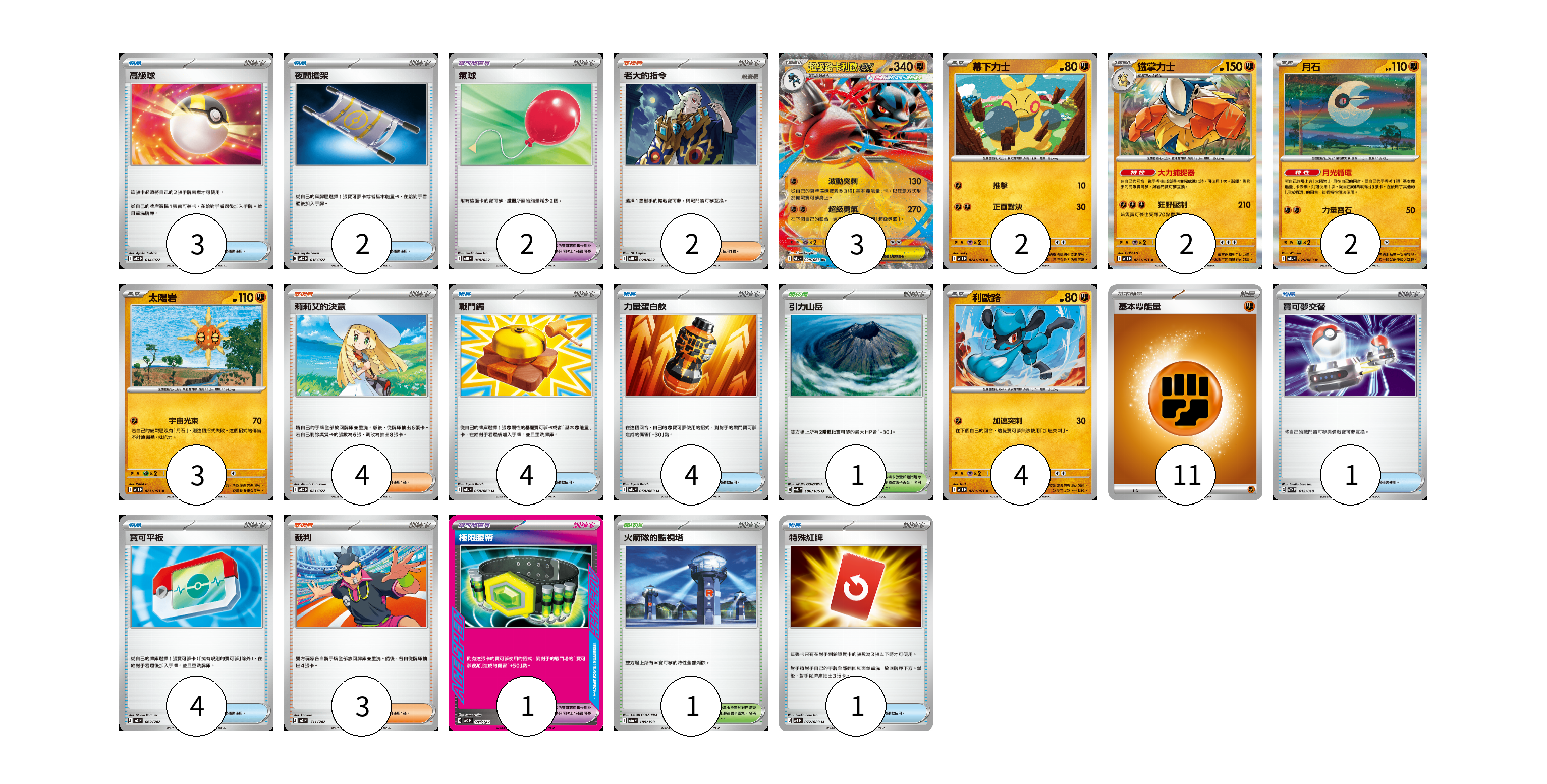 牌組構築方案 以此牌組為基礎新構築牌組 顯示卡面 顯示列表 寶可夢卡(16) 3 2 2 2 3 4 寶可夢道具(1) 1 物品卡(21) 3 2 2 4 4 1 4 1 支援者卡(9) 2 4 3 競技場卡(2) 1 1 能量卡(11) 11 寶可夢卡(16) 卡牌名稱 張數 卡牌名稱 張數 超級路卡利歐ex M1L 029/063 03 幕下力士 M1L 024/063 02 鐵掌力士 M1L 025/063 02 月石 M1L 026/063 02 太陽岩 M1L 027/063 03 利歐路 M1L 028/063 04 寶可夢道具(1) 卡牌名稱 張數 卡牌名稱 張數 極限腰帶 MC 691/742 01 物品卡(21) 卡牌名稱 張數 卡牌名稱 張數 高級球 MBD 014/022 03 夜間擔架 MBD 016/022 02 氣球 MBD 018/022 02 戰鬥鑼 M1L 059/063 04 力量蛋白飲 M1L 058/063 04 寶可夢交替 SVTH 012/018 01 寶可平板 MC 662/742 04 特殊紅牌 M4 072/083 01 支援者卡(9) 卡牌名稱 張數 卡牌名稱 張數 老大的指令 MBD 020/022 02 莉莉艾的決意 MBD 021/022 04 裁判 MC 711/742 03 競技場卡(2) 卡牌名稱 張數 卡牌名稱 張數 引力山岳 SV8 106/106 01 火箭隊的監視塔 M2a 189/193 01 能量卡(11) 卡牌名稱 張數 卡牌名稱 張數 基本【鬥】能量 M-P FIG 11 以此牌組為基礎新構築牌組 牌組編碼 BXeucJ-lzMKbB-VcYrIh copy 列印牌組單 牌組編碼已複製 分享至SNS