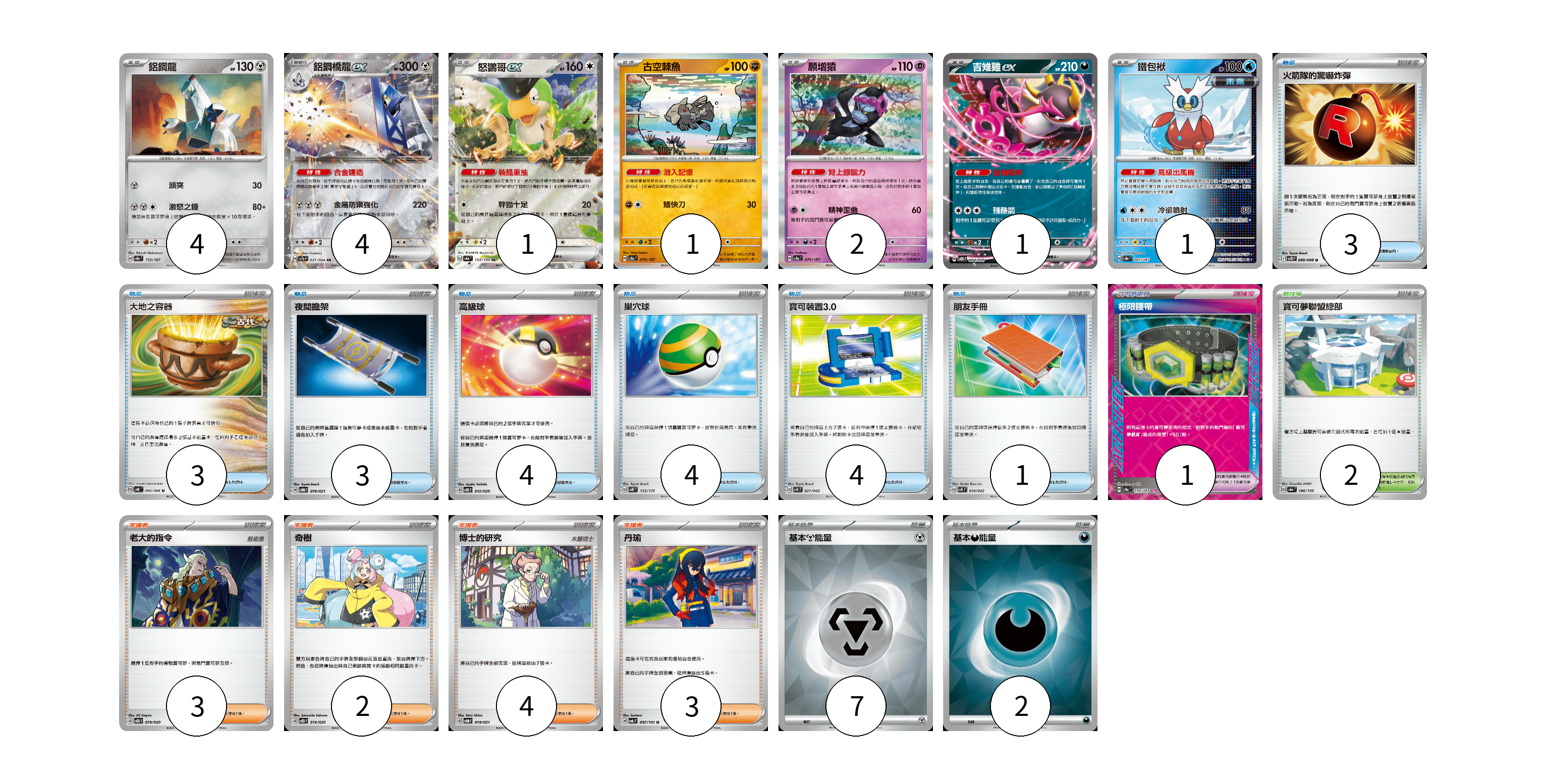 牌組構築方案 以此牌組為基礎新構築牌組 顯示卡面 顯示列表 寶可夢卡(14) 4 4 1 1 2 1 1 寶可夢道具(1) 1 物品卡(22) 3 3 3 4 4 4 1 支援者卡(12) 3 2 4 3 競技場卡(2) 2 能量卡(9) 7 2 寶可夢卡(14) 卡牌名稱 張數 卡牌名稱 張數 鋁鋼龍 SV8a 112/187 04 鋁鋼橋龍ex SV7a 037/064 04 怒鸚哥ex SV4a 154/190 01 古空棘魚 SV8a 079/187 01 願增猿 SV8a 075/187 02 吉雉雞ex SVOD 004/020 01 鐵包袱 SV8a 047/187 01 寶可夢道具(1) 卡牌名稱 張數 卡牌名稱 張數 極限腰帶 SV8a 159/187 01 物品卡(22) 卡牌名稱 張數 卡牌名稱 張數 火箭隊的驚嚇炸彈 SV10 089/098 03 大地之容器 SV4K 060/066 03 夜間擔架 SVOM 016/021 03 高級球 SVOD 012/020 04 巢穴球 SVM 133/175 04 寶可裝置3.0 SVK 021/042 04 朋友手冊 SVK 014/042 01 支援者卡(12) 卡牌名稱 張數 卡牌名稱 張數 老大的指令 SVOD 019/020 03 奇樹 SVOD 016/020 02 博士的研究 SVOM 019/021 04 丹瑜 SV6 097/101 03 競技場卡(2) 卡牌名稱 張數 卡牌名稱 張數 寶可夢聯盟總部 SV4a 186/190 02 能量卡(9) 卡牌名稱 張數 卡牌名稱 張數 基本【鋼】能量 SVOD MET 07 基本【惡】能量 SVOM DAR 02 以此牌組為基礎新構築牌組 牌組編碼 BbpCgU-tuTOxS-MVDArB copy 列印牌組單 牌組編碼已複製 分享至SNS