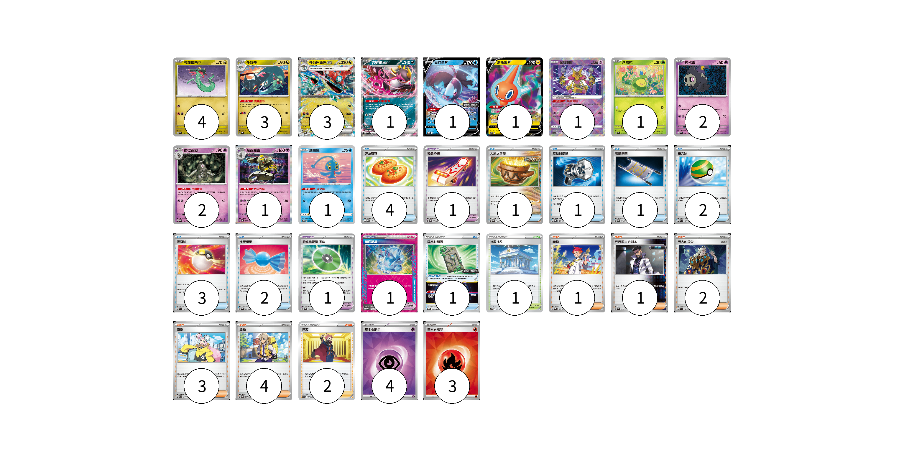 牌組構築方案 以此牌組為基礎新構築牌組 顯示卡面 顯示列表 寶可夢卡(21) 4 3 3 1 1 1 1 1 2 2 1 1 寶可夢道具(4) 1 1 1 1 物品卡(14) 4 1 1 1 2 3 2 支援者卡(13) 1 1 2 3 4 2 競技場卡(1) 1 能量卡(7) 4 3 寶可夢卡(21) 卡牌名稱 張數 卡牌名稱 張數 多龍梅西亞 SV8a 118/187 04 多龍奇 SV8a 119/187 03 多龍巴魯托ex SV8a 120/187 03 吉雉雞ex SV8a 104/187 01 霓虹魚V SV-P 134/SV-P 01 洛托姆V S11 037/100 01 光輝胡地 S11a 031/068 01 含羞苞 SV8a 001/187 01 夜巡靈 SV8a 064/187 02 彷徨夜靈 SV8a 065/187 02 黑夜魔靈 SV8a 066/187 01 瑪納霏 S9 031/100 01 寶可夢道具(4) 卡牌名稱 張數 卡牌名稱 張數 緊急滑板 SV8a 153/187 01 招式學習器 演進 SV8a 160/187 01 璀璨結晶 SV8a 152/187 01 森林封印石 SV-P 141/SV-P 01 物品卡(14) 卡牌名稱 張數 卡牌名稱 張數 好友寶芬 SV8a 147/187 04 大地之容器 SV8a 143/187 01 反擊捕捉器 SV8a 139/187 01 夜間擔架 SV8a 151/187 01 巢穴球 SVK 016/042 02 高級球 SVK 018/042 03 神奇糖果 SVK 019/042 02 支援者卡(13) 卡牌名稱 張數 卡牌名稱 張數 赤松 SV8a 163/187 01 弗圖博士的劇本 SV8a 175/187 01 老大的指令 SVM 172/175 02 奇樹 SVK 031/042 03 派帕 SVK 035/042 04 阿渡 S12 096/098 02 競技場卡(1) 卡牌名稱 張數 卡牌名稱 張數 神奧神殿 S12a 169/172 01 能量卡(7) 卡牌名稱 張數 卡牌名稱 張數 基本【超】能量 SVM PSY 04 基本【火】能量 SVM FIR 03 以此牌組為基礎新構築牌組 牌組編碼 BgyZuL-XtGBGd-etPHHh copy 列印牌組單 牌組編碼已複製 分享至SNS