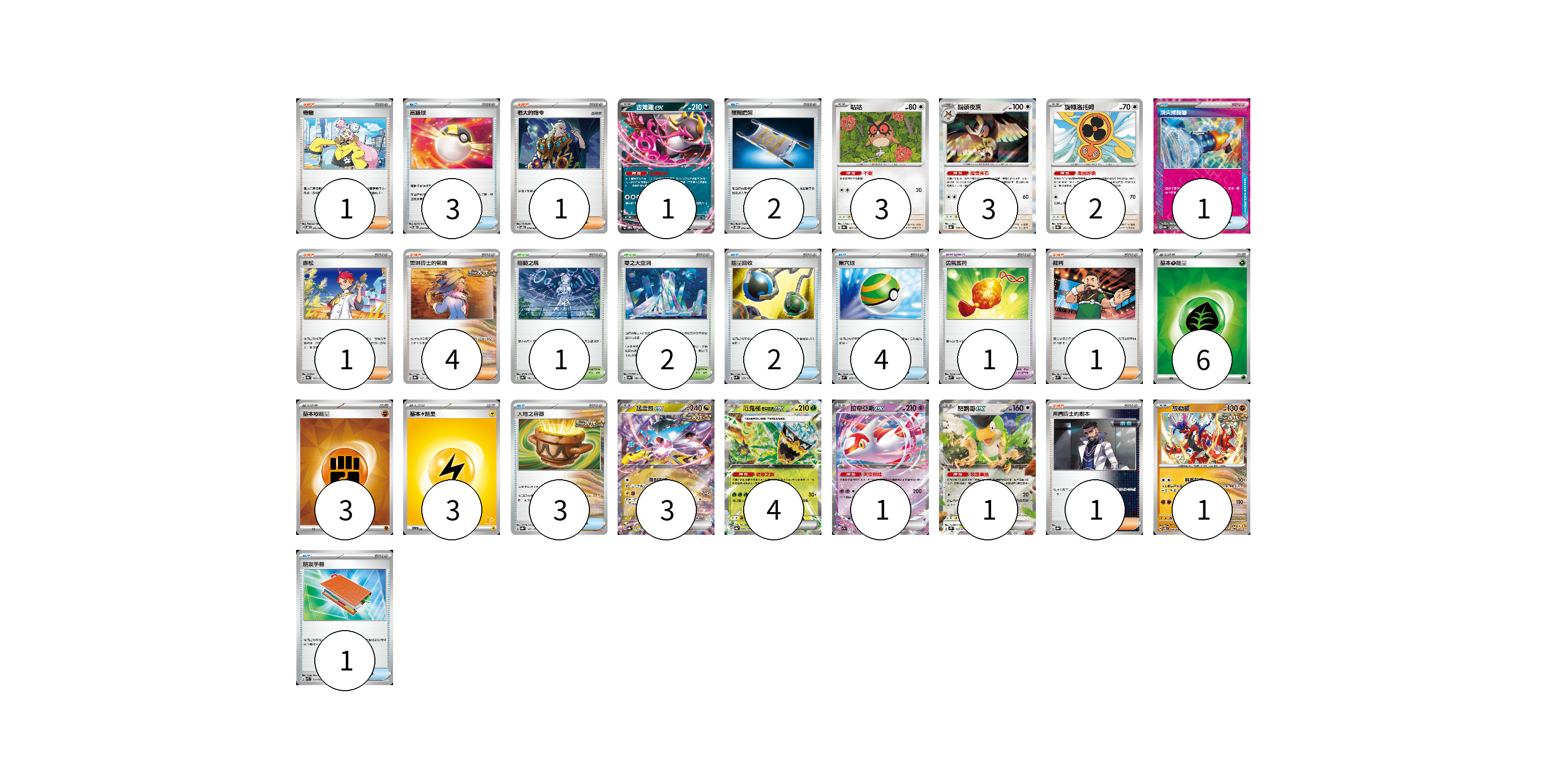 牌組構築方案 以此牌組為基礎新構築牌組 顯示卡面 顯示列表 寶可夢卡(19) 1 3 3 2 3 4 1 1 1 寶可夢道具(1) 1 物品卡(16) 3 2 1 2 4 3 1 支援者卡(9) 1 1 1 4 1 1 競技場卡(3) 1 2 能量卡(12) 6 3 3 寶可夢卡(19) 卡牌名稱 張數 卡牌名稱 張數 吉雉雞ex SVOM 009/021 01 咕咕 SV8a 127/187 03 貓頭夜鷹 SV8a 128/187 03 旋轉洛托姆 SV8a 131/187 02 猛雷鼓ex SV8a 124/187 03 厄鬼椪 碧草面具ex SV8a 020/187 04 拉帝亞斯ex SV7a 019/064 01 怒鸚哥ex SV2P 065/071 01 故勒頓 SV8 069/106 01 寶可夢道具(1) 卡牌名稱 張數 卡牌名稱 張數 勇氣護符 SVM 142/175 01 物品卡(16) 卡牌名稱 張數 卡牌名稱 張數 高級球 SVOD 012/020 03 夜間擔架 SVOM 016/021 02 頂尖捕捉器 SV8a 148/187 01 能量回收 SVM 125/175 02 巢穴球 SVM 133/175 04 大地之容器 SV8a 143/187 03 朋友手冊 SVK 014/042 01 支援者卡(9) 卡牌名稱 張數 卡牌名稱 張數 奇樹 SVOD 016/020 01 老大的指令 SVOD 019/020 01 赤松 SV8a 163/187 01 奧琳博士的氣魄 SV8a 167/187 04 裁判 SVM 154/175 01 弗圖博士的劇本 SV8a 175/187 01 競技場卡(3) 卡牌名稱 張數 卡牌名稱 張數 阻礙之塔 SV8a 181/187 01 零之大空洞 SV8a 182/187 02 能量卡(12) 卡牌名稱 張數 卡牌名稱 張數 基本【草】能量 SVK GRA 06 基本【鬥】能量 SVK FIG 03 基本【雷】能量 SVI LIG 03 以此牌組為基礎新構築牌組 牌組編碼 BhtrZj-pjKIIe-vtnMab copy 列印牌組單 牌組編碼已複製 分享至SNS