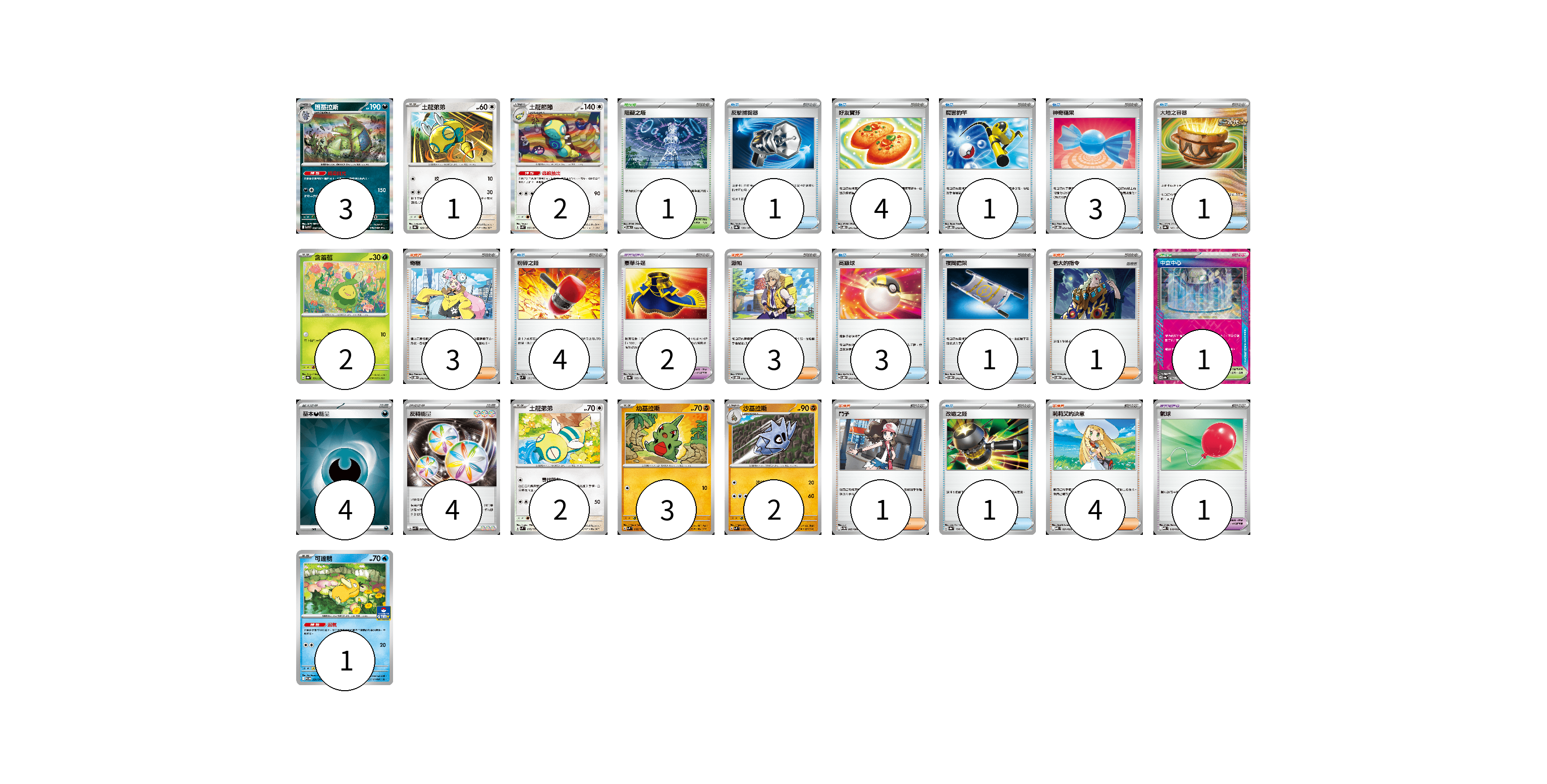 牌組構築方案 以此牌組為基礎新構築牌組 顯示卡面 顯示列表 寶可夢卡(16) 3 1 2 2 2 3 2 1 寶可夢道具(2) 2 物品卡(20) 1 4 1 3 1 4 3 1 1 1 支援者卡(12) 3 3 1 1 4 競技場卡(2) 1 1 能量卡(8) 4 4 寶可夢卡(16) 卡牌名稱 張數 卡牌名稱 張數 班基拉斯 SV9 058/100 03 土龍弟弟 SV8a 129/187 01 土龍節節 SV5K 057/071 02 含羞苞 SV8a 001/187 02 土龍弟弟 SVM 095/175 02 幼基拉斯 SVM 062/175 03 沙基拉斯 SVM 063/175 02 可達鴨 SV-P 220/SV-P 01 寶可夢道具(2) 卡牌名稱 張數 卡牌名稱 張數 豪華斗篷 SV8a 155/187 02 物品卡(20) 卡牌名稱 張數 卡牌名稱 張數 反擊捕捉器 SV8a 139/187 01 好友寶芬 SVOD 011/020 04 厲害釣竿 SVOD 010/020 01 神奇糖果 SVOD 013/020 03 大地之容器 SV8a 143/187 01 粉碎之錘 SVM 131/175 04 高級球 SVOD 012/020 03 夜間擔架 SVOM 016/021 01 改造之錘 SV8a 138/187 01 氣球 MBD 018/022 01 支援者卡(12) 卡牌名稱 張數 卡牌名稱 張數 奇樹 SVOD 016/020 03 派帕 SVOD 018/020 03 老大的指令 SVOD 019/020 01 鬥子 SV11W 085/086 01 莉莉艾的決意 MBD 021/022 04 競技場卡(2) 卡牌名稱 張數 卡牌名稱 張數 阻礙之塔 SV6 100/101 01 中立中心 SV8a 184/187 01 能量卡(8) 卡牌名稱 張數 卡牌名稱 張數 基本【惡】能量 SVOM DAR 04 反轉能量 SVK 041/042 04 以此牌組為基礎新構築牌組 牌組編碼 Bkipgv-wFwIlC-WoXaBH copy 列印牌組單 牌組編碼已複製 分享至SNS