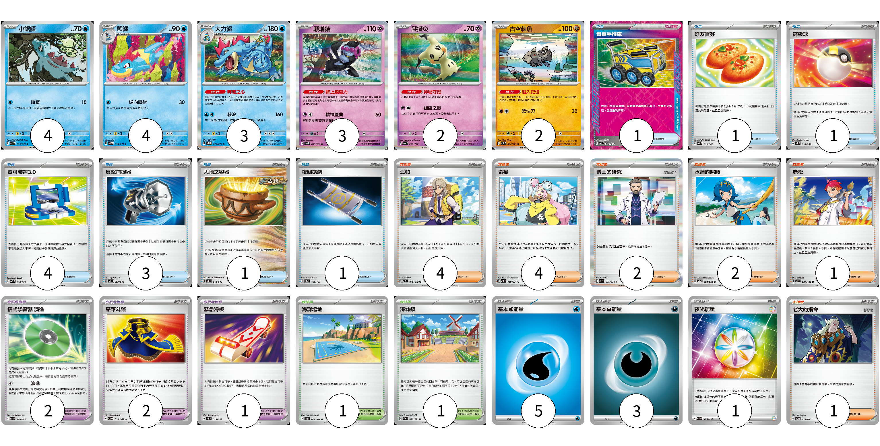 牌組構築方案 以此牌組為基礎新構築牌組 顯示卡面 顯示列表 寶可夢卡(18) 4 4 3 3 2 2 寶可夢道具(5) 2 2 1 物品卡(12) 1 1 1 4 3 1 1 支援者卡(14) 4 4 2 2 1 1 競技場卡(2) 1 1 能量卡(9) 5 3 1 寶可夢卡(18) 卡牌名稱 張數 卡牌名稱 張數 小鋸鱷 SV5K 013/071 04 藍鱷 SV5K 014/071 04 大力鱷 SV5K 015/071 03 願增猿 SV6 055/101 03 謎擬Q SV4a 088/190 02 古空棘魚 SV5K 034/071 02 寶可夢道具(5) 卡牌名稱 張數 卡牌名稱 張數 招式學習器 演進 SV8a 160/187 02 豪華斗篷 SV3a 055/062 02 緊急滑板 SVK 023/042 01 物品卡(12) 卡牌名稱 張數 卡牌名稱 張數 貴重手推車 SVK 020/042 01 好友寶芬 SVK 015/042 01 高級球 SVK 018/042 01 寶可裝置3.0 SVTL 014/021 04 反擊捕捉器 SVK 009/042 03 大地之容器 SVK 012/042 01 夜間擔架 SV8a 151/187 01 支援者卡(14) 卡牌名稱 張數 卡牌名稱 張數 派帕 SV1V 076/078 04 奇樹 SV2D 069/071 04 博士的研究(弗圖博士) SV1V 075/078 02 水蓮的照顧 SV5a 064/066 02 赤松 SV7 097/102 01 老大的指令 SVOD 019/020 01 競技場卡(2) 卡牌名稱 張數 卡牌名稱 張數 海灘場地 SV1S 078/078 01 深缽鎮 SV1a 070/073 01 能量卡(9) 卡牌名稱 張數 卡牌名稱 張數 基本【水】能量 SVF WAT 05 基本【惡】能量 SVF DAR 03 夜光能量 SV4a 190/190 01 以此牌組為基礎新構築牌組 牌組編碼 BlwkUN-klLRvV-qBaWUg copy 列印牌組單 牌組編碼已複製 分享至SNS