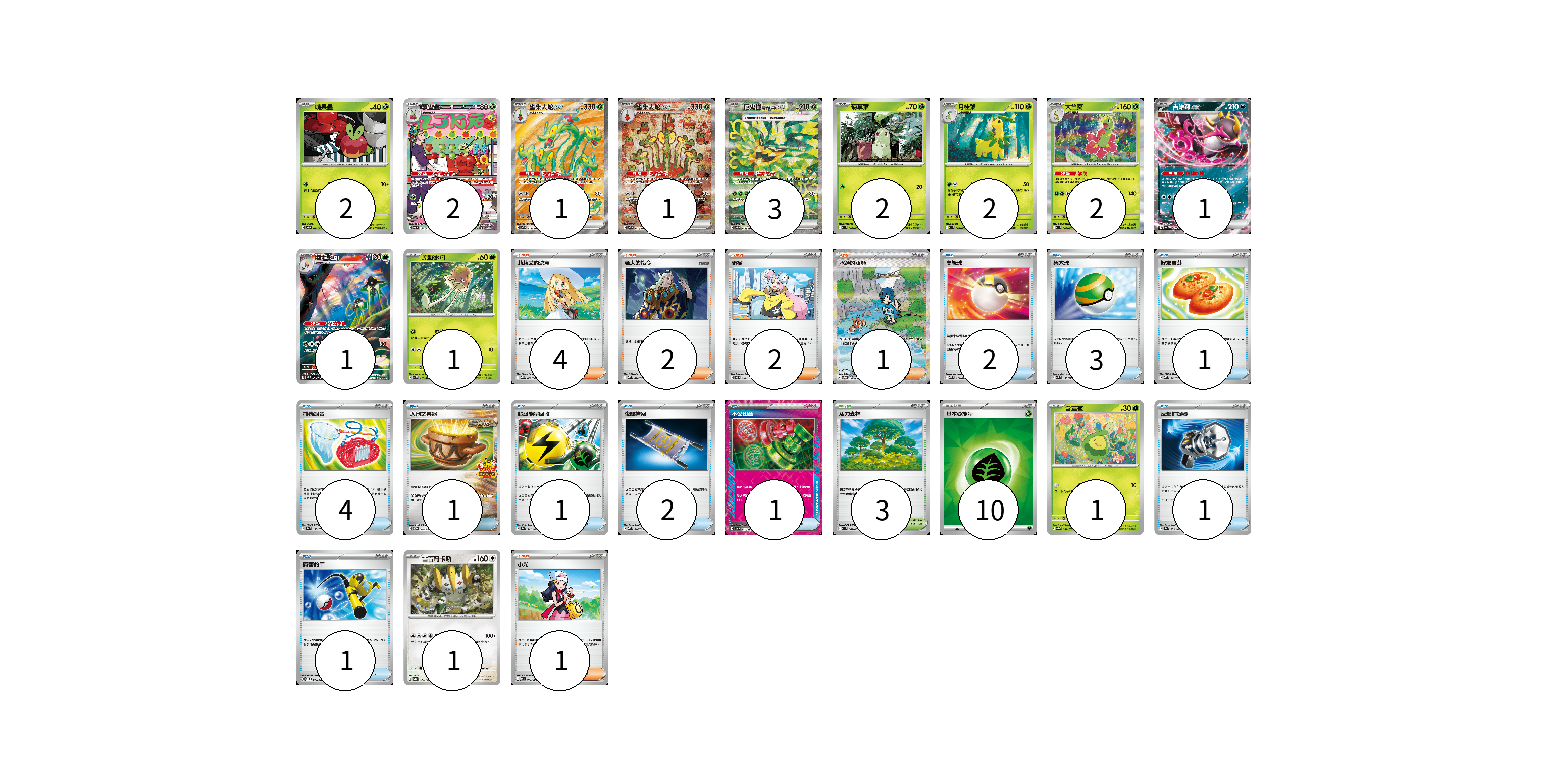 牌組構築方案 以此牌組為基礎新構築牌組 顯示卡面 顯示列表 寶可夢卡(20) 2 2 1 1 3 2 2 2 1 1 1 1 1 物品卡(17) 2 3 1 4 1 1 2 1 1 1 支援者卡(10) 4 2 2 1 1 競技場卡(3) 3 能量卡(10) 10 寶可夢卡(20) 卡牌名稱 張數 卡牌名稱 張數 啃果蟲 SV6 011/101 02 裹蜜蟲 SV6 103/101 02 蜜集大蛇ex SV7 115/102 01 蜜集大蛇ex SV7 127/102 01 厄鬼椪 碧草面具ex SV6 125/101 03 菊草葉 M1S 003/063 02 月桂葉 M1S 004/063 02 大竺葵 M1S 005/063 02 吉雉雞ex SV6a 038/064 01 陸地水母 SV4M 068/066 01 原野水母 SV1V 010/078 01 含羞苞 SV8a 001/187 01 雷吉奇卡斯 SV8a 132/187 01 物品卡(17) 卡牌名稱 張數 卡牌名稱 張數 高級球 MBD 014/022 02 巢穴球 SVM 133/175 03 好友寶芬 MBD 013/022 01 捕蟲組合 SV8a 150/187 04 大地之容器 SV-P 084/SV-P 01 超級能量回收 SV8a 141/187 01 夜間擔架 MBD 016/022 02 不公印章 SV5a 053/066 01 反擊捕捉器 SV8a 139/187 01 厲害釣竿 SVOD 010/020 01 支援者卡(10) 卡牌名稱 張數 卡牌名稱 張數 莉莉艾的決意 M1L 062/063 04 老大的指令 MBD 020/022 02 奇樹 SVOD 016/020 02 水蓮的照顧 SV5a 093/066 01 小光 M2 077/080 01 競技場卡(3) 卡牌名稱 張數 卡牌名稱 張數 活力森林 M1S 061/063 03 能量卡(10) 卡牌名稱 張數 卡牌名稱 張數 基本【草】能量 SVM GRA 10 以此牌組為基礎新構築牌組 牌組編碼 BrTkot-EenbTa-KPYaXa copy 列印牌組單 牌組編碼已複製 分享至SNS
