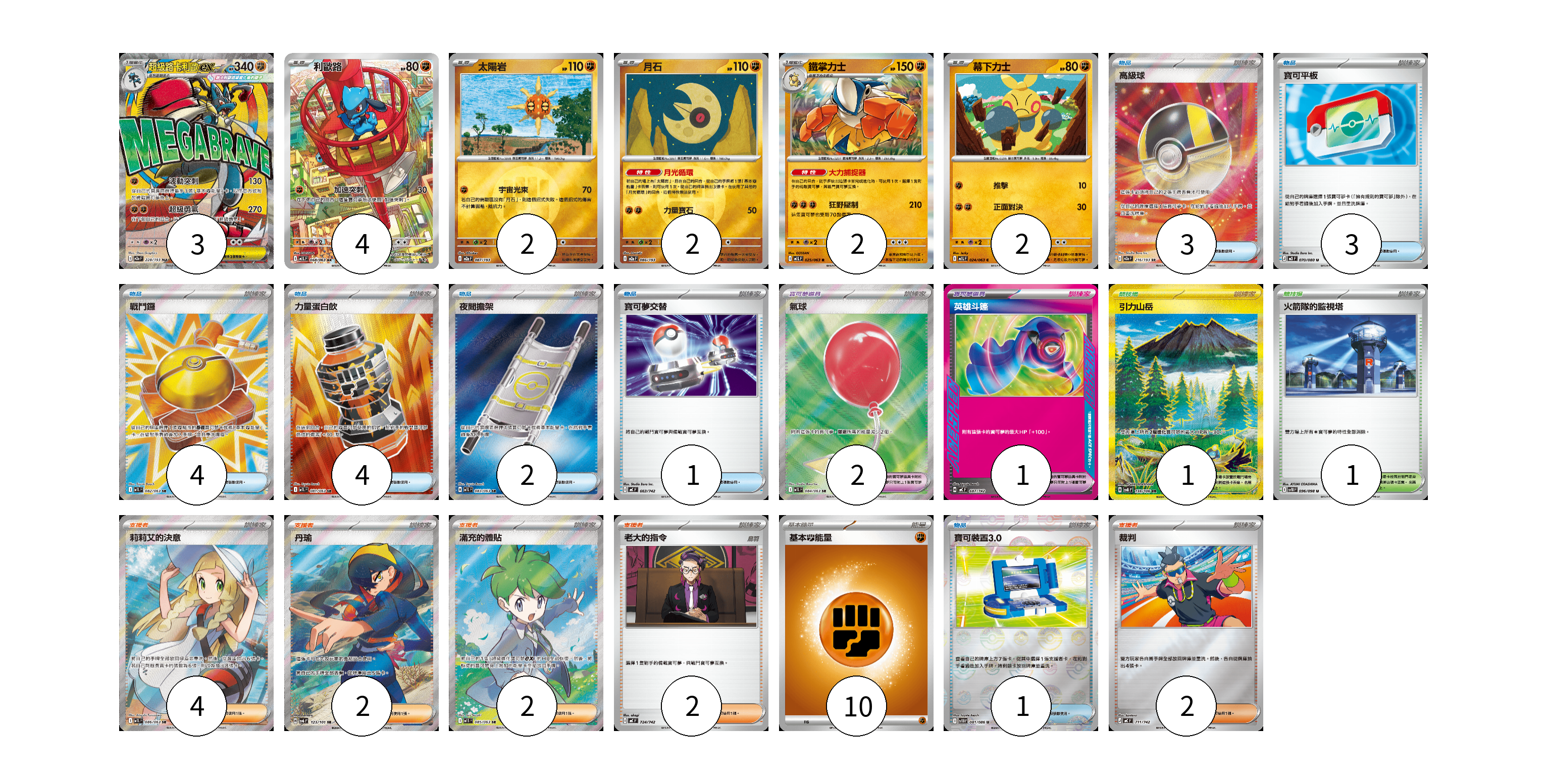牌組構築方案 以此牌組為基礎新構築牌組 顯示卡面 顯示列表 寶可夢卡(15) 3 4 2 2 2 2 寶可夢道具(3) 2 1 物品卡(18) 3 3 4 4 2 1 1 支援者卡(12) 4 2 2 2 2 競技場卡(2) 1 1 能量卡(10) 10 寶可夢卡(15) 卡牌名稱 張數 卡牌名稱 張數 超級路卡利歐ex M2a 228/193 03 利歐路 M1L 068/063 04 太陽岩 M2a 087/193 02 月石 M2a 086/193 02 鐵掌力士 M1L 025/063 02 幕下力士 M1L 024/063 02 寶可夢道具(3) 卡牌名稱 張數 卡牌名稱 張數 氣球 M1L 084/063 02 英雄斗篷 MC 687/742 01 物品卡(18) 卡牌名稱 張數 卡牌名稱 張數 高級球 M2a 216/193 03 寶可平板 M3 070/080 03 戰鬥鑼 M1L 082/063 04 力量蛋白飲 M1L 081/063 04 夜間擔架 M1L 083/063 02 寶可夢交替 MC 663/742 01 寶可裝置3.0 SV11B 081/086 01 支援者卡(12) 卡牌名稱 張數 卡牌名稱 張數 莉莉艾的決意 M1L 086/063 04 丹瑜 SV6 123/101 02 滿充的體貼 M1S 085/063 02 老大的指令 MC 724/742 02 裁判 MC 711/742 02 競技場卡(2) 卡牌名稱 張數 卡牌名稱 張數 引力山岳 SV8 138/106 01 火箭隊的監視塔 SV10 096/098 01 能量卡(10) 卡牌名稱 張數 卡牌名稱 張數 基本【鬥】能量 MC FIG 10 以此牌組為基礎新構築牌組 牌組編碼 BrsLeF-AfjYcZ-mYeiZv copy 列印牌組單 牌組編碼已複製 分享至SNS