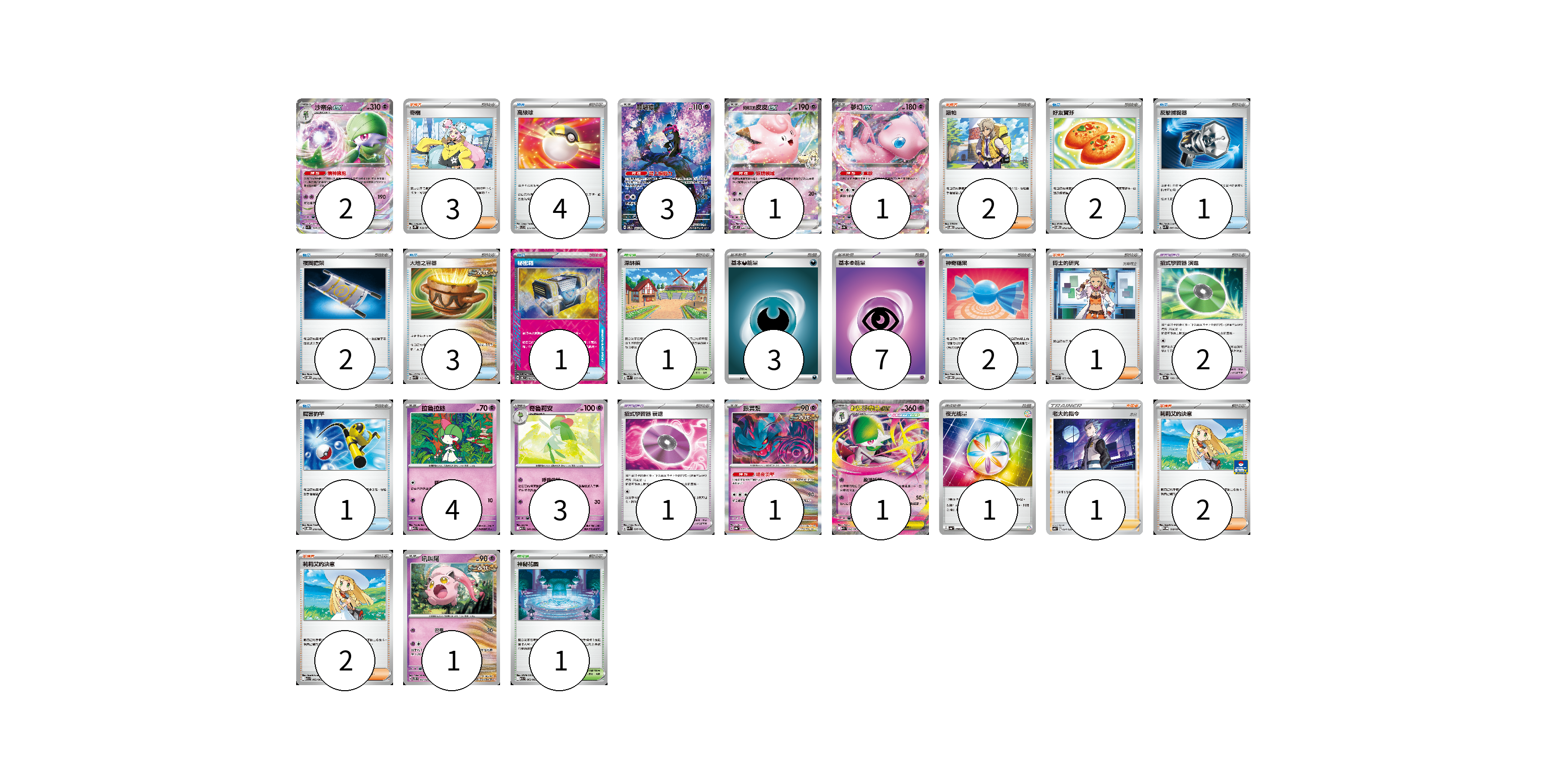牌組構築方案 以此牌組為基礎新構築牌組 顯示卡面 顯示列表 寶可夢卡(17) 2 3 1 1 4 3 1 1 1 寶可夢道具(3) 2 1 物品卡(16) 4 2 1 2 3 1 2 1 支援者卡(11) 3 2 1 1 2 2 競技場卡(2) 1 1 能量卡(11) 3 7 1 寶可夢卡(17) 卡牌名稱 張數 卡牌名稱 張數 沙奈朵ex SV1S 028/078 02 願增猿 SV6 107/101 03 莉莉艾的皮皮ex SV9 033/100 01 夢幻ex SV4a 076/190 01 拉魯拉絲 M1S 040/063 04 奇魯莉安 M1S 041/063 03 振翼髮 SV8a 072/187 01 超級沙奈朵ex M1S 042/063 01 吼叫尾 SVTS 007/022 01 寶可夢道具(3) 卡牌名稱 張數 卡牌名稱 張數 招式學習器 演進 SV8a 160/187 02 招式學習器 衰退 SVK 026/042 01 物品卡(16) 卡牌名稱 張數 卡牌名稱 張數 高級球 SVC 014/021 04 好友寶芬 SVOM 012/021 02 反擊捕捉器 SVK 009/042 01 夜間擔架 SVOM 016/021 02 大地之容器 SVK 012/042 03 秘密箱 SV6 092/101 01 神奇糖果 SVOM 014/021 02 厲害釣竿 SVOD 010/020 01 支援者卡(11) 卡牌名稱 張數 卡牌名稱 張數 奇樹 SV2D 069/071 03 派帕 SVOD 018/020 02 博士的研究 SVK 032/042 01 老大的指令(赤日) SVB 024/028 01 莉莉艾的決意 M-P 018/M-P 02 莉莉艾的決意 M1L 062/063 02 競技場卡(2) 卡牌名稱 張數 卡牌名稱 張數 深缽鎮 SVK 039/042 01 神秘花園 M1S 063/063 01 能量卡(11) 卡牌名稱 張數 卡牌名稱 張數 基本【惡】能量 SVD DAR 03 基本【超】能量 SVF PSY 07 夜光能量 SV4a 190/190 01 以此牌組為基礎新構築牌組 牌組編碼 ByFYMu-rvTBrh-RXBtom copy 列印牌組單 牌組編碼已複製 分享至SNS