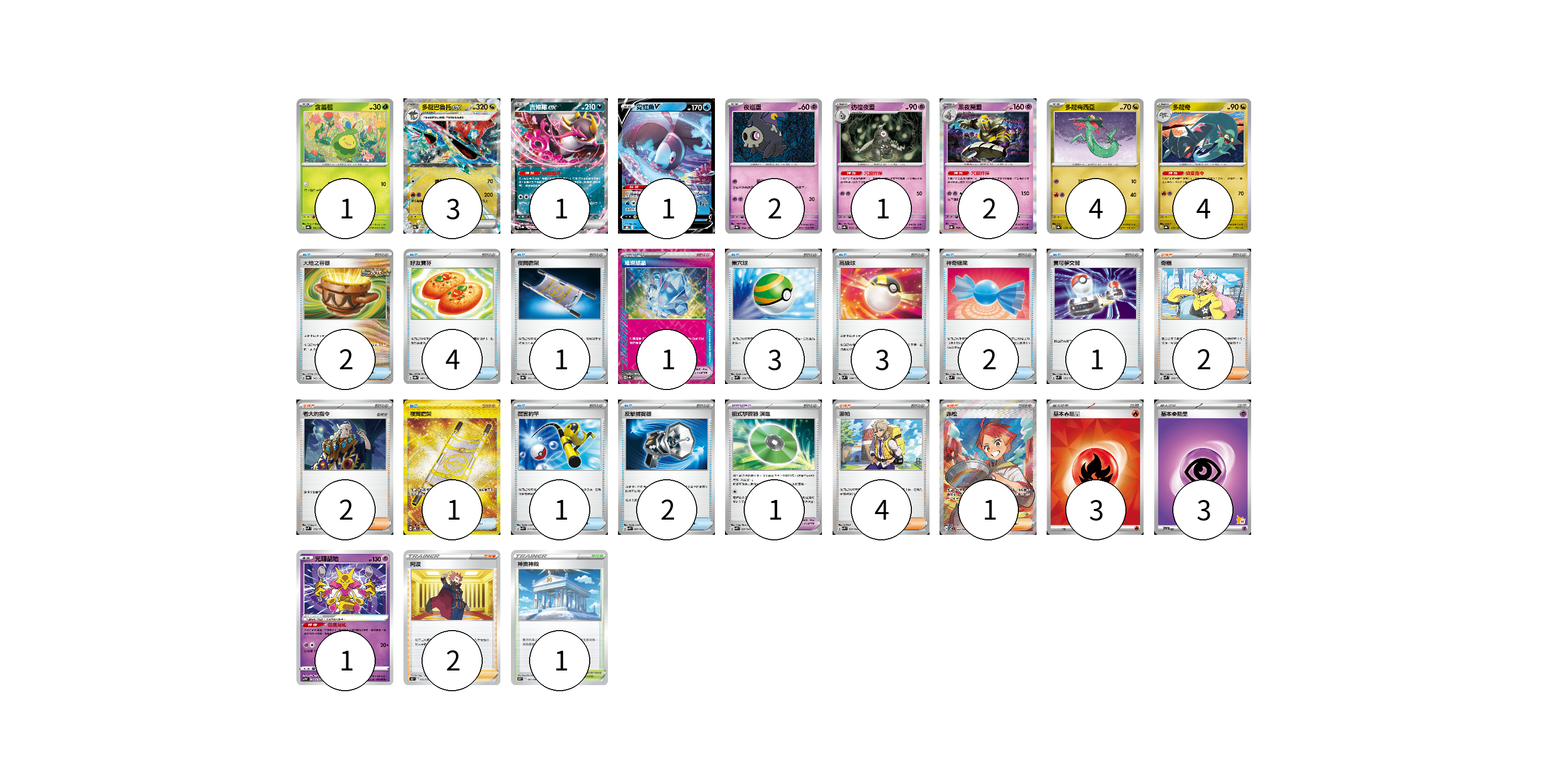 牌組構築方案 以此牌組為基礎新構築牌組 顯示卡面 顯示列表 寶可夢卡(20) 1 3 1 1 2 1 2 4 4 1 寶可夢道具(2) 1 1 物品卡(20) 2 4 1 3 3 2 1 1 1 2 支援者卡(11) 2 2 4 1 2 競技場卡(1) 1 能量卡(6) 3 3 寶可夢卡(20) 卡牌名稱 張數 卡牌名稱 張數 含羞苞 SV8a 001/187 01 多龍巴魯托ex SV8a 120/187 03 吉雉雞ex SV8a 104/187 01 霓虹魚V SVHM 001/022 01 夜巡靈 SV8a 064/187 02 彷徨夜靈 SV8a 065/187 01 黑夜魔靈 SV8a 066/187 02 多龍梅西亞 SV8a 118/187 04 多龍奇 SV8a 119/187 04 光輝胡地 SVTM 006/022 01 寶可夢道具(2) 卡牌名稱 張數 卡牌名稱 張數 璀璨結晶 SV8a 152/187 01 招式學習器 演進 SVK 025/042 01 物品卡(20) 卡牌名稱 張數 卡牌名稱 張數 大地之容器 SV8a 143/187 02 好友寶芬 SV8a 147/187 04 夜間擔架 SV8a 151/187 01 巢穴球 SVM 133/175 03 高級球 SVM 134/175 03 神奇糖果 SVM 135/175 02 寶可夢交替 SVM 136/175 01 夜間擔架 SV8 137/106 01 厲害釣竿 SVK 011/042 01 反擊捕捉器 SVK 009/042 02 支援者卡(11) 卡牌名稱 張數 卡牌名稱 張數 奇樹 SVM 160/175 02 老大的指令 SVM 172/175 02 派帕 SVK 035/042 04 赤松 SV7 123/102 01 阿渡 S12 096/098 02 競技場卡(1) 卡牌名稱 張數 卡牌名稱 張數 神奧神殿 S10P 067/067 01 能量卡(6) 卡牌名稱 張數 卡牌名稱 張數 基本【火】能量 SVK FIR 03 基本【超】能量 SVI PSY 03 以此牌組為基礎新構築牌組 牌組編碼 CAfvOi-BcAgCs-dVPHHV copy 列印牌組單 牌組編碼已複製 分享至SNS