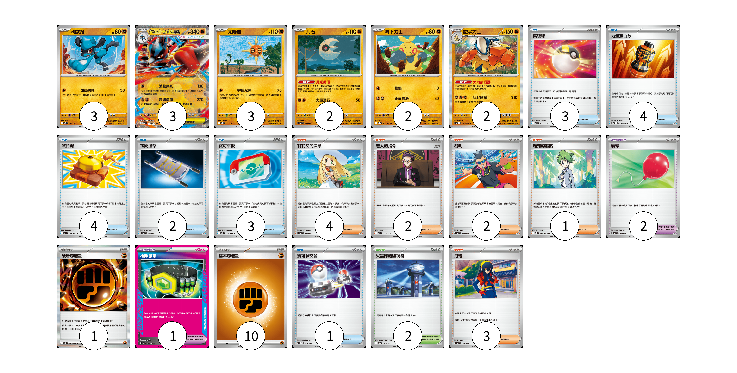 牌組構築方案 以此牌組為基礎新構築牌組 顯示卡面 顯示列表 寶可夢卡(15) 3 3 3 2 2 2 寶可夢道具(3) 2 1 物品卡(17) 3 4 4 2 3 1 支援者卡(12) 4 2 2 1 3 競技場卡(2) 2 能量卡(11) 1 10 寶可夢卡(15) 卡牌名稱 張數 卡牌名稱 張數 利歐路 M2a 091/193 03 超級路卡利歐ex M2a 092/193 03 太陽岩 MC 372/742 03 月石 MC 371/742 02 幕下力士 M1L 024/063 02 鐵掌力士 M1L 025/063 02 寶可夢道具(3) 卡牌名稱 張數 卡牌名稱 張數 氣球 MC 688/742 02 極限腰帶 MC 691/742 01 物品卡(17) 卡牌名稱 張數 卡牌名稱 張數 高級球 MC 651/742 03 力量蛋白飲 M1L 058/063 04 戰鬥鑼 M1L 059/063 04 夜間擔架 MC 670/742 02 寶可平板 M3 070/080 03 寶可夢交替 MBG 015/022 01 支援者卡(12) 卡牌名稱 張數 卡牌名稱 張數 莉莉艾的決意 MC 729/742 04 老大的指令 MC 724/742 02 裁判 MC 711/742 02 滿充的體貼 M1S 060/063 01 丹瑜 MC 715/742 03 競技場卡(2) 卡牌名稱 張數 卡牌名稱 張數 火箭隊的監視塔 M2a 189/193 02 能量卡(11) 卡牌名稱 張數 卡牌名稱 張數 硬岩【鬥】能量 M3 080/080 01 基本【鬥】能量 MC FIG 10 以此牌組為基礎新構築牌組 牌組編碼 CGyGxB-UtXwXD-YFhRGV copy 列印牌組單 牌組編碼已複製 分享至SNS