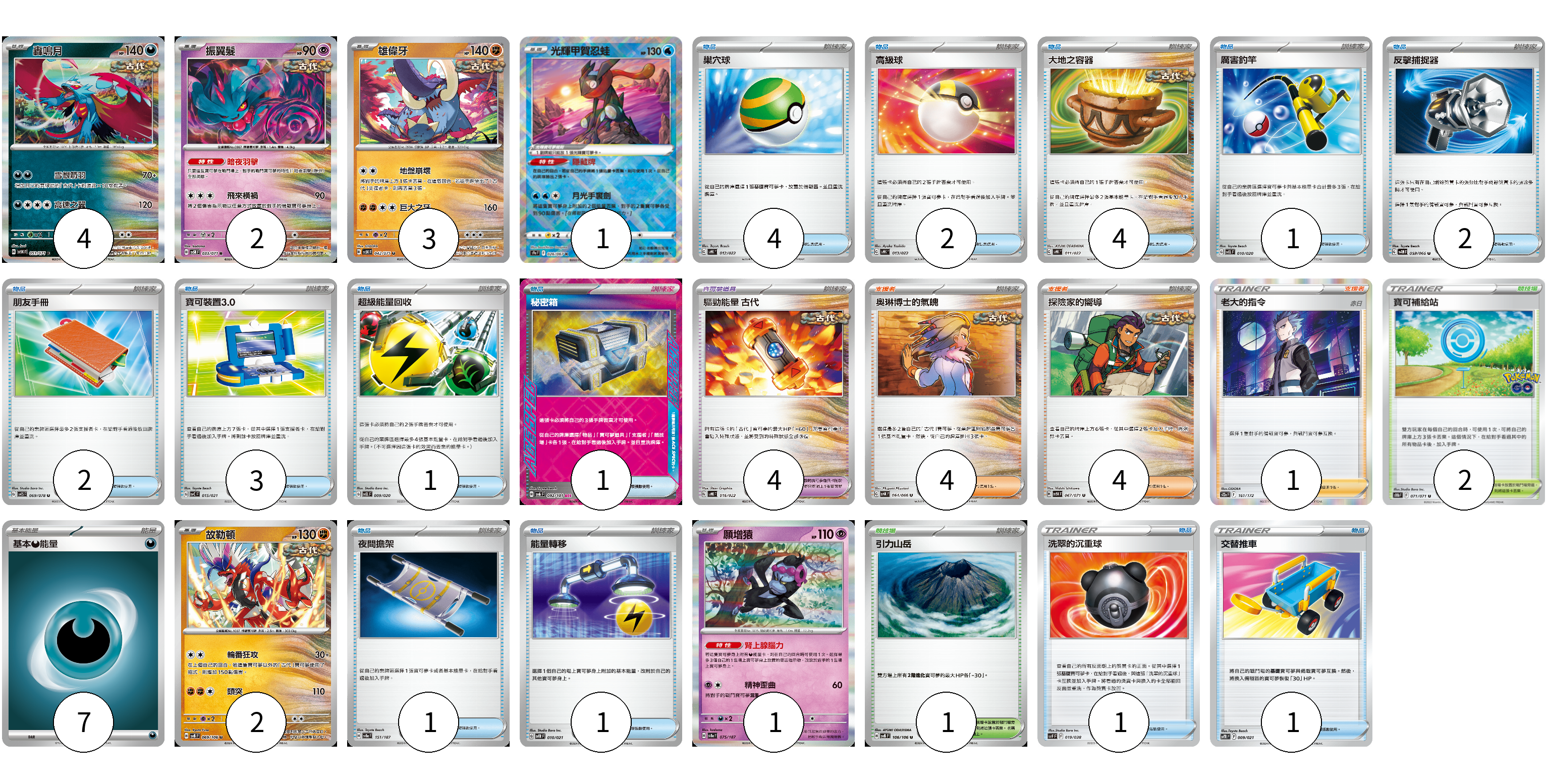 牌組構築方案 以此牌組為基礎新構築牌組 顯示卡面 顯示列表 寶可夢卡(14) 4 2 3 1 1 2 1 寶可夢道具(4) 4 物品卡(23) 4 2 4 2 2 3 1 1 1 1 1 1 支援者卡(9) 4 4 1 競技場卡(3) 2 1 能量卡(7) 7 寶可夢卡(14) 卡牌名稱 張數 卡牌名稱 張數 轟鳴月 SV5K 051/071 04 振翼髮 SV5K 033/071 02 雄偉牙 SV5K 042/071 03 光輝甲賀忍蛙 S9a 026/067 01 厲害釣竿 SVEL 010/020 01 故勒頓 SV8 069/106 02 願增猿 SV8a 075/187 01 寶可夢道具(4) 卡牌名稱 張數 卡牌名稱 張數 驅勁能量 古代 SVHK 016/022 04 物品卡(23) 卡牌名稱 張數 卡牌名稱 張數 巢穴球 SVHK 012/022 04 高級球 SVHK 013/022 02 大地之容器 SVHK 011/022 04 反擊捕捉器 SV4M 059/066 02 朋友手冊 SV1S 069/078 02 寶可裝置3.0 SVC 015/021 03 超級能量回收 SVEL 009/020 01 秘密箱 SV6 092/101 01 夜間擔架 SV8a 151/187 01 能量轉移 SVTR 010/021 01 洗翠的沉重球 SVF 019/038 01 交替推車 SVTR 009/021 01 支援者卡(9) 卡牌名稱 張數 卡牌名稱 張數 奧琳博士的氣魄 SV4K 064/066 04 探險家的嚮導 SV5K 067/071 04 老大的指令(赤日) S12a 161/172 01 競技場卡(3) 卡牌名稱 張數 卡牌名稱 張數 寶可補給站 S10b 071/071 02 引力山岳 SV8 106/106 01 能量卡(7) 卡牌名稱 張數 卡牌名稱 張數 基本惡能量 sv-p DAR 07 以此牌組為基礎新構築牌組 牌組編碼 CHJYEW-meTogh-btWkcw copy 列印牌組單 牌組編碼已複製 分享至SNS