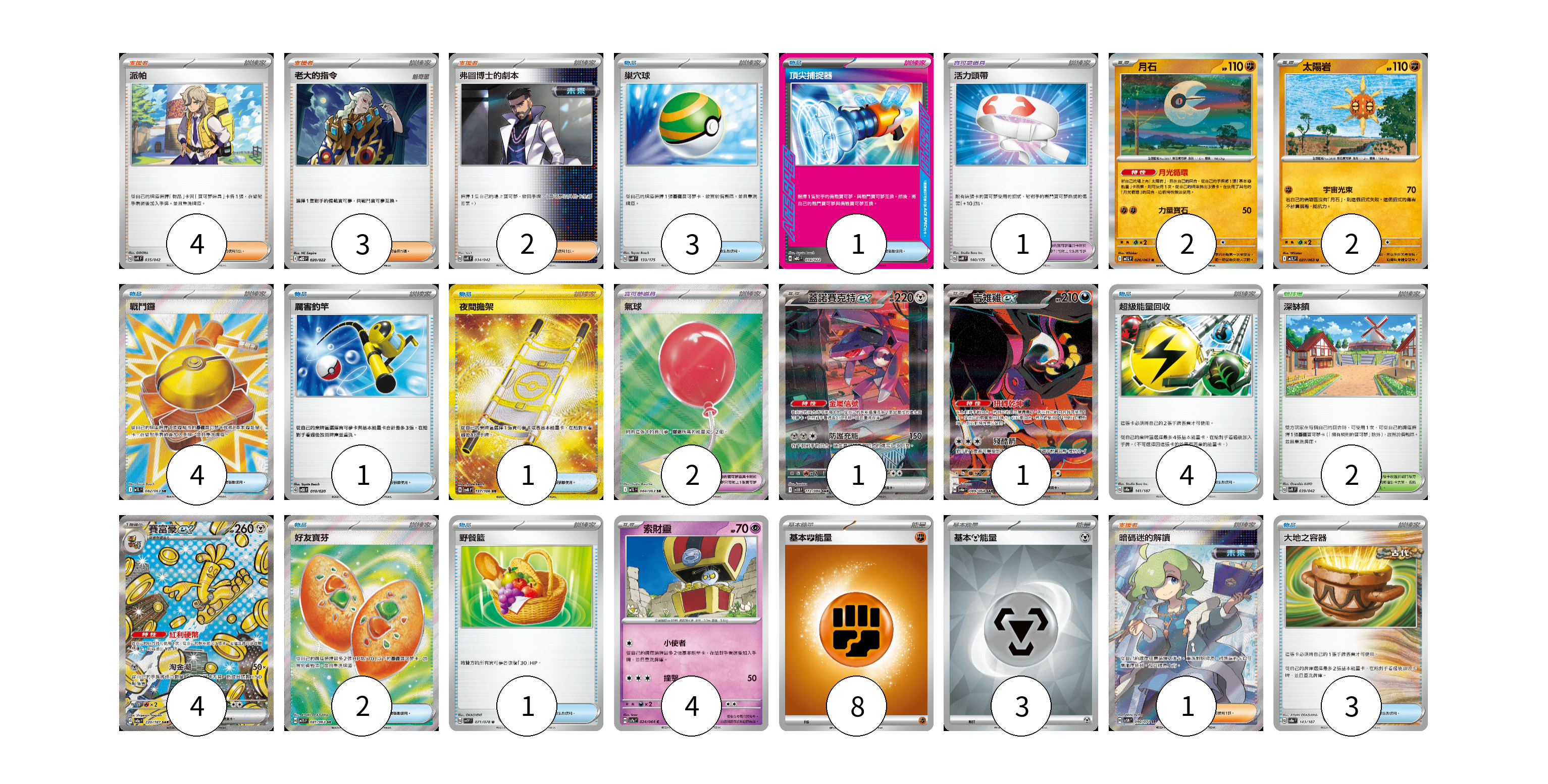 牌組構築方案 以此牌組為基礎新構築牌組 顯示卡面 顯示列表 寶可夢卡(14) 2 2 1 1 4 4 寶可夢道具(3) 1 2 物品卡(20) 3 1 4 1 1 4 2 1 3 支援者卡(10) 4 3 2 1 競技場卡(2) 2 能量卡(11) 8 3 寶可夢卡(14) 卡牌名稱 張數 卡牌名稱 張數 月石 M1L 026/063 02 太陽岩 M1L 027/063 02 蓋諾賽克特ex SV11B 172/086 01 吉雉雞ex SV6a 089/064 01 賽富豪ex SV8a 220/187 04 索財靈 SV7a 024/064 04 寶可夢道具(3) 卡牌名稱 張數 卡牌名稱 張數 活力頭帶 SVM 140/175 01 氣球 M1L 084/063 02 物品卡(20) 卡牌名稱 張數 卡牌名稱 張數 巢穴球 SVM 133/175 03 頂尖捕捉器 MBG 014/022 01 戰鬥鑼 M1L 082/063 04 厲害釣竿 SVOD 010/020 01 夜間擔架 SV8 137/106 01 超級能量回收 SV8a 141/187 04 好友寶芬 M1S 081/063 02 野餐籃 SV1V 071/078 01 大地之容器 SV8a 143/187 03 支援者卡(10) 卡牌名稱 張數 卡牌名稱 張數 派帕 SVK 035/042 04 老大的指令 MBD 020/022 03 弗圖博士的劇本 SVK 034/042 02 暗碼迷的解讀 SV5M 090/071 01 競技場卡(2) 卡牌名稱 張數 卡牌名稱 張數 深缽鎮 SVK 039/042 02 能量卡(11) 卡牌名稱 張數 卡牌名稱 張數 基本【鬥】能量 M-P FIG 08 基本【鋼】能量 SVOD MET 03 以此牌組為基礎新構築牌組 牌組編碼 CJwwwp-plysLl-dFQNHY copy 列印牌組單 牌組編碼已複製 分享至SNS