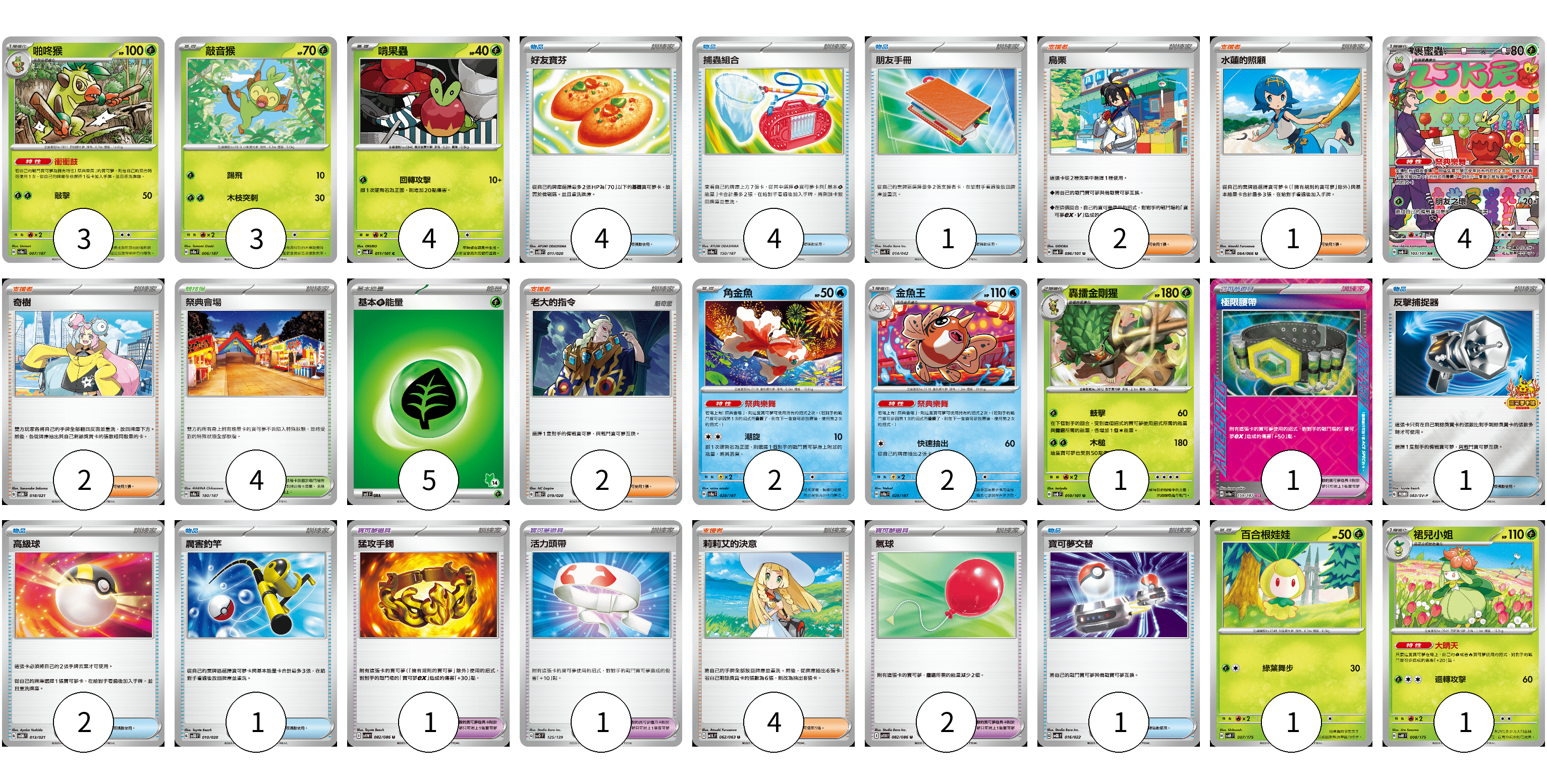 牌組構築方案 以此牌組為基礎新構築牌組 顯示卡面 顯示列表 寶可夢卡(21) 3 3 4 4 2 2 1 1 1 寶可夢道具(5) 1 1 1 2 物品卡(14) 4 4 1 1 2 1 1 支援者卡(11) 2 1 2 2 4 競技場卡(4) 4 能量卡(5) 5 寶可夢卡(21) 卡牌名稱 張數 卡牌名稱 張數 啪咚猴 SV8a 007/187 03 敲音猴 SV8a 006/187 03 啃果蟲 SV6 011/101 04 裹蜜蟲 SV6 103/101 04 角金魚 SV8a 028/187 02 金魚王 SV8a 029/187 02 轟擂金剛猩 SV6 010/101 01 百合根娃娃 SVM 007/175 01 裙兒小姐 SVM 008/175 01 寶可夢道具(5) 卡牌名稱 張數 卡牌名稱 張數 極限腰帶 SV8a 159/187 01 猛攻手鐲 SV11W 082/086 01 活力頭帶 SVD 125/139 01 氣球 SV11B 082/086 02 物品卡(14) 卡牌名稱 張數 卡牌名稱 張數 好友寶芬 SVOD 011/020 04 捕蟲組合 SV8a 150/187 04 朋友手冊 SVK 014/042 01 反擊捕捉器 SV-P 083/SV-P 01 高級球 SVOM 013/021 02 厲害釣竿 SVOD 010/020 01 寶可夢交替 SVQL 016/022 01 支援者卡(11) 卡牌名稱 張數 卡牌名稱 張數 烏栗 SV6 096/101 02 水蓮的照顧 SV5a 064/066 01 奇樹 SVOM 018/021 02 老大的指令 SVOD 019/020 02 莉莉艾的決意 M1L 062/063 04 競技場卡(4) 卡牌名稱 張數 卡牌名稱 張數 祭典會場 SV8a 180/187 04 能量卡(5) 卡牌名稱 張數 卡牌名稱 張數 基本【草】能量 SVI GRA 05 以此牌組為基礎新構築牌組 牌組編碼 CKrQxO-rNJyTJ-FJUwnn copy 列印牌組單 牌組編碼已複製 分享至SNS