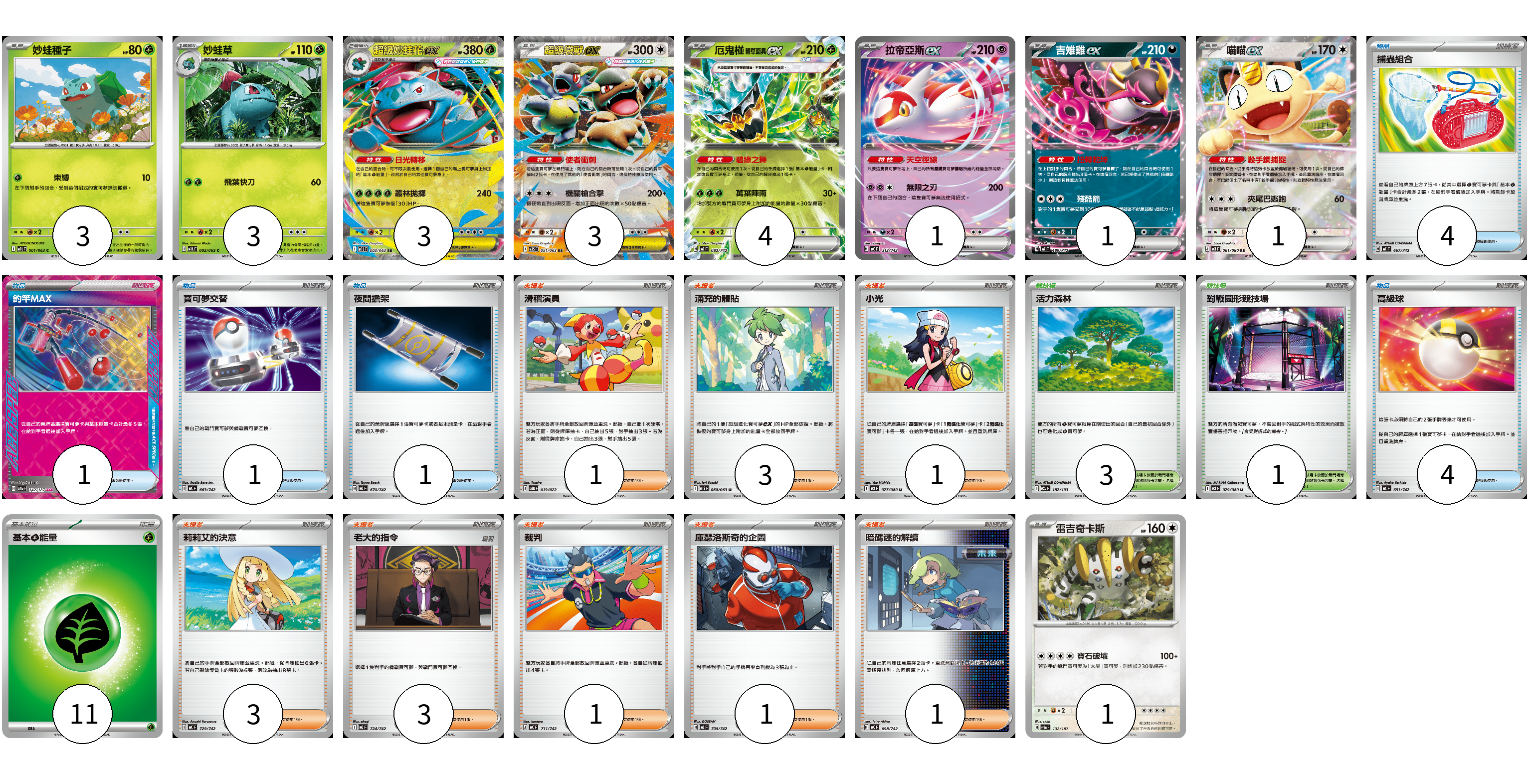 牌組構築方案 以此牌組為基礎新構築牌組 顯示卡面 顯示列表 寶可夢卡(20) 3 3 3 3 4 1 1 1 1 物品卡(11) 4 1 1 1 4 支援者卡(14) 1 3 1 3 3 1 1 1 競技場卡(4) 3 1 能量卡(11) 11 寶可夢卡(20) 卡牌名稱 張數 卡牌名稱 張數 妙蛙種子 M1L 001/063 03 妙蛙草 M1L 002/063 03 超級妙蛙花ex M1L 003/063 03 超級袋獸ex M1S 051/063 03 厄鬼椪 碧草面具ex MC 082/742 04 拉帝亞斯ex MC 312/742 01 吉雉雞ex MC 489/742 01 喵喵ex M3 061/080 01 雷吉奇卡斯 SV8a 132/187 01 物品卡(11) 卡牌名稱 張數 卡牌名稱 張數 捕蟲組合 MC 667/742 04 釣竿MAX SV8a 142/187 01 寶可夢交替 MC 663/742 01 夜間擔架 MC 670/742 01 高級球 MC 651/742 04 支援者卡(14) 卡牌名稱 張數 卡牌名稱 張數 滑稽演員 SVQL 019/022 01 滿充的體貼 M1S 060/063 03 小光 M2 077/080 01 莉莉艾的決意 MC 729/742 03 老大的指令 MC 724/742 03 裁判 MC 711/742 01 庫瑟洛斯奇的企圖 MC 705/742 01 暗碼迷的解讀 MC 698/742 01 競技場卡(4) 卡牌名稱 張數 卡牌名稱 張數 活力森林 M2a 182/193 03 對戰圓形競技場 M2 079/080 01 能量卡(11) 卡牌名稱 張數 卡牌名稱 張數 基本【草】能量 MJ GRA 11 以此牌組為基礎新構築牌組 牌組編碼 CNEMXX-kjbAUj-oRqONM copy 列印牌組單 牌組編碼已複製 分享至SNS