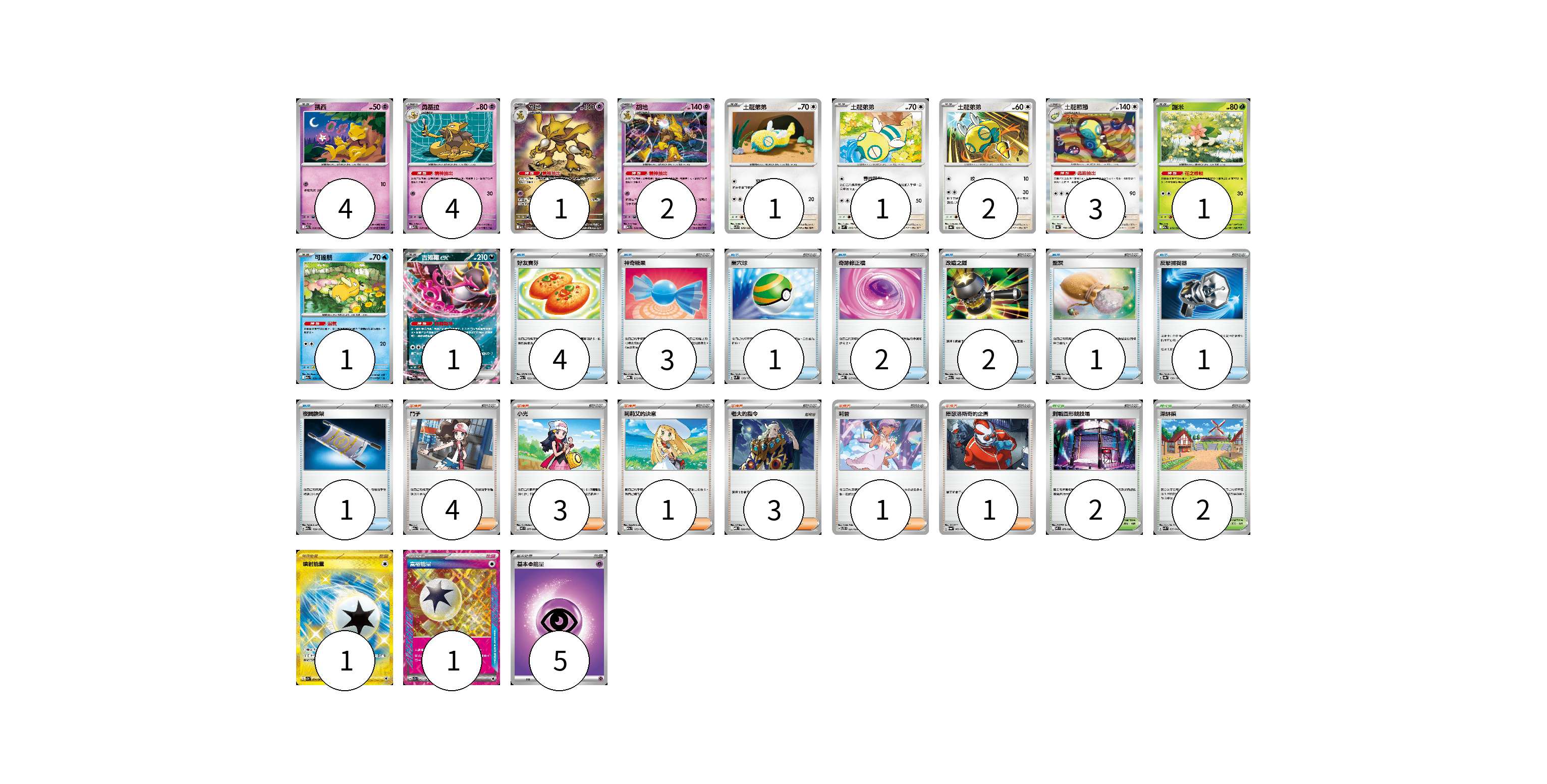 牌組構築方案 以此牌組為基礎新構築牌組 顯示卡面 顯示列表 寶可夢卡(21) 4 4 1 2 1 1 2 3 1 1 1 物品卡(15) 4 3 1 2 2 1 1 1 支援者卡(13) 4 3 1 3 1 1 競技場卡(4) 2 2 能量卡(7) 1 1 5 寶可夢卡(21) 卡牌名稱 張數 卡牌名稱 張數 凱西 M1S 036/063 04 勇基拉 M1S 037/063 04 胡地 M1S 071/063 01 胡地 M1S 038/063 02 土龍弟弟 SV9 078/100 01 土龍弟弟 SVM 095/175 01 土龍弟弟 SV8a 129/187 02 土龍節節 SV8a 130/187 03 謝米 M2a 012/193 01 可達鴨 M2a 032/193 01 吉雉雞ex M2a 114/193 01 物品卡(15) 卡牌名稱 張數 卡牌名稱 張數 好友寶芬 M2a 153/193 04 神奇糖果 MBG 013/022 03 巢穴球 SVM 133/175 01 奇跡修正檔 MBD 017/022 02 改造之錘 M2a 148/193 02 聖灰 M2a 150/193 01 反擊捕捉器 SV8a 139/187 01 夜間擔架 M2a 159/193 01 支援者卡(13) 卡牌名稱 張數 卡牌名稱 張數 鬥子 M2a 172/193 04 小光 M2 077/080 03 莉莉艾的決意 M2a 175/193 01 老大的指令 MBD 020/022 03 莉普 SVTS 021/022 01 庫瑟洛斯奇的企圖 SV6a 062/064 01 競技場卡(4) 卡牌名稱 張數 卡牌名稱 張數 對戰圓形競技場 M2 079/080 02 深缽鎮 SVK 039/042 02 能量卡(7) 卡牌名稱 張數 卡牌名稱 張數 噴射能量 SV7a 094/064 01 富裕能量 SV7a 064/064 01 基本【超】能量 MBD PSY 05 以此牌組為基礎新構築牌組 牌組編碼 CQaApS-PmOsvY-tDbijR copy 列印牌組單 牌組編碼已複製 分享至SNS