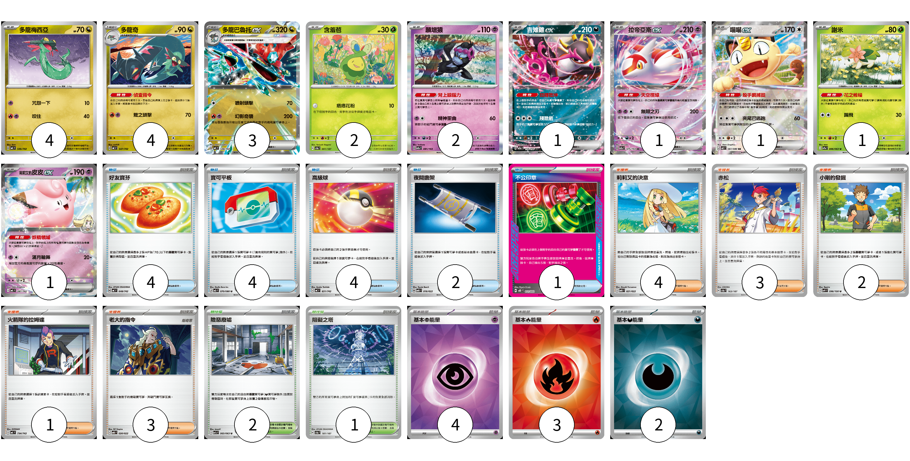 牌組構築方案 以此牌組為基礎新構築牌組 顯示卡面 顯示列表 寶可夢卡(20) 4 4 3 2 2 1 1 1 1 1 物品卡(15) 4 4 4 2 1 支援者卡(13) 4 3 2 1 3 競技場卡(3) 2 1 能量卡(9) 4 3 2 寶可夢卡(20) 卡牌名稱 張數 卡牌名稱 張數 多龍梅西亞 MC 546/742 04 多龍奇 MC 547/742 04 多龍巴魯托ex MC 548/742 03 含羞苞 SV8a 001/187 02 願增猿 M2a 081/193 02 吉雉雞ex M2a 114/193 01 拉帝亞斯ex M2a 075/193 01 喵喵ex M3 061/080 01 謝米 SV9a 006/063 01 莉莉艾的皮皮ex MC 287/742 01 物品卡(15) 卡牌名稱 張數 卡牌名稱 張數 好友寶芬 MC 648/742 04 寶可平板 M3 070/080 04 高級球 MC 651/742 04 夜間擔架 MBD 016/022 02 不公印章 MBD 011/022 01 支援者卡(13) 卡牌名稱 張數 卡牌名稱 張數 莉莉艾的決意 MBD 021/022 04 赤松 SV8a 163/187 03 小剛的發掘 SV9 096/100 02 火箭隊的拉姆達 MC 734/742 01 老大的指令 MBD 020/022 03 競技場卡(3) 卡牌名稱 張數 卡牌名稱 張數 險惡廢墟 M1L 063/063 02 阻礙之塔 SV8a 181/187 01 能量卡(9) 卡牌名稱 張數 卡牌名稱 張數 基本【超】能量 SVOD PSY 04 基本【火】能量 SVQL FIR 03 基本【惡】能量 SVOM DAR 02 以此牌組為基礎新構築牌組 牌組編碼 CRsRWq-XKZuJH-bgyYMK copy 列印牌組單 牌組編碼已複製 分享至SNS