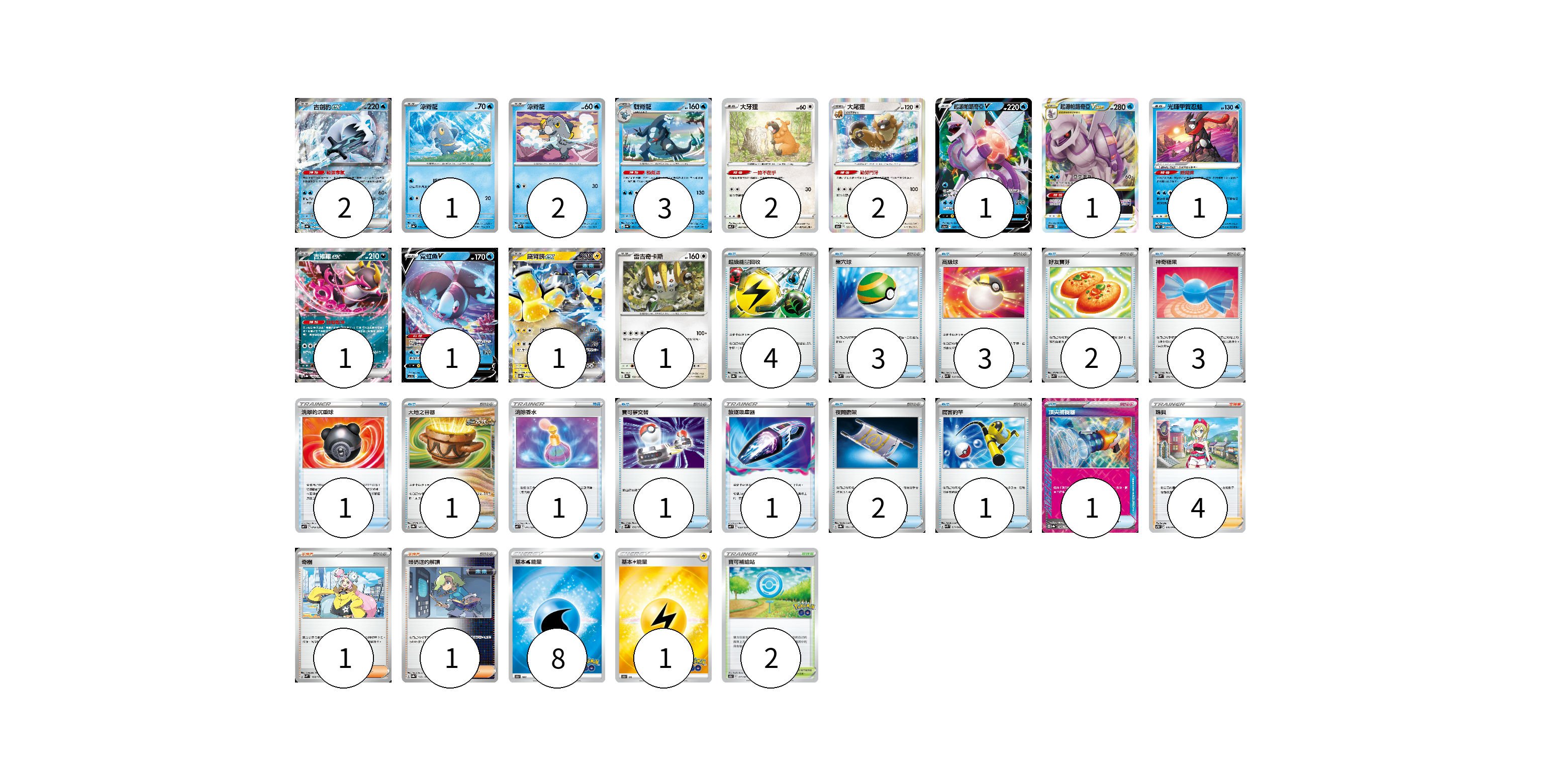 牌組構築方案 以此牌組為基礎新構築牌組 顯示卡面 顯示列表 寶可夢卡(19) 2 1 2 3 2 2 1 1 1 1 1 1 1 物品卡(24) 4 3 3 2 3 1 1 1 1 1 2 1 1 支援者卡(6) 4 1 1 競技場卡(2) 2 能量卡(9) 8 1 寶可夢卡(19) 卡牌名稱 張數 卡牌名稱 張數 古劍豹ex SV4a 054/190 02 涼脊龍 SV4a 051/190 01 涼脊龍 SV2P 024/071 02 戟脊龍 SV4a 053/190 03 大牙狸 SVTL 007/021 02 大尾狸 S12a 122/172 02 起源帕路奇亞V S12a 027/172 01 起源帕路奇亞VSTAR S10P 023/067 01 光輝甲賀忍蛙 SVTG 002/019 01 吉雉雞ex SV8a 104/187 01 霓虹魚V SVHK 004/022 01 鐵臂膀ex SV8a 054/187 01 雷吉奇卡斯 SV8a 132/187 01 物品卡(24) 卡牌名稱 張數 卡牌名稱 張數 超級能量回收 SV8a 141/187 04 巢穴球 SVM 133/175 03 高級球 SVK 018/042 03 好友寶芬 SVK 015/042 02 神奇糖果 SVM 135/175 03 洗翠的沉重球 SVF 019/038 01 大地之容器 SV8a 143/187 01 消除香水 SVF 011/038 01 寶可夢交替 SVM 136/175 01 放逐吸塵器 SVF 023/038 01 夜間擔架 SV8a 151/187 02 厲害釣竿 SVK 011/042 01 頂尖捕捉器 SV8a 148/187 01 支援者卡(6) 卡牌名稱 張數 卡牌名稱 張數 珠貝 SVTG 016/019 04 奇樹 SVM 160/175 01 暗碼迷的解讀 SV8a 165/187 01 競技場卡(2) 卡牌名稱 張數 卡牌名稱 張數 寶可補給站 S10b 071/071 02 能量卡(9) 卡牌名稱 張數 卡牌名稱 張數 基本水能量 S10b WAT 08 基本雷能量 S10b LIG 01 以此牌組為基礎新構築牌組 牌組編碼 CVDjLF-koUdpr-ehhFUL copy 列印牌組單 牌組編碼已複製 分享至SNS