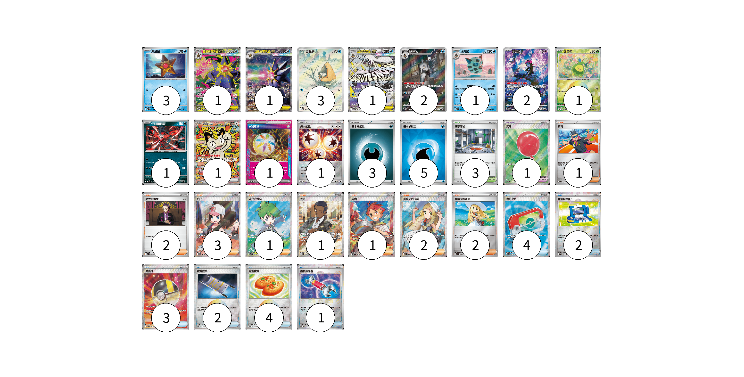 牌組構築方案 以此牌組為基礎新構築牌組 顯示卡面 顯示列表 寶可夢卡(17) 3 1 1 3 1 2 1 2 1 1 1 寶可夢道具(1) 1 物品卡(16) 4 2 3 2 4 1 支援者卡(13) 1 2 3 1 1 1 2 2 競技場卡(3) 3 能量卡(10) 1 1 3 5 寶可夢卡(17) 卡牌名稱 張數 卡牌名稱 張數 海星星 M3 020/080 03 超級寶石海星ex M3 095/080 01 超級寶石海星ex M3 111/080 01 雪童子 M2a 200/193 03 超級雪妖女ex M2a 224/193 01 雪妖女 SV6 104/101 02 冰鬼護 MC 187/742 01 願增猿 SV6 107/101 02 含羞苞 SV8a 001/187 01 伊裴爾塔爾 MC 481/742 01 喵喵ex M3 114/080 01 寶可夢道具(1) 卡牌名稱 張數 卡牌名稱 張數 氣球 M1L 084/063 01 物品卡(16) 卡牌名稱 張數 卡牌名稱 張數 寶可平板 M3 103/080 04 寶可裝置3.0 SV11B 081/086 02 高級球 M2a 216/193 03 夜間擔架 SV8a 151/187 02 好友寶芬 SV8a 147/187 04 道具拆除器 SV11W 080/086 01 支援者卡(13) 卡牌名稱 張數 卡牌名稱 張數 裁判 MC 711/742 01 老大的指令 MC 724/742 02 鬥子 SV11W 166/086 03 滿充的體貼 M1S 085/063 01 賽吉 SV5M 091/071 01 赤松 SV7 123/102 01 莉莉艾的決意 M1L 086/063 02 莉莉艾的決意 MC 729/742 02 競技場卡(3) 卡牌名稱 張數 卡牌名稱 張數 險惡廢墟 M1L 063/063 03 能量卡(10) 卡牌名稱 張數 卡牌名稱 張數 古舊能量 SV8a 187/187 01 燃火能量 SV11W 086/086 01 基本【惡】能量 MC DAR 03 基本【水】能量 SVM WAT 05 以此牌組為基礎新構築牌組 牌組編碼 CVIyBr-CJwglc-JtaaiS copy 列印牌組單 牌組編碼已複製 分享至SNS