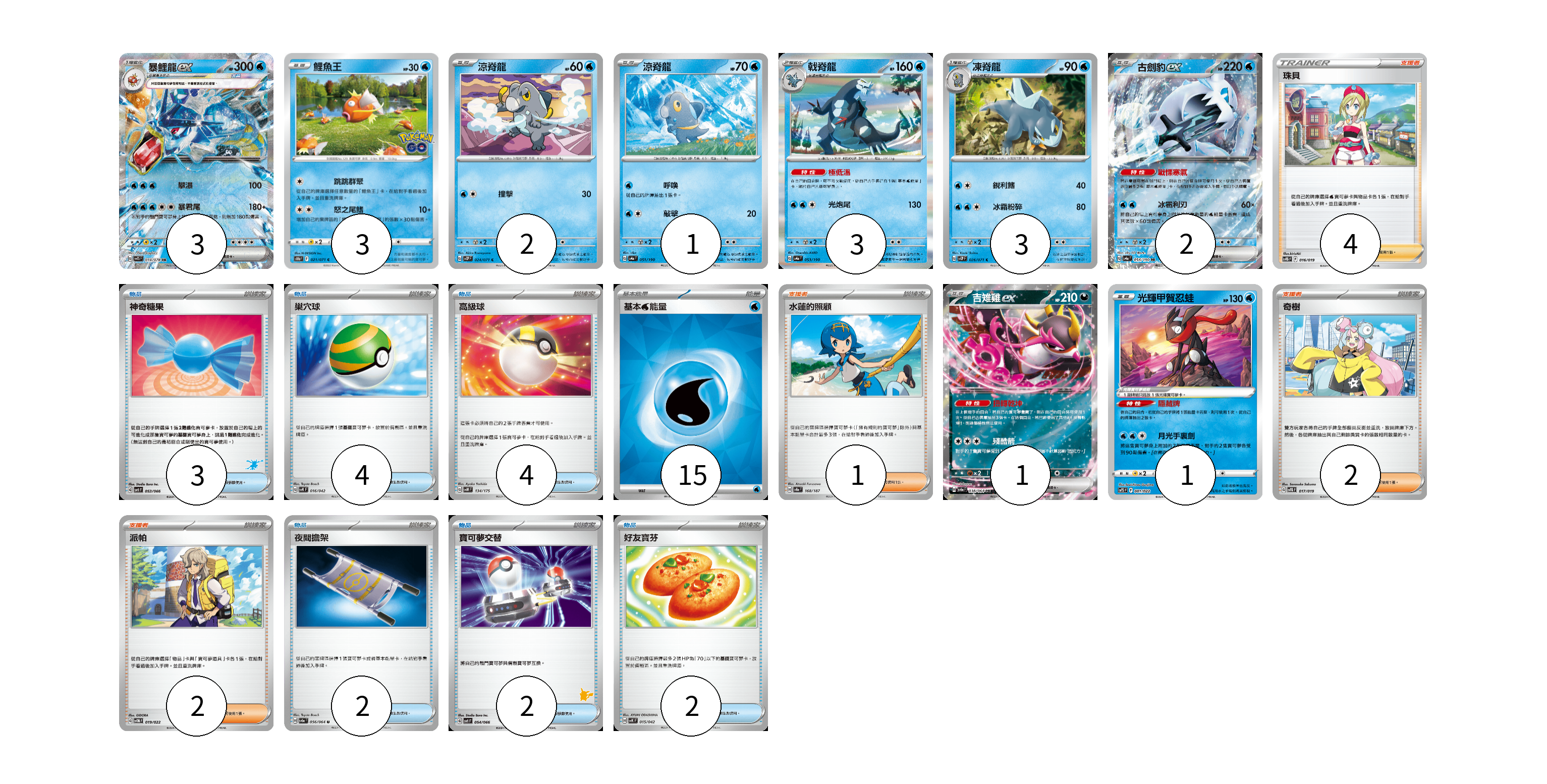 牌組構築方案 以此牌組為基礎新構築牌組 顯示卡面 顯示列表 寶可夢卡(19) 3 3 2 1 3 3 2 1 1 物品卡(17) 3 4 4 2 2 2 支援者卡(9) 4 1 2 2 能量卡(15) 15 寶可夢卡(19) 卡牌名稱 張數 卡牌名稱 張數 暴鯉龍ex SV1S 014/078 03 鯉魚王 S10b 021/071 03 涼脊龍 SV2P 024/071 02 涼脊龍 SV4a 051/190 01 戟脊龍 SV4a 053/190 03 凍脊龍 SV2P 026/071 03 古劍豹ex SV4a 054/190 02 吉雉雞ex SV6a 038/064 01 光輝甲賀忍蛙 SVTS 001/022 01 物品卡(17) 卡牌名稱 張數 卡牌名稱 張數 神奇糖果 SVI 053/066 03 巢穴球 SVK 016/042 04 高級球 SVM 134/175 04 夜間擔架 SV6a 056/064 02 寶可夢交替 SVI 054/066 02 好友寶芬 SVK 015/042 02 支援者卡(9) 卡牌名稱 張數 卡牌名稱 張數 珠貝 SVTG 016/019 04 水蓮的照顧 SV8a 168/187 01 奇樹 SVTG 017/019 02 派帕 SVTM 019/022 02 能量卡(15) 卡牌名稱 張數 卡牌名稱 張數 基本【水】能量 SVK WAT 15 以此牌組為基礎新構築牌組 牌組編碼 CYjHlK-lTGMTg-jhLKfS copy 列印牌組單 牌組編碼已複製 分享至SNS