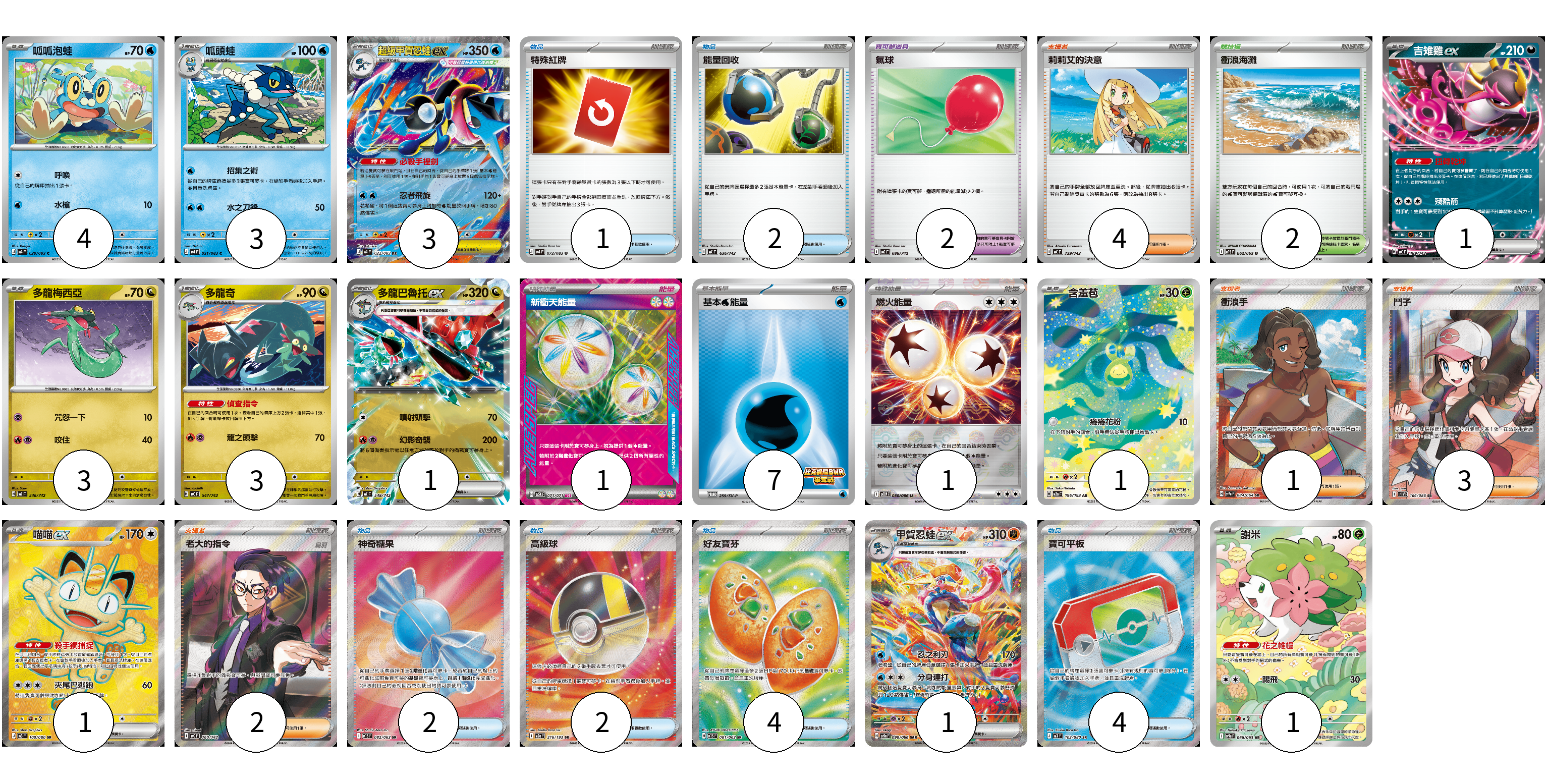 牌組構築方案 以此牌組為基礎新構築牌組 顯示卡面 顯示列表 寶可夢卡(22) 4 3 3 1 3 3 1 1 1 1 1 寶可夢道具(2) 2 物品卡(15) 1 2 2 2 4 4 支援者卡(10) 4 1 3 2 競技場卡(2) 2 能量卡(9) 1 7 1 寶可夢卡(22) 卡牌名稱 張數 卡牌名稱 張數 呱呱泡蛙 M4 020/083 04 呱頭蛙 M4 021/083 03 超級甲賀忍蛙ex M4 022/083 03 吉雉雞ex MC 489/742 01 多龍梅西亞 MC 546/742 03 多龍奇 MC 547/742 03 多龍巴魯托ex MC 548/742 01 含羞苞 M2a 196/193 01 喵喵ex M3 100/080 01 甲賀忍蛙ex SV5a 090/066 01 謝米 SV9a 066/063 01 寶可夢道具(2) 卡牌名稱 張數 卡牌名稱 張數 氣球 MC 688/742 02 物品卡(15) 卡牌名稱 張數 卡牌名稱 張數 特殊紅牌 M4 072/083 01 能量回收 MC 636/742 02 神奇糖果 M1S 082/063 02 高級球 M2a 216/193 02 好友寶芬 M1S 081/063 04 寶可平板 M3 103/080 04 支援者卡(10) 卡牌名稱 張數 卡牌名稱 張數 莉莉艾的決意 MC 729/742 04 衝浪手 SV7a 084/064 01 鬥子 SV11W 166/086 03 老大的指令(烏羽) MC 760/742 02 競技場卡(2) 卡牌名稱 張數 卡牌名稱 張數 衝浪海灘 M1S 062/063 02 能量卡(9) 卡牌名稱 張數 卡牌名稱 張數 新衝天能量 SV5K 071/071 01 基本【水】能量 SV-P 259/SV-P 07 燃火能量 SV11W 086/086 01 以此牌組為基礎新構築牌組 牌組編碼 CZShtc-WUkkYK-YECvVr copy 列印牌組單 牌組編碼已複製 分享至SNS