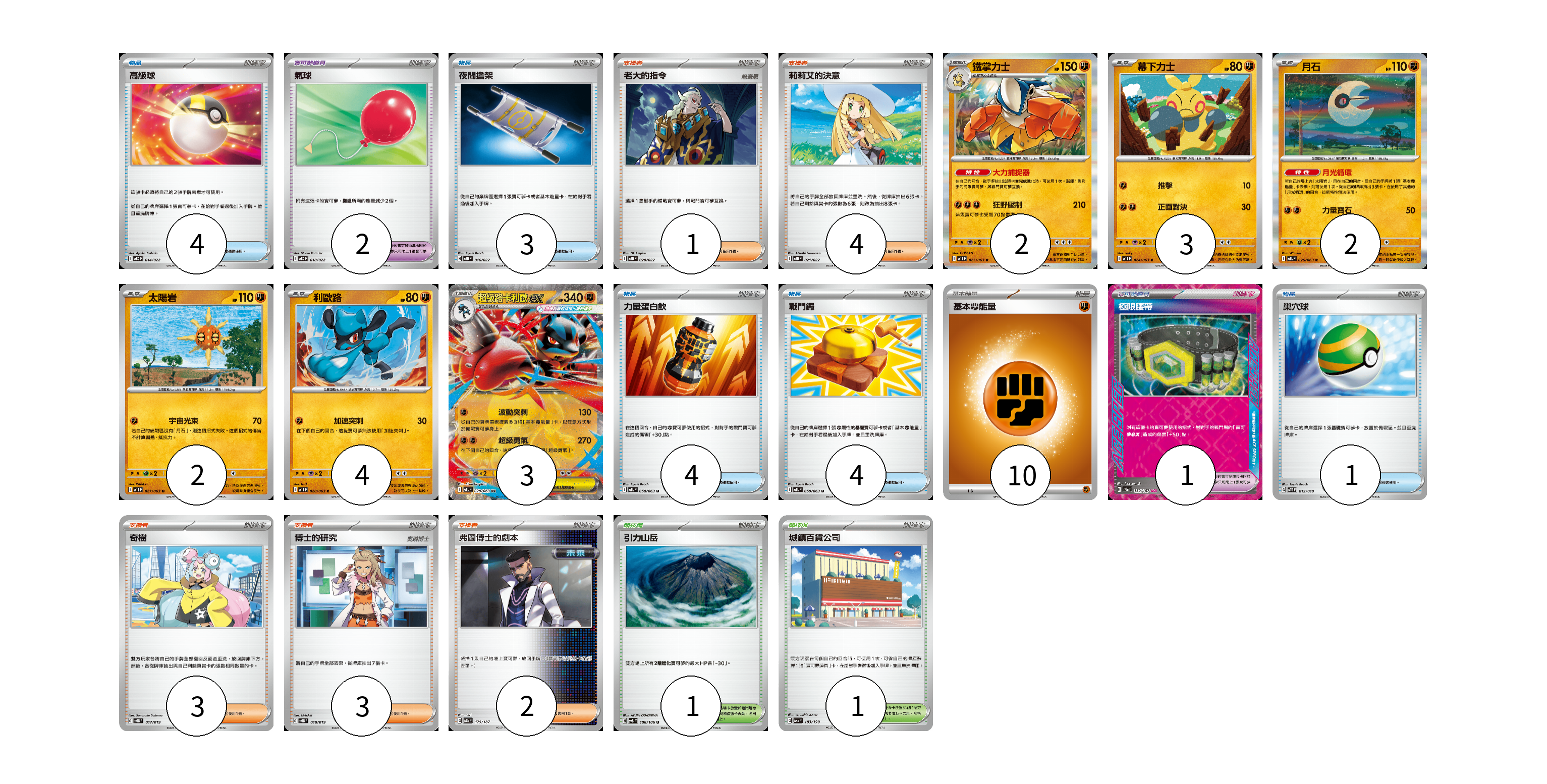 牌組構築方案 以此牌組為基礎新構築牌組 顯示卡面 顯示列表 寶可夢卡(16) 2 3 2 2 4 3 寶可夢道具(1) 1 物品卡(18) 4 2 3 4 4 1 支援者卡(13) 1 4 3 3 2 競技場卡(2) 1 1 能量卡(10) 10 寶可夢卡(16) 卡牌名稱 張數 卡牌名稱 張數 鐵掌力士 M1L 025/063 02 幕下力士 M1L 024/063 03 月石 M1L 026/063 02 太陽岩 M1L 027/063 02 利歐路 M1L 028/063 04 超級路卡利歐ex M1L 029/063 03 寶可夢道具(1) 卡牌名稱 張數 卡牌名稱 張數 極限腰帶 SV8a 159/187 01 物品卡(18) 卡牌名稱 張數 卡牌名稱 張數 高級球 MBD 014/022 04 氣球 MBD 018/022 02 夜間擔架 MBD 016/022 03 力量蛋白飲 M1L 058/063 04 戰鬥鑼 M1L 059/063 04 巢穴球 SVTG 012/019 01 支援者卡(13) 卡牌名稱 張數 卡牌名稱 張數 老大的指令 MBD 020/022 01 莉莉艾的決意 MBD 021/022 04 奇樹 SVTG 017/019 03 博士的研究 SVTG 018/019 03 弗圖博士的劇本 SV8a 175/187 02 競技場卡(2) 卡牌名稱 張數 卡牌名稱 張數 引力山岳 SV8 106/106 01 城鎮百貨公司 SV4a 183/190 01 能量卡(10) 卡牌名稱 張數 卡牌名稱 張數 基本【鬥】能量 M-P FIG 10 以此牌組為基礎新構築牌組 牌組編碼 CdIjtH-hgsgzV-EXPepF copy 列印牌組單 牌組編碼已複製 分享至SNS