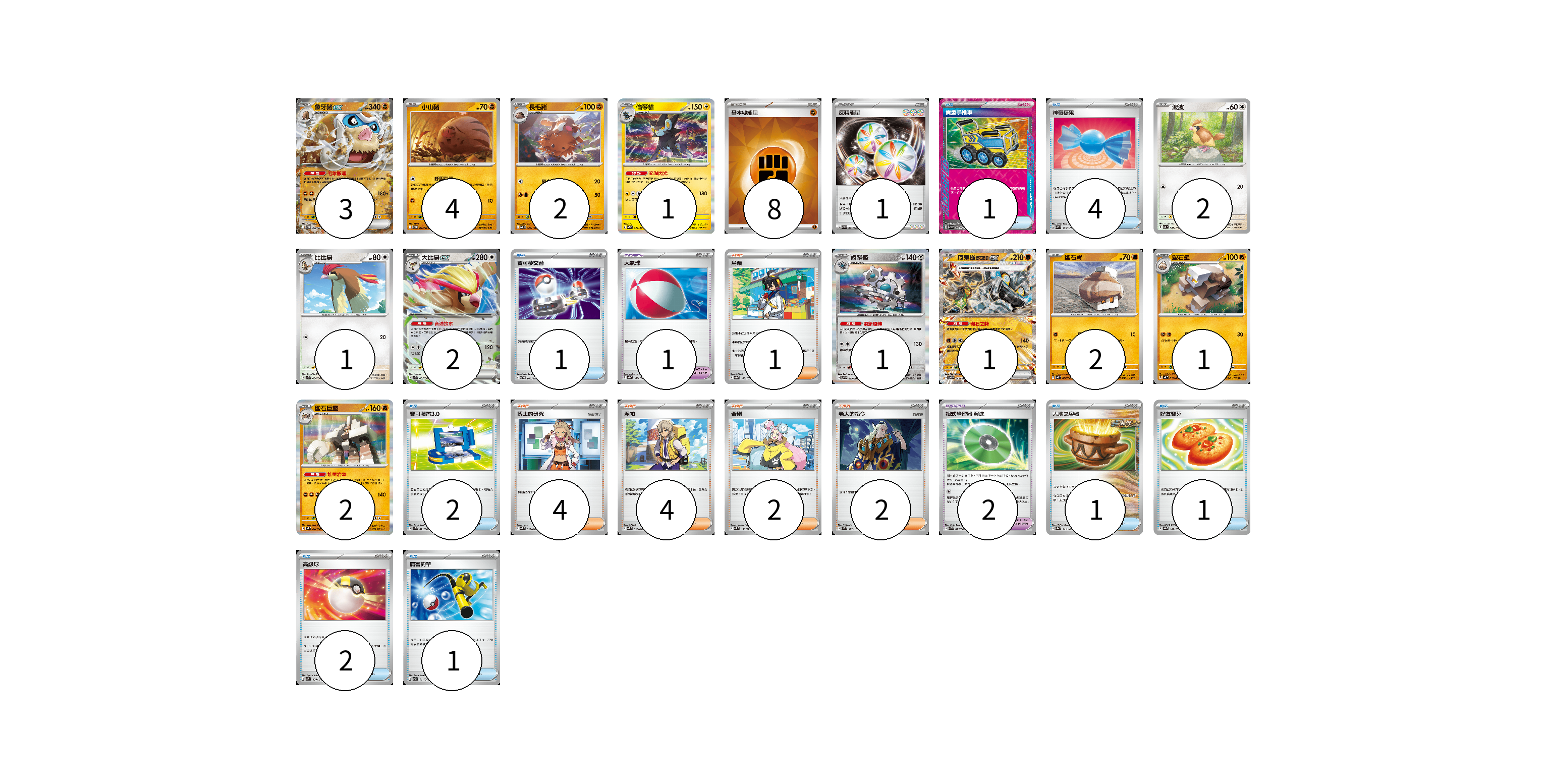 牌組構築方案 以此牌組為基礎新構築牌組 顯示卡面 顯示列表 寶可夢卡(22) 3 4 2 1 2 1 2 1 1 2 1 2 寶可夢道具(3) 1 2 物品卡(13) 1 4 1 2 1 1 2 1 支援者卡(13) 1 4 4 2 2 能量卡(9) 8 1 寶可夢卡(22) 卡牌名稱 張數 卡牌名稱 張數 象牙豬ex SV9 046/100 03 小山豬 SV9 044/100 04 長毛豬 SV9 045/100 02 倫琴貓 SV2D 021/071 01 波波 SV3 087/108 02 比比鳥 SVK 004/042 01 大比鳥ex SVK 005/042 02 齒輪怪 SV7 069/102 01 厄鬼椪 礎石面具ex SV6 065/101 01 鹽石寶 SV4K 038/066 02 鹽石壘 SV4K 039/066 01 鹽石巨靈 SV4K 040/066 02 寶可夢道具(3) 卡牌名稱 張數 卡牌名稱 張數 大氣球 SV4a 165/190 01 招式學習器 演進 SVK 025/042 02 物品卡(13) 卡牌名稱 張數 卡牌名稱 張數 貴重手推車 SVK 020/042 01 神奇糖果 SVM 135/175 04 寶可夢交替 SVTG 015/019 01 寶可裝置3.0 SVK 021/042 02 大地之容器 SV8a 143/187 01 好友寶芬 SV8a 147/187 01 高級球 SVM 134/175 02 厲害釣竿 SVK 011/042 01 支援者卡(13) 卡牌名稱 張數 卡牌名稱 張數 烏栗 SV8a 169/187 01 博士的研究 SVK 032/042 04 派帕 SVK 035/042 04 奇樹 SVM 160/175 02 老大的指令 SVM 172/175 02 能量卡(9) 卡牌名稱 張數 卡牌名稱 張數 基本【鬥】能量 SVK FIG 08 反轉能量 SVK 041/042 01 以此牌組為基礎新構築牌組 牌組編碼 ChegeE-sXyecb-fjHvaU copy 列印牌組單 牌組編碼已複製 分享至SNS