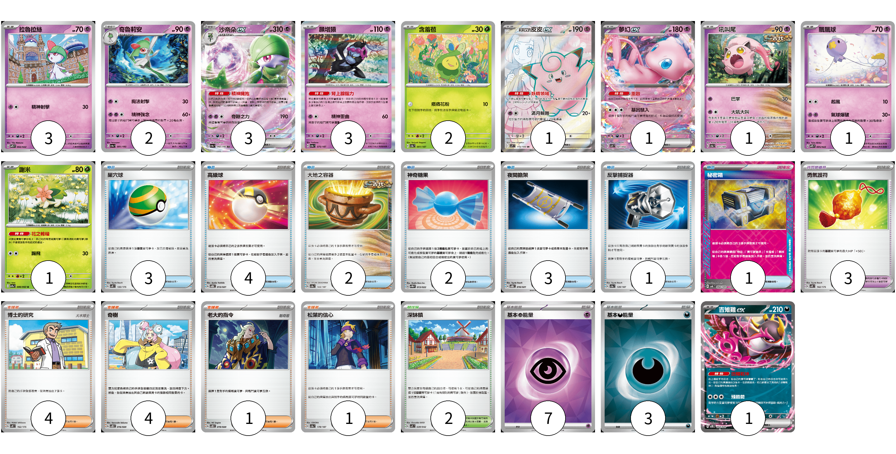 牌組構築方案 以此牌組為基礎新構築牌組 顯示卡面 顯示列表 寶可夢卡(19) 3 2 3 3 2 1 1 1 1 1 1 寶可夢道具(3) 3 物品卡(16) 3 4 2 2 3 1 1 支援者卡(10) 4 4 1 1 競技場卡(2) 2 能量卡(10) 7 3 寶可夢卡(19) 卡牌名稱 張數 卡牌名稱 張數 拉魯拉絲 SVTS 002/022 03 奇魯莉安 SV4a 081/190 02 沙奈朵ex SV4a 082/190 03 願增猿 SV8a 075/187 03 含羞苞 SV8a 001/187 02 莉莉艾的皮皮ex SV9 115/100 01 夢幻ex SVK 001/042 01 吼叫尾 SV8a 071/187 01 飄飄球 SVTS 005/022 01 謝米 SV9a 006/063 01 吉雉雞ex SVOD 004/020 01 寶可夢道具(3) 卡牌名稱 張數 卡牌名稱 張數 勇氣護符 SVM 142/175 03 物品卡(16) 卡牌名稱 張數 卡牌名稱 張數 巢穴球 SVM 133/175 03 高級球 SVOM 013/021 04 大地之容器 SV8a 143/187 02 神奇糖果 SVTM 013/022 02 夜間擔架 SVOM 016/021 03 反擊捕捉器 SV8a 139/187 01 秘密箱 SV6 092/101 01 支援者卡(10) 卡牌名稱 張數 卡牌名稱 張數 博士的研究 SVM 162/175 04 奇樹 SVOD 016/020 04 老大的指令 SVOD 019/020 01 松葉的信心 SV8a 178/187 01 競技場卡(2) 卡牌名稱 張數 卡牌名稱 張數 深缽鎮 SVK 039/042 02 能量卡(10) 卡牌名稱 張數 卡牌名稱 張數 基本【超】能量 SVOD PSY 07 基本【惡】能量 SVOM DAR 03 以此牌組為基礎新構築牌組 牌組編碼 ClFbou-XwunwS-nJwKSZ copy 列印牌組單 牌組編碼已複製 分享至SNS