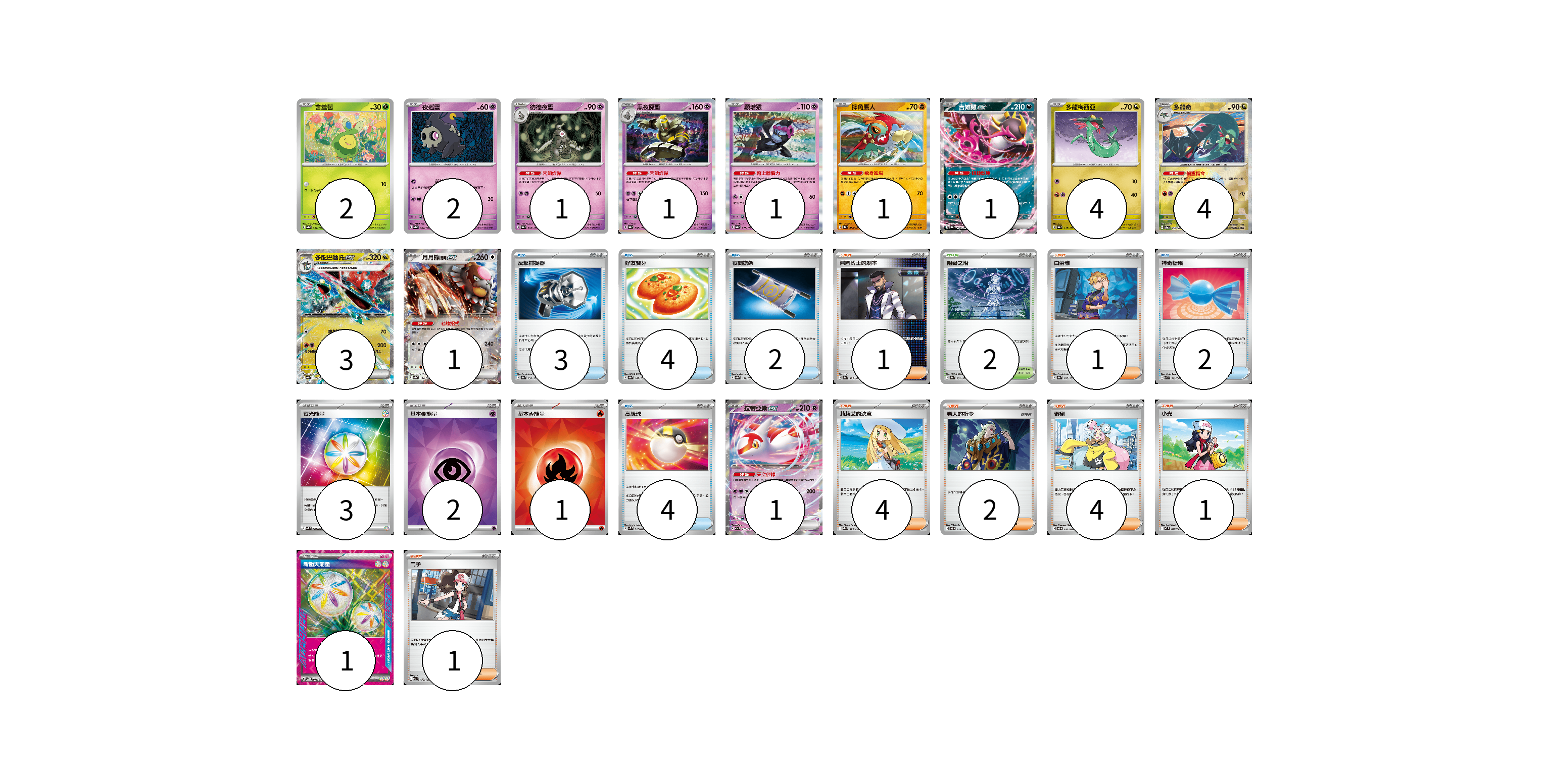 牌組構築方案 以此牌組為基礎新構築牌組 顯示卡面 顯示列表 寶可夢卡(22) 2 2 1 1 1 1 1 4 4 3 1 1 物品卡(15) 3 4 2 2 4 支援者卡(14) 1 1 4 2 4 1 1 競技場卡(2) 2 能量卡(7) 3 2 1 1 寶可夢卡(22) 卡牌名稱 張數 卡牌名稱 張數 含羞苞 SV8a 001/187 02 夜巡靈 SV8a 064/187 02 彷徨夜靈 SV8a 065/187 01 黑夜魔靈 SV8a 066/187 01 願增猿 SV8a 075/187 01 摔角鷹人 SV8a 084/187 01 吉雉雞ex SV8a 104/187 01 多龍梅西亞 SV8a 118/187 04 多龍奇 SV8a 119/187 04 多龍巴魯托ex SV8a 120/187 03 月月熊 赫月ex SV8a 134/187 01 拉帝亞斯ex M2a 075/193 01 物品卡(15) 卡牌名稱 張數 卡牌名稱 張數 反擊捕捉器 SV8a 139/187 03 好友寶芬 SV8a 147/187 04 夜間擔架 SV8a 151/187 02 神奇糖果 SVK 019/042 02 高級球 SVK 018/042 04 支援者卡(14) 卡牌名稱 張數 卡牌名稱 張數 弗圖博士的劇本 SV8a 175/187 01 白蕾雅 SV8a 176/187 01 莉莉艾的決意 M2a 175/193 04 老大的指令 SVOD 019/020 02 奇樹 SVOD 016/020 04 小光 M2 077/080 01 鬥子 M2a 172/193 01 競技場卡(2) 卡牌名稱 張數 卡牌名稱 張數 阻礙之塔 SV8a 181/187 02 能量卡(7) 卡牌名稱 張數 卡牌名稱 張數 夜光能量 SVK 042/042 03 基本【超】能量 SVK PSY 02 基本【火】能量 SVK FIR 01 新衝天能量 SV5K 071/071 01 以此牌組為基礎新構築牌組 牌組編碼 CoVuuc-wJiUux-NltcZy copy 列印牌組單 牌組編碼已複製 分享至SNS