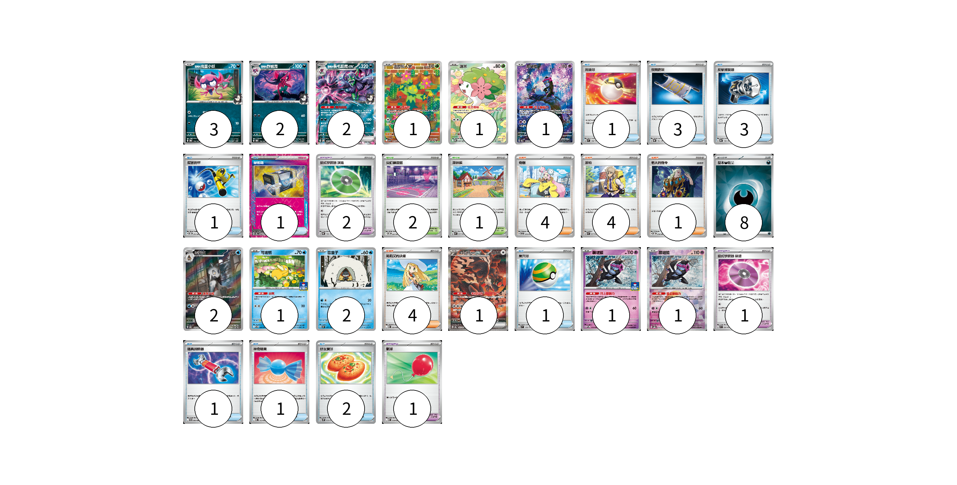 牌組構築方案 以此牌組為基礎新構築牌組 顯示卡面 顯示列表 寶可夢卡(18) 3 2 2 1 1 1 2 1 2 1 1 1 寶可夢道具(7) 2 4 1 物品卡(15) 1 3 3 1 1 1 1 1 2 1 支援者卡(9) 4 1 4 競技場卡(3) 2 1 能量卡(8) 8 寶可夢卡(18) 卡牌名稱 張數 卡牌名稱 張數 <瑪俐的>搗蛋小妖 SVOM 005/021 03 <瑪俐的>詐唬魔 SVOM 006/021 02 <瑪俐的>長毛巨魔ex SVOM 007/021 02 沙鈴仙人掌 SV9 101/100 01 謝米 SV9a 066/063 01 願增猿 SV6 107/101 01 雪妖女 SV6 104/101 02 可達鴨 SV-P 220/SV-P 01 雪童子 SV8a 037/187 02 月月熊 赫月ex SV8a 225/187 01 願增猿 M-P 014/M-P 01 願增猿 SV8a 075/187 01 寶可夢道具(7) 卡牌名稱 張數 卡牌名稱 張數 招式學習器 演進 SV8a 160/187 02 奇樹 SVTL 018/021 04 招式學習器 衰退 SVK 026/042 01 物品卡(15) 卡牌名稱 張數 卡牌名稱 張數 高級球 SVM 134/175 01 夜間擔架 SV8a 151/187 03 反擊捕捉器 SV8a 139/187 03 厲害釣竿 SVOM 011/021 01 秘密箱 SV6 092/101 01 巢穴球 SVM 133/175 01 道具拆除器 SV11W 080/086 01 神奇糖果 MBG 013/022 01 好友寶芬 SV5K 063/071 02 氣球 MBD 018/022 01 支援者卡(9) 卡牌名稱 張數 卡牌名稱 張數 派帕 SVK 035/042 04 老大的指令 SVOD 019/020 01 莉莉艾的決意 MBD 021/022 04 競技場卡(3) 卡牌名稱 張數 卡牌名稱 張數 尖釘鎮道館 SVOM 021/021 02 深缽鎮 SVK 039/042 01 能量卡(8) 卡牌名稱 張數 卡牌名稱 張數 基本【惡】能量 SVOM DAR 08 以此牌組為基礎新構築牌組 牌組編碼 CqBFqH-tiPAxC-bKpvnS copy 列印牌組單 牌組編碼已複製 分享至SNS