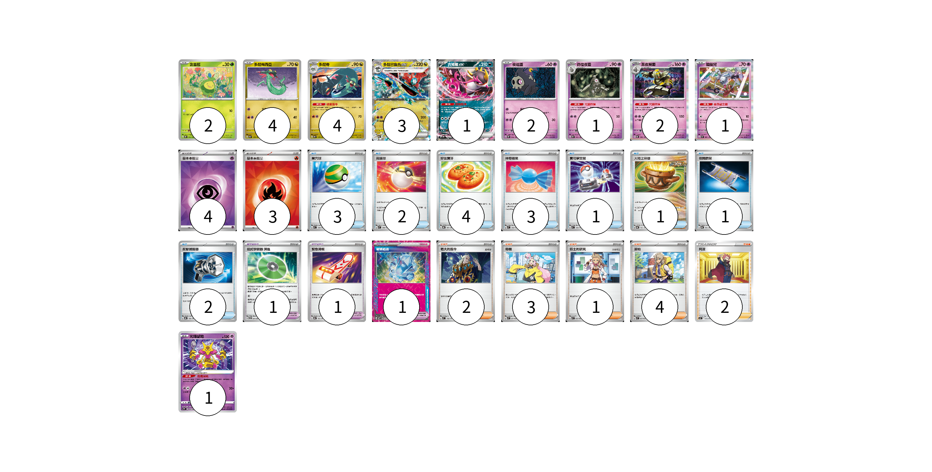 牌組構築方案 以此牌組為基礎新構築牌組 顯示卡面 顯示列表 寶可夢卡(21) 2 4 4 3 1 2 1 2 1 1 寶可夢道具(3) 1 1 1 物品卡(17) 3 2 4 3 1 1 1 2 支援者卡(12) 2 3 1 4 2 能量卡(7) 4 3 寶可夢卡(21) 卡牌名稱 張數 卡牌名稱 張數 含羞苞 SV8a 001/187 02 多龍梅西亞 SV8a 118/187 04 多龍奇 SV8a 119/187 04 多龍巴魯托ex SV8a 120/187 03 吉雉雞ex SV8a 104/187 01 夜巡靈 SV8a 064/187 02 彷徨夜靈 SV8a 065/187 01 黑夜魔靈 SV8a 066/187 02 鑰圈兒 SV4a 087/190 01 光輝胡地 SVTM 006/022 01 寶可夢道具(3) 卡牌名稱 張數 卡牌名稱 張數 招式學習器 演進 SVTL 017/021 01 緊急滑板 SV8a 153/187 01 璀璨結晶 SV7 094/102 01 物品卡(17) 卡牌名稱 張數 卡牌名稱 張數 巢穴球 SVM 133/175 03 高級球 SVM 134/175 02 好友寶芬 SV8a 147/187 04 神奇糖果 SVM 135/175 03 寶可夢交替 SVM 136/175 01 大地之容器 SV8a 143/187 01 夜間擔架 SV8a 151/187 01 反擊捕捉器 SV8a 139/187 02 支援者卡(12) 卡牌名稱 張數 卡牌名稱 張數 老大的指令 SVM 172/175 02 奇樹 SVK 031/042 03 博士的研究 SVK 032/042 01 派帕 SVK 035/042 04 阿渡 S12 096/098 02 能量卡(7) 卡牌名稱 張數 卡牌名稱 張數 基本【超】能量 SVK PSY 04 基本【火】能量 SVK FIR 03 以此牌組為基礎新構築牌組 牌組編碼 CqVonG-zwPLjV-ahRTmC copy 列印牌組單 牌組編碼已複製 分享至SNS