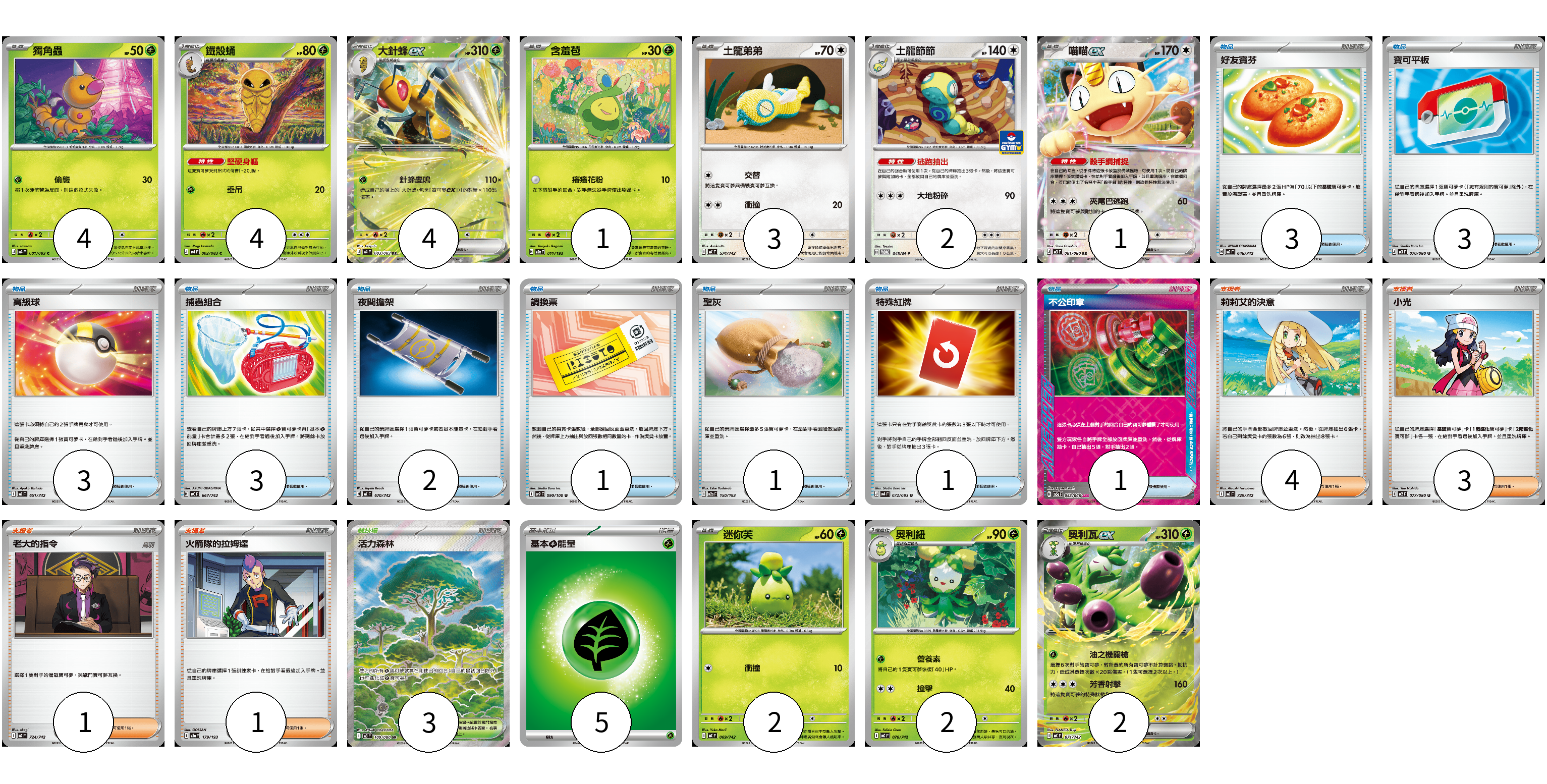 牌組構築方案 以此牌組為基礎新構築牌組 顯示卡面 顯示列表 寶可夢卡(25) 4 4 4 1 3 2 1 2 2 2 物品卡(18) 3 3 3 3 2 1 1 1 1 支援者卡(9) 4 3 1 1 競技場卡(3) 3 能量卡(5) 5 寶可夢卡(25) 卡牌名稱 張數 卡牌名稱 張數 獨角蟲 M4 001/083 04 鐵殼蛹 M4 002/083 04 大針蜂ex M4 003/083 04 含羞苞 M2a 011/193 01 土龍弟弟 MC 574/742 03 土龍節節 M-P 045/M-P 02 喵喵ex M3 061/080 01 迷你芙 MC 069/742 02 奧利紐 MC 070/742 02 奧利瓦ex MC 071/742 02 物品卡(18) 卡牌名稱 張數 卡牌名稱 張數 好友寶芬 MC 648/742 03 寶可平板 M3 070/080 03 高級球 MC 651/742 03 捕蟲組合 MC 667/742 03 夜間擔架 MC 670/742 02 調換票 SV9 090/100 01 聖灰 M2a 150/193 01 特殊紅牌 M4 072/083 01 不公印章 SV5a 053/066 01 支援者卡(9) 卡牌名稱 張數 卡牌名稱 張數 莉莉艾的決意 MC 729/742 04 小光 M2 077/080 03 老大的指令 MC 724/742 01 火箭隊的拉姆達 M2a 179/193 01 競技場卡(3) 卡牌名稱 張數 卡牌名稱 張數 活力森林 M3 109/080 03 能量卡(5) 卡牌名稱 張數 卡牌名稱 張數 基本【草】能量 MJ GRA 05 以此牌組為基礎新構築牌組 牌組編碼 CsZDsp-JCeIhw-FEObeo copy 列印牌組單 牌組編碼已複製 分享至SNS