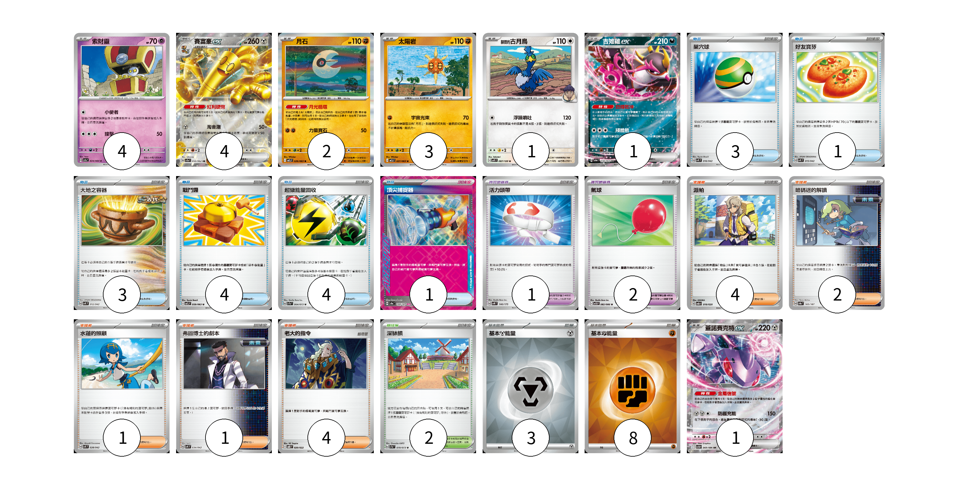 牌組構築方案 以此牌組為基礎新構築牌組 顯示卡面 顯示列表 寶可夢卡(16) 4 4 2 3 1 1 1 寶可夢道具(3) 1 2 物品卡(16) 3 1 3 4 4 1 支援者卡(12) 4 2 1 1 4 競技場卡(2) 2 能量卡(11) 3 8 寶可夢卡(16) 卡牌名稱 張數 卡牌名稱 張數 索財靈 SV7a 024/064 04 賽富豪ex SV3a 050/062 04 月石 M1L 026/063 02 太陽岩 M1L 027/063 03 赫普的古月鳥 SV9 087/100 01 吉雉雞ex SV6a 038/064 01 蓋諾賽克特ex SV11B 069/086 01 寶可夢道具(3) 卡牌名稱 張數 卡牌名稱 張數 活力頭帶 SVM 140/175 01 氣球 SV11B 082/086 02 物品卡(16) 卡牌名稱 張數 卡牌名稱 張數 巢穴球 SVK 016/042 03 好友寶芬 SVK 015/042 01 大地之容器 SVK 012/042 03 戰鬥鑼 M1L 059/063 04 超級能量回收 SV1a 064/073 04 頂尖捕捉器 SV8a 148/187 01 支援者卡(12) 卡牌名稱 張數 卡牌名稱 張數 派帕 SVOD 018/020 04 暗碼迷的解讀 SV8a 165/187 02 水蓮的照顧 SVK 028/042 01 弗圖博士的劇本 SVK 034/042 01 老大的指令 MBD 020/022 04 競技場卡(2) 卡牌名稱 張數 卡牌名稱 張數 深缽鎮 SV1a 070/073 02 能量卡(11) 卡牌名稱 張數 卡牌名稱 張數 基本【鋼】能量 SVK MET 03 基本【鬥】能量 SVK FIG 08 以此牌組為基礎新構築牌組 牌組編碼 CzYNre-ZuRxqh-DPHAuK copy 列印牌組單 牌組編碼已複製 分享至SNS