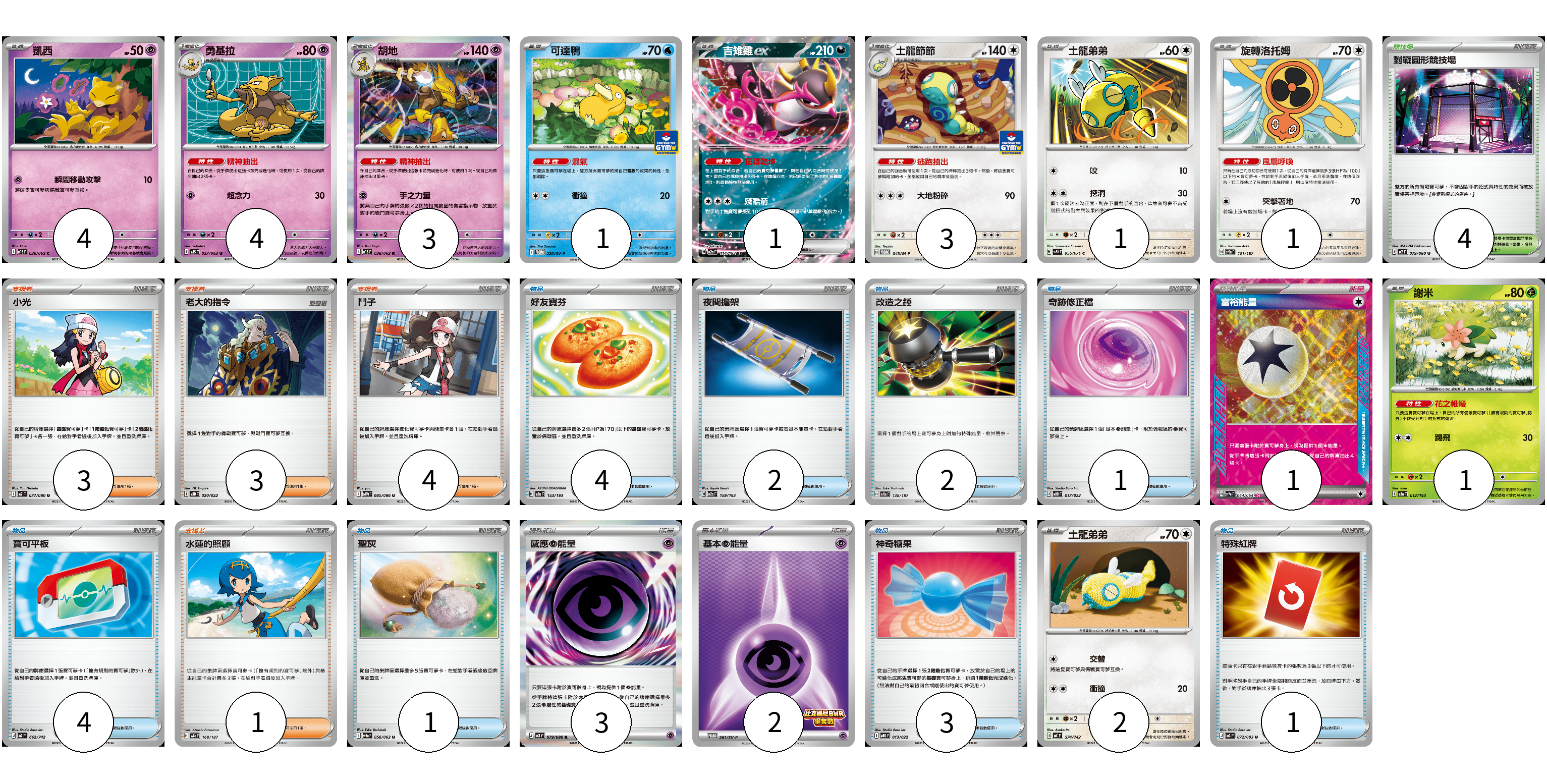 牌組構築方案 以此牌組為基礎新構築牌組 顯示卡面 顯示列表 寶可夢卡(21) 4 4 3 1 1 3 1 1 1 2 物品卡(18) 4 2 2 1 4 1 3 1 支援者卡(11) 3 3 4 1 競技場卡(4) 4 能量卡(6) 1 3 2 寶可夢卡(21) 卡牌名稱 張數 卡牌名稱 張數 凱西 M1S 036/063 04 勇基拉 M1S 037/063 04 胡地 M1S 038/063 03 可達鴨 SV-P 220/SV-P 01 吉雉雞ex M2a 114/193 01 土龍節節 M-P 045/M-P 03 土龍弟弟 SV5K 056/071 01 旋轉洛托姆 SV8a 131/187 01 謝米 M2a 012/193 01 土龍弟弟 MC 574/742 02 物品卡(18) 卡牌名稱 張數 卡牌名稱 張數 好友寶芬 M2a 153/193 04 夜間擔架 M2a 159/193 02 改造之錘 SV8a 138/187 02 奇跡修正檔 MBD 017/022 01 寶可平板 MC 662/742 04 聖灰 SV9a 056/063 01 神奇糖果 MBG 013/022 03 特殊紅牌 M4 072/083 01 支援者卡(11) 卡牌名稱 張數 卡牌名稱 張數 小光 M2 077/080 03 老大的指令 MBD 020/022 03 鬥子 SV11W 085/086 04 水蓮的照顧 SV8a 168/187 01 競技場卡(4) 卡牌名稱 張數 卡牌名稱 張數 對戰圓形競技場 M2 079/080 04 能量卡(6) 卡牌名稱 張數 卡牌名稱 張數 富裕能量 SV7a 064/064 01 感應【超】能量 M3 079/080 03 基本【超】能量 SV-P 261/SV-P 02 以此牌組為基礎新構築牌組 牌組編碼 DBpmAq-HylLUj-wSlxKO copy 列印牌組單 牌組編碼已複製 分享至SNS