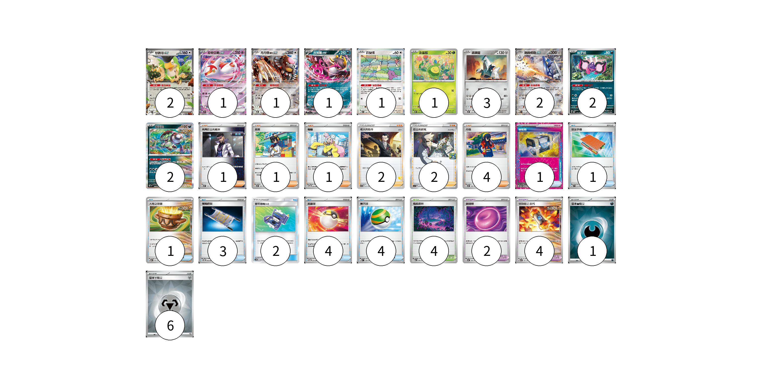 牌組構築方案 以此牌組為基礎新構築牌組 顯示卡面 顯示列表 寶可夢卡(16) 2 1 1 1 1 1 3 2 2 2 寶可夢道具(6) 2 4 物品卡(16) 1 1 1 3 2 4 4 支援者卡(11) 1 1 1 2 2 4 競技場卡(4) 4 能量卡(7) 1 6 寶可夢卡(16) 卡牌名稱 張數 卡牌名稱 張數 怒鸚哥ex SVK 006/042 02 拉帝亞斯ex SV7a 019/064 01 月月熊 赫月ex SV8a 134/187 01 吉雉雞ex SV6a 038/064 01 百變怪 SV4a 144/190 01 含羞苞 SV8a 001/187 01 鋁鋼龍 SV8a 112/187 03 鋁鋼橋龍ex SV7a 037/064 02 桃歹郎 SV8 075/106 02 猛惡菇 SV4K 053/066 02 寶可夢道具(6) 卡牌名稱 張數 卡牌名稱 張數 鎖鏈糬 SV8a 154/187 02 驅勁能量 古代 SV8a 157/187 04 物品卡(16) 卡牌名稱 張數 卡牌名稱 張數 秘密箱 SV6 092/101 01 朋友手冊 SVK 014/042 01 大地之容器 SV8a 143/187 01 夜間擔架 SVOM 016/021 03 寶可齒輪3.0 AS6D 150/168 02 高級球 SVOD 012/020 04 巢穴球 SVM 133/175 04 支援者卡(11) 卡牌名稱 張數 卡牌名稱 張數 弗圖博士的劇本 SV8a 175/187 01 烏栗 SV8a 169/187 01 奇樹 SVOD 016/020 01 老大的指令(坂木) SH 051/053 02 博士的研究(大木博士) S8a 003/028 02 丹瑜 SV8a 170/187 04 競技場卡(4) 卡牌名稱 張數 卡牌名稱 張數 危險密林 SV5K 070/071 04 能量卡(7) 卡牌名稱 張數 卡牌名稱 張數 基本【惡】能量 SVOM DAR 01 基本【鋼】能量 SVOD MET 06 以此牌組為基礎新構築牌組 牌組編碼 DCWUcM-hFboJh-tqcAHU copy 列印牌組單 牌組編碼已複製 分享至SNS