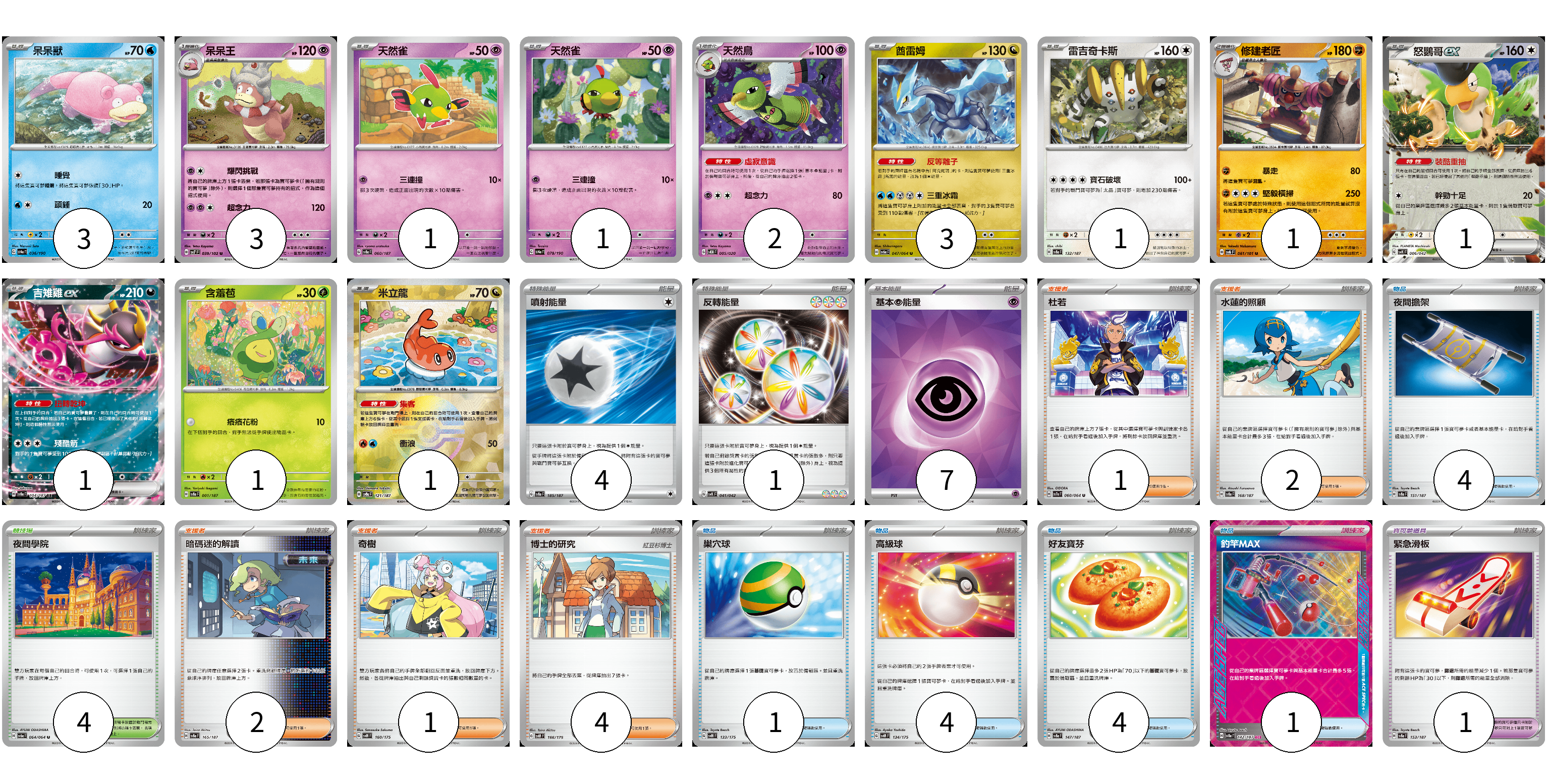 牌組構築方案 以此牌組為基礎新構築牌組 顯示卡面 顯示列表 寶可夢卡(19) 3 3 1 1 2 3 1 1 1 1 1 1 寶可夢道具(1) 1 物品卡(14) 4 1 4 4 1 支援者卡(10) 1 2 2 1 4 競技場卡(4) 4 能量卡(12) 4 1 7 寶可夢卡(19) 卡牌名稱 張數 卡牌名稱 張數 呆呆獸 SV4a 036/190 03 呆呆王 SV7 039/102 03 天然雀 SV8a 060/187 01 天然雀 SV4a 078/190 01 天然鳥 SVEM 005/020 02 酋雷姆 SV6a 047/064 03 雷吉奇卡斯 SV8a 132/187 01 修建老匠 SV6 061/101 01 怒鸚哥ex SVK 006/042 01 吉雉雞ex SV8a 104/187 01 含羞苞 SV8a 001/187 01 米立龍 SV8a 121/187 01 寶可夢道具(1) 卡牌名稱 張數 卡牌名稱 張數 緊急滑板 SV8a 153/187 01 物品卡(14) 卡牌名稱 張數 卡牌名稱 張數 夜間擔架 SV8a 151/187 04 巢穴球 SVM 133/175 01 高級球 SVM 134/175 04 好友寶芬 SV8a 147/187 04 釣竿MAX SV8a 142/187 01 支援者卡(10) 卡牌名稱 張數 卡牌名稱 張數 杜若 SV7a 060/064 01 水蓮的照顧 SV8a 168/187 02 暗碼迷的解讀 SV8a 165/187 02 奇樹 SVM 160/175 01 博士的研究 SVM 166/175 04 競技場卡(4) 卡牌名稱 張數 卡牌名稱 張數 夜間學院 SV6a 064/064 04 能量卡(12) 卡牌名稱 張數 卡牌名稱 張數 噴射能量 SV8a 185/187 04 反轉能量 SVK 041/042 01 基本【超】能量 SVK PSY 07 以此牌組為基礎新構築牌組 牌組編碼 DCZCUt-feNGad-qCAQLq copy 列印牌組單 牌組編碼已複製 分享至SNS