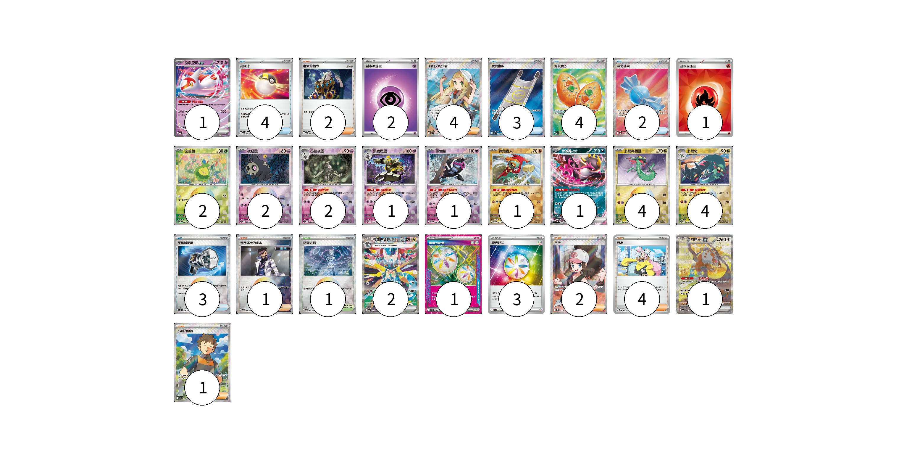 牌組構築方案 以此牌組為基礎新構築牌組 顯示卡面 顯示列表 寶可夢卡(22) 1 2 2 2 1 1 1 1 4 4 2 1 物品卡(16) 4 3 4 2 3 支援者卡(14) 2 4 1 2 4 1 競技場卡(1) 1 能量卡(7) 2 1 1 3 寶可夢卡(22) 卡牌名稱 張數 卡牌名稱 張數 拉帝亞斯ex MBD 003/022 01 含羞苞 SV8a 001/187 02 夜巡靈 SV8a 064/187 02 彷徨夜靈 SV8a 065/187 02 黑夜魔靈 SV8a 066/187 01 願增猿 SV8a 075/187 01 摔角鷹人 SV8a 084/187 01 吉雉雞ex SV8a 104/187 01 多龍梅西亞 SV8a 118/187 04 多龍奇 SV8a 119/187 04 多龍巴魯托ex SV8a 221/187 02 月月熊 赫月 ex SV5a 091/066 01 物品卡(16) 卡牌名稱 張數 卡牌名稱 張數 高級球 MBD 014/022 04 夜間擔架 M1L 083/063 03 好友寶芬 M1S 081/063 04 神奇糖果 M1S 082/063 02 反擊捕捉器 SV8a 139/187 03 支援者卡(14) 卡牌名稱 張數 卡牌名稱 張數 老大的指令 MBD 020/022 02 莉莉艾的決意 M1L 086/063 04 弗圖博士的劇本 SV8a 175/187 01 鬥子 SV11W 166/086 02 奇樹 SV2D 069/071 04 小剛的發掘 SV9 123/100 01 競技場卡(1) 卡牌名稱 張數 卡牌名稱 張數 阻礙之塔 SV8a 181/187 01 能量卡(7) 卡牌名稱 張數 卡牌名稱 張數 基本【超】能量 MBD PSY 02 基本【火】能量 SVQL FIR 01 新衝天能量 SV5K 071/071 01 夜光能量 SV4a 190/190 03 以此牌組為基礎新構築牌組 牌組編碼 DGUXGH-jFhIOn-LGajWO copy 列印牌組單 牌組編碼已複製 分享至SNS