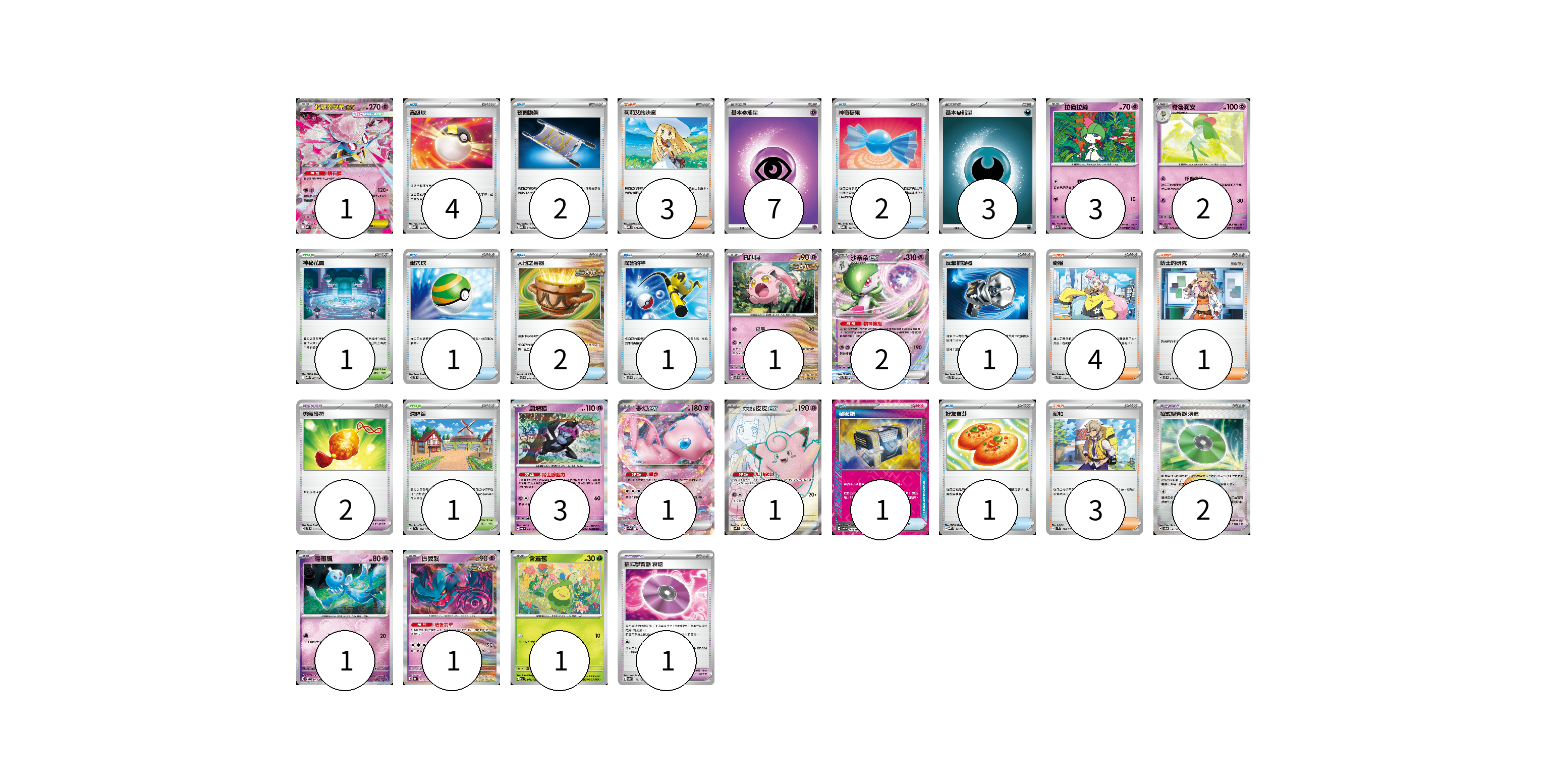 牌組構築方案 以此牌組為基礎新構築牌組 顯示卡面 顯示列表 寶可夢卡(17) 1 3 2 1 2 3 1 1 1 1 1 寶可夢道具(5) 2 2 1 物品卡(15) 4 2 2 1 2 1 1 1 1 支援者卡(11) 3 4 1 3 競技場卡(2) 1 1 能量卡(10) 7 3 寶可夢卡(17) 卡牌名稱 張數 卡牌名稱 張數 超級蒂安希ex MBD 006/022 01 拉魯拉絲 M1S 040/063 03 奇魯莉安 M1S 041/063 02 吼叫尾 SVTS 007/022 01 沙奈朵ex SVTS 004/022 02 願增猿 SV6 055/101 03 夢幻ex SV2a 151/165 01 莉莉艾的皮皮ex SV9 115/100 01 輕飄飄 SV11W 041/086 01 振翼髮 SV8a 072/187 01 含羞苞 M2a 011/193 01 寶可夢道具(5) 卡牌名稱 張數 卡牌名稱 張數 勇氣護符 SVTS 017/022 02 招式學習器 演進 SV8a 160/187 02 招式學習器 衰退 SV8a 161/187 01 物品卡(15) 卡牌名稱 張數 卡牌名稱 張數 高級球 MBD 014/022 04 夜間擔架 MBD 016/022 02 神奇糖果 MBG 013/022 02 巢穴球 SVTS 013/022 01 大地之容器 SVTS 011/022 02 厲害釣竿 SVTS 010/022 01 反擊捕捉器 SVTS 009/022 01 秘密箱 SV6 092/101 01 好友寶芬 MBD 013/022 01 支援者卡(11) 卡牌名稱 張數 卡牌名稱 張數 莉莉艾的決意 MBD 021/022 03 奇樹 SVTS 018/022 04 博士的研究 SVTS 019/022 01 派帕 SV1V 076/078 03 競技場卡(2) 卡牌名稱 張數 卡牌名稱 張數 神秘花園 M1S 063/063 01 深缽鎮 SV1a 070/073 01 能量卡(10) 卡牌名稱 張數 卡牌名稱 張數 基本【超】能量 MBD PSY 07 基本【惡】能量 MBG DAR 03 以此牌組為基礎新構築牌組 牌組編碼 DHvKLn-uZHIgh-bkUWBB copy 列印牌組單 牌組編碼已複製 分享至SNS