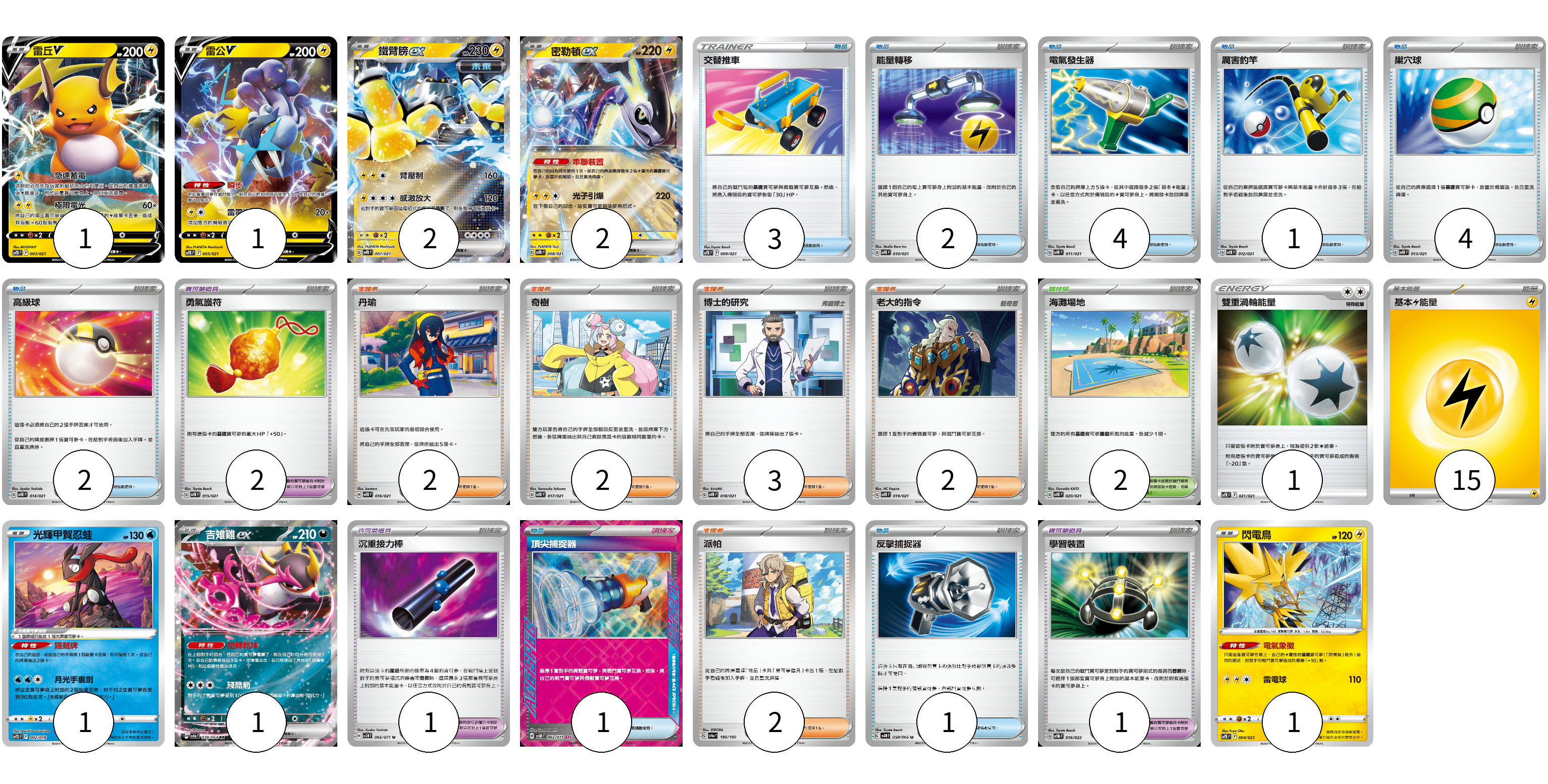 牌組構築方案 以此牌組為基礎新構築牌組 顯示卡面 顯示列表 寶可夢卡(9) 1 1 2 2 1 1 1 寶可夢道具(4) 2 1 1 物品卡(18) 3 2 4 1 4 2 1 1 支援者卡(11) 2 2 3 2 2 競技場卡(2) 2 能量卡(16) 1 15 寶可夢卡(9) 卡牌名稱 張數 卡牌名稱 張數 雷丘V SVTR 003/021 01 雷公V SVTR 005/021 01 鐵臂膀ex SVTR 007/021 02 密勒頓ex SVTR 008/021 02 光輝甲賀忍蛙 SVTG 002/019 01 吉雉雞ex SV6a 038/064 01 閃電鳥 SVTR 004/021 01 寶可夢道具(4) 卡牌名稱 張數 卡牌名稱 張數 勇氣護符 SVTR 015/021 02 沉重接力棒 SV5M 066/071 01 學習裝置 SVTM 016/022 01 物品卡(18) 卡牌名稱 張數 卡牌名稱 張數 交替推車 SVTR 009/021 03 能量轉移 SVTR 010/021 02 電氣發生器 SVTR 011/021 04 厲害釣竿 SVTR 012/021 01 巢穴球 SVTR 013/021 04 高級球 SVTR 014/021 02 頂尖捕捉器 SV5M 062/071 01 反擊捕捉器 SV4M 059/066 01 支援者卡(11) 卡牌名稱 張數 卡牌名稱 張數 丹瑜 SVTR 016/021 02 奇樹 SVTR 017/021 02 博士的研究 SVTR 018/021 03 老大的指令 SVTR 019/021 02 派帕 SV4a 180/190 02 競技場卡(2) 卡牌名稱 張數 卡牌名稱 張數 海灘場地 SVTR 020/021 02 能量卡(16) 卡牌名稱 張數 卡牌名稱 張數 雙重渦輪能量 SVTR 021/021 01 基本【雷】能量 SVTR LIG 15 以此牌組為基礎新構築牌組 牌組編碼 DJgcXk-WQBAmM-sJiUyo copy 列印牌組單 牌組編碼已複製 分享至SNS