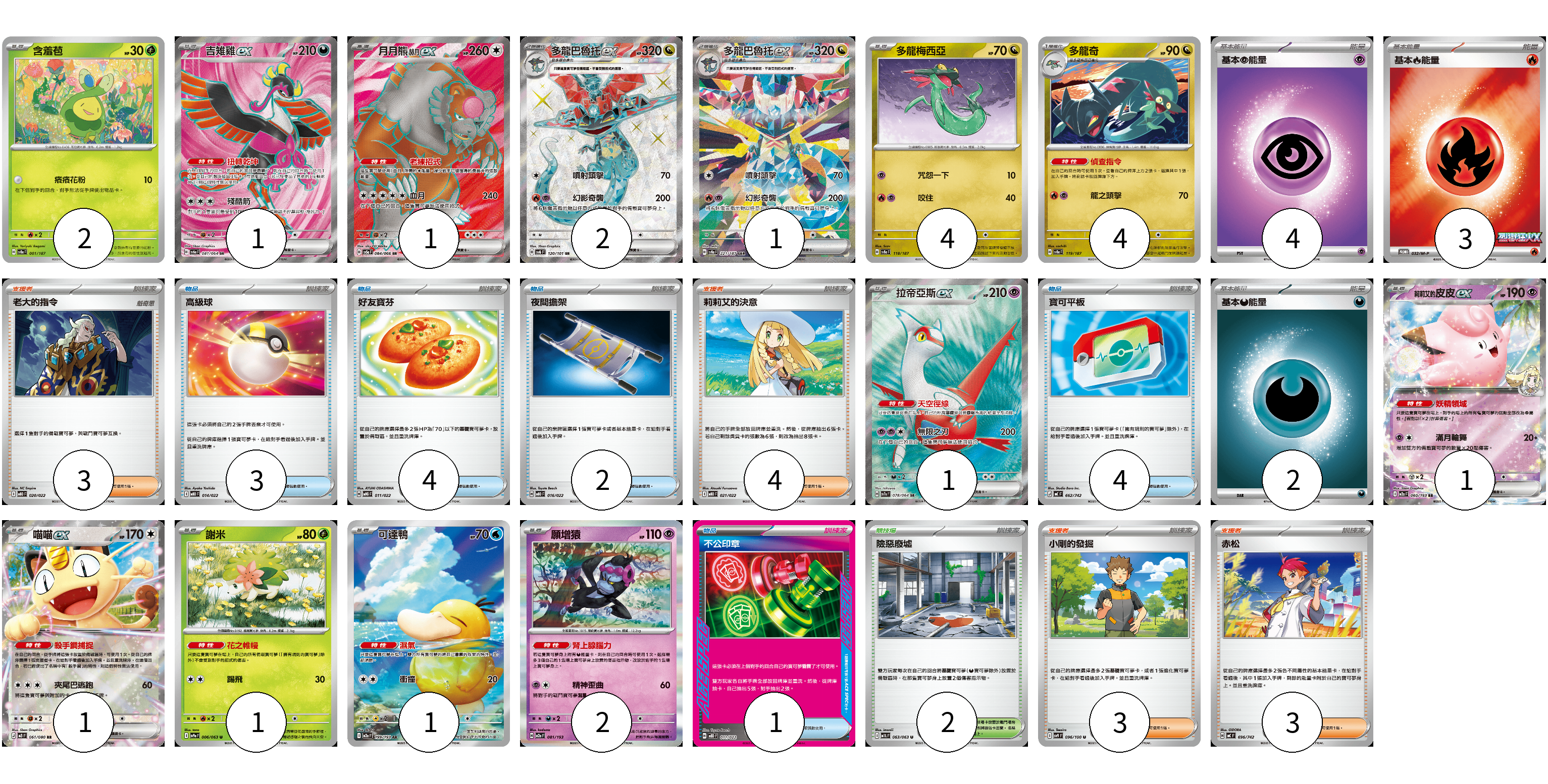 牌組構築方案 以此牌組為基礎新構築牌組 顯示卡面 顯示列表 寶可夢卡(22) 2 1 1 2 1 4 4 1 1 1 1 1 2 物品卡(14) 3 4 2 4 1 支援者卡(13) 3 4 3 3 競技場卡(2) 2 能量卡(9) 4 3 2 寶可夢卡(22) 卡牌名稱 張數 卡牌名稱 張數 含羞苞 SV8a 001/187 02 吉雉雞ex SV6a 081/064 01 月月熊 赫月 ex SV5a 084/066 01 多龍巴魯托ex SV6 120/101 02 多龍巴魯托ex SV8a 221/187 01 多龍梅西亞 SV8a 118/187 04 多龍奇 SV8a 119/187 04 拉帝亞斯ex SV7a 078/064 01 莉莉艾的皮皮ex M2a 060/193 01 喵喵ex M3 061/080 01 謝米 SV9a 006/063 01 可達鴨 M2a 199/193 01 願增猿 M2a 081/193 02 物品卡(14) 卡牌名稱 張數 卡牌名稱 張數 高級球 MBD 014/022 03 好友寶芬 MBG 011/022 04 夜間擔架 MBD 016/022 02 寶可平板 MC 662/742 04 不公印章 MBD 011/022 01 支援者卡(13) 卡牌名稱 張數 卡牌名稱 張數 老大的指令 MBD 020/022 03 莉莉艾的決意 MBD 021/022 04 小剛的發掘 SV9 096/100 03 赤松 MC 696/742 03 競技場卡(2) 卡牌名稱 張數 卡牌名稱 張數 險惡廢墟 M1L 063/063 02 能量卡(9) 卡牌名稱 張數 卡牌名稱 張數 基本【超】能量 MBD PSY 04 基本【火】能量 M-P 032/M-P 03 基本【惡】能量 MC DAR 02 以此牌組為基礎新構築牌組 牌組編碼 DKATCQ-kDsbjT-GSAtpP copy 列印牌組單 牌組編碼已複製 分享至SNS
