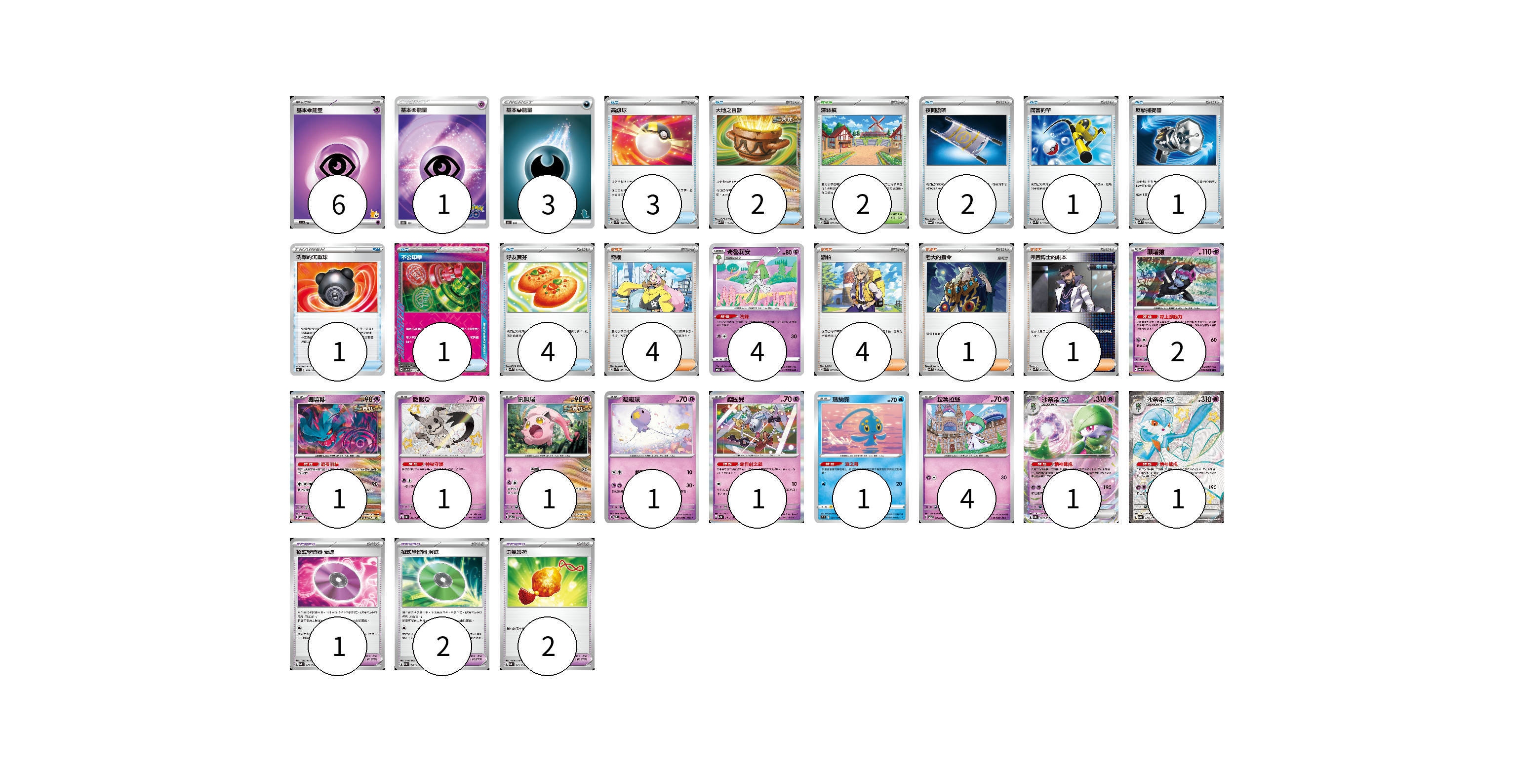 牌組構築方案 以此牌組為基礎新構築牌組 顯示卡面 顯示列表 寶可夢卡(18) 4 2 1 1 1 1 1 1 4 1 1 寶可夢道具(5) 1 2 2 物品卡(15) 3 2 2 1 1 1 1 4 支援者卡(10) 4 4 1 1 競技場卡(2) 2 能量卡(10) 6 1 3 寶可夢卡(18) 卡牌名稱 張數 卡牌名稱 張數 奇魯莉安 SVTS 003/022 04 願增猿 SV6 055/101 02 振翼髮 SV5K 033/071 01 謎擬Q SV4a 265/190 01 吼叫尾 SVTS 007/022 01 飄飄球 SVTS 005/022 01 鑰圈兒 SV4a 087/190 01 瑪納霏 S9 031/100 01 拉魯拉絲 SVTS 002/022 04 沙奈朵ex SV4a 082/190 01 沙奈朵ex SV4a 328/190 01 寶可夢道具(5) 卡牌名稱 張數 卡牌名稱 張數 招式學習器 衰退 SVK 026/042 01 招式學習器 演進 SVK 025/042 02 勇氣護符 SVK 024/042 02 物品卡(15) 卡牌名稱 張數 卡牌名稱 張數 高級球 SVK 018/042 03 大地之容器 SVK 012/042 02 夜間擔架 SV6a 056/064 02 厲害釣竿 SVK 011/042 01 反擊捕捉器 SVK 009/042 01 洗翠的沉重球 SVF 019/038 01 不公印章 SV5a 053/066 01 好友寶芬 SVK 015/042 04 支援者卡(10) 卡牌名稱 張數 卡牌名稱 張數 奇樹 SVK 031/042 04 派帕 SVK 035/042 04 老大的指令 SVK 036/042 01 弗圖博士的劇本 SVK 034/042 01 競技場卡(2) 卡牌名稱 張數 卡牌名稱 張數 深缽鎮 SVK 039/042 02 能量卡(10) 卡牌名稱 張數 卡牌名稱 張數 基本【超】能量 SVI PSY 06 基本超能量 S10b PSY 01 基本惡能量 SH DAR 03 以此牌組為基礎新構築牌組 牌組編碼 DKPNOc-tLKBGr-nYveJW copy 列印牌組單 牌組編碼已複製 分享至SNS
