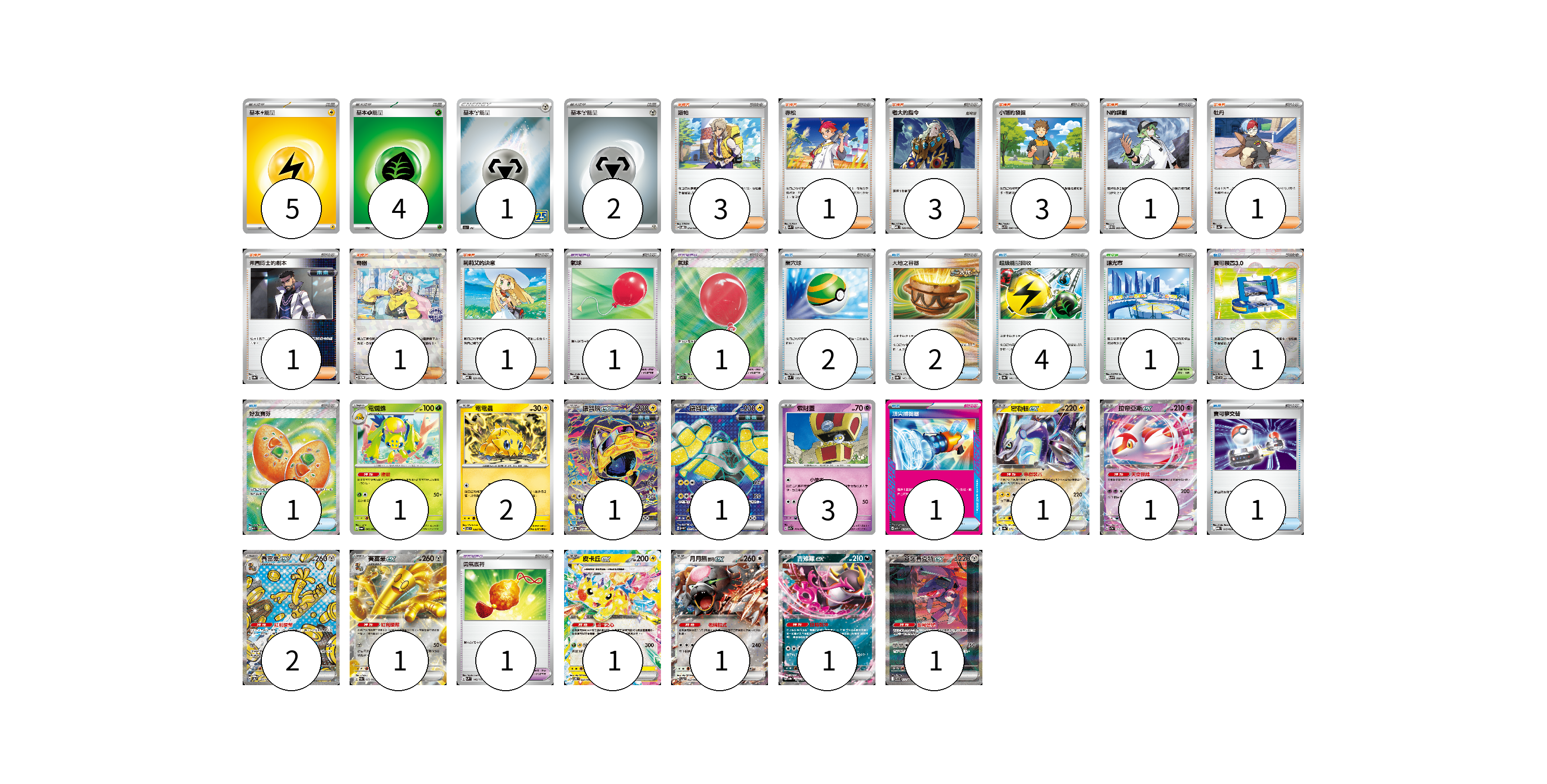 牌組構築方案 以此牌組為基礎新構築牌組 顯示卡面 顯示列表 寶可夢卡(17) 1 2 1 1 3 1 1 2 1 1 1 1 1 寶可夢道具(2) 1 1 物品卡(13) 1 2 2 4 1 1 1 1 支援者卡(15) 3 1 3 3 1 1 1 1 1 競技場卡(1) 1 能量卡(12) 5 4 1 2 寶可夢卡(17) 卡牌名稱 張數 卡牌名稱 張數 電蜘蛛 SV6a 002/064 01 電電蟲 SV7 032/102 02 鐵臂膀ex SV8a 210/187 01 鐵臂膀ex SV4M 079/066 01 索財靈 SV7a 024/064 03 密勒頓ex SV4a 071/190 01 拉帝亞斯ex SV7a 019/064 01 賽富豪ex SV8a 220/187 02 賽富豪ex SV3a 050/062 01 皮卡丘ex SV8 033/106 01 月月熊 赫月 ex SV5a 052/066 01 吉雉雞ex SV8a 104/187 01 蓋諾賽克特ex SV11B 172/086 01 寶可夢道具(2) 卡牌名稱 張數 卡牌名稱 張數 氣球 M1L 084/063 01 勇氣護符 SVM 142/175 01 物品卡(13) 卡牌名稱 張數 卡牌名稱 張數 氣球 MBD 018/022 01 巢穴球 SVM 133/175 02 大地之容器 SV8a 143/187 02 超級能量回收 SV8a 141/187 04 寶可裝置3.0 SV11B 081/086 01 好友寶芬 M1S 081/063 01 頂尖捕捉器 MBG 014/022 01 寶可夢交替 MBG 015/022 01 支援者卡(15) 卡牌名稱 張數 卡牌名稱 張數 派帕 SVOD 018/020 03 赤松 SVK 027/042 01 老大的指令 MBD 020/022 03 小剛的發掘 SV9 096/100 03 N的謀劃 SV11B 083/086 01 牡丹 SV4a 182/190 01 弗圖博士的劇本 SV8a 175/187 01 奇樹 SV-P 247/SV-P 01 莉莉艾的決意 MBD 021/022 01 競技場卡(1) 卡牌名稱 張數 卡牌名稱 張數 釀光市 SV9 098/100 01 能量卡(12) 卡牌名稱 張數 卡牌名稱 張數 基本【雷】能量 SVTR LIG 05 基本草能量 sv-p GRA 04 基本鋼能量 S8a MET 01 基本鋼能量 sv-p MET 02 以此牌組為基礎新構築牌組 牌組編碼 DKYXsK-OlIBHA-KKNJku copy 列印牌組單 牌組編碼已複製 分享至SNS