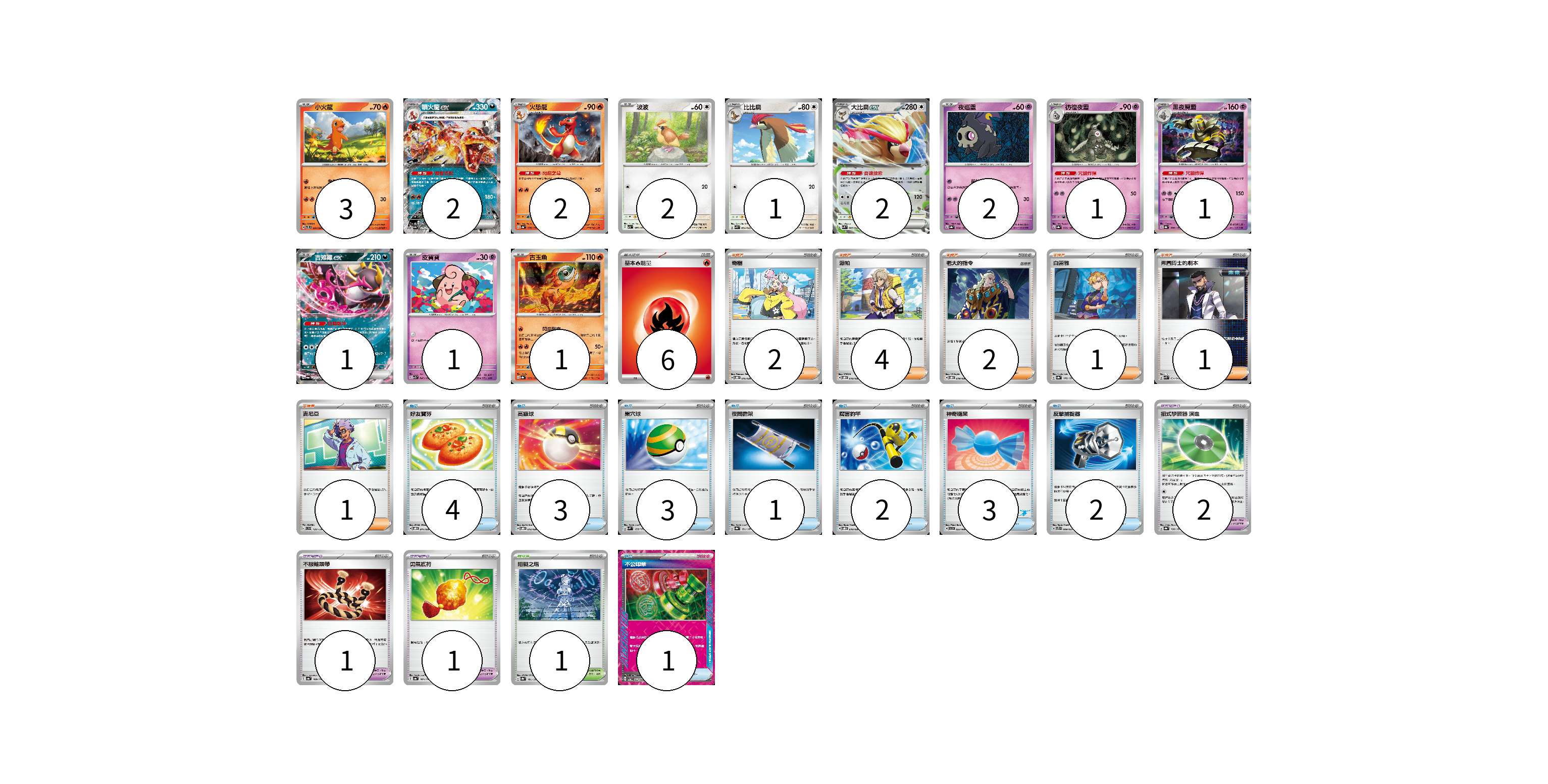 牌組構築方案 以此牌組為基礎新構築牌組 顯示卡面 顯示列表 寶可夢卡(19) 3 2 2 2 1 2 2 1 1 1 1 1 寶可夢道具(4) 2 1 1 物品卡(19) 4 3 3 1 2 3 2 1 支援者卡(11) 2 4 2 1 1 1 競技場卡(1) 1 能量卡(6) 6 寶可夢卡(19) 卡牌名稱 張數 卡牌名稱 張數 小火龍 SVTL 001/021 03 噴火龍ex SV4a 115/190 02 火恐龍 SV4a 026/190 02 波波 SV3 087/108 02 比比鳥 SVK 004/042 01 大比鳥ex SVK 005/042 02 夜巡靈 SV8a 064/187 02 彷徨夜靈 SV8a 065/187 01 黑夜魔靈 SV8a 066/187 01 吉雉雞ex SV6a 038/064 01 皮寶寶 SV3 042/108 01 古玉魚 SV8a 025/187 01 寶可夢道具(4) 卡牌名稱 張數 卡牌名稱 張數 招式學習器 演進 SV8a 160/187 02 不服輸頭帶 SV4a 168/190 01 勇氣護符 SV4a 169/190 01 物品卡(19) 卡牌名稱 張數 卡牌名稱 張數 好友寶芬 SVOD 011/020 04 高級球 SVOD 012/020 03 巢穴球 SVM 133/175 03 夜間擔架 SV8a 151/187 01 厲害釣竿 SVOD 010/020 02 神奇糖果 SVI 053/066 03 反擊捕捉器 SVTS 009/022 02 不公印章 SV5a 053/066 01 支援者卡(11) 卡牌名稱 張數 卡牌名稱 張數 奇樹 SVOD 016/020 02 派帕 SVOD 018/020 04 老大的指令 SVOD 019/020 02 白蕾雅 SV8a 176/187 01 弗圖博士的劇本 SVK 034/042 01 吉尼亞 SVD 129/139 01 競技場卡(1) 卡牌名稱 張數 卡牌名稱 張數 阻礙之塔 SV8a 181/187 01 能量卡(6) 卡牌名稱 張數 卡牌名稱 張數 基本【火】能量 SVHK FIR 06 以此牌組為基礎新構築牌組 牌組編碼 DPAZzC-VxmclQ-TOSnxC copy 列印牌組單 牌組編碼已複製 分享至SNS
