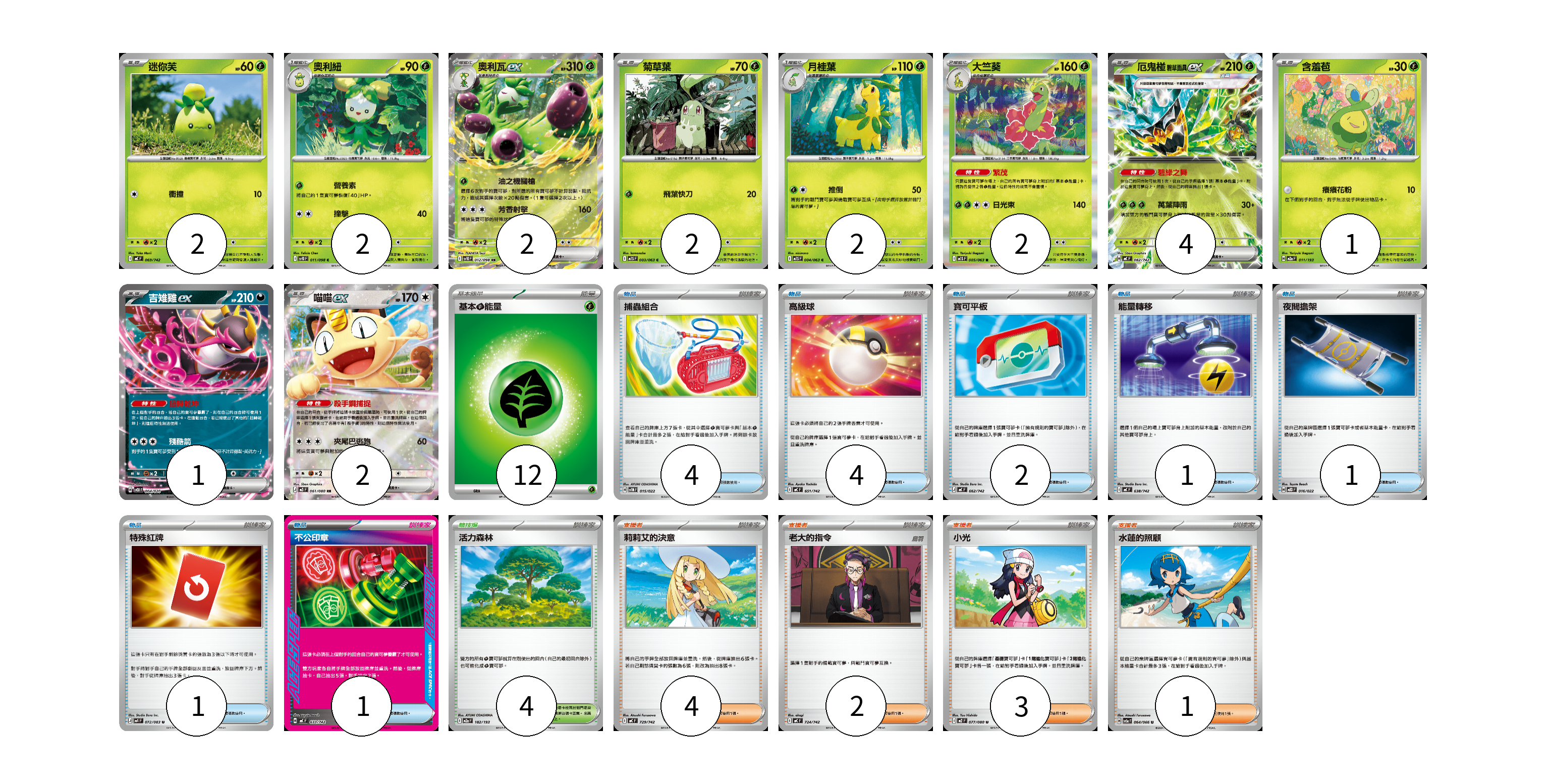 牌組構築方案 以此牌組為基礎新構築牌組 顯示卡面 顯示列表 寶可夢卡(20) 2 2 2 2 2 2 4 1 1 2 物品卡(14) 4 4 2 1 1 1 1 支援者卡(10) 4 2 3 1 競技場卡(4) 4 能量卡(12) 12 寶可夢卡(20) 卡牌名稱 張數 卡牌名稱 張數 迷你芙 MC 069/742 02 奧利紐 SV10 011/098 02 奧利瓦ex SV10 012/098 02 菊草葉 M1S 003/063 02 月桂葉 M1S 004/063 02 大竺葵 M1S 005/063 02 厄鬼椪 碧草面具ex MC 082/742 04 含羞苞 M2a 011/193 01 吉雉雞ex SVOD 004/020 01 喵喵ex M3 061/080 02 物品卡(14) 卡牌名稱 張數 卡牌名稱 張數 捕蟲組合 SVTM 015/022 04 高級球 MC 651/742 04 寶可平板 MC 662/742 02 能量轉移 MC 638/742 01 夜間擔架 MBD 016/022 01 特殊紅牌 M4 072/083 01 不公印章 MC 633/742 01 支援者卡(10) 卡牌名稱 張數 卡牌名稱 張數 莉莉艾的決意 MC 729/742 04 老大的指令 MC 724/742 02 小光 M2 077/080 03 水蓮的照顧 SV5a 064/066 01 競技場卡(4) 卡牌名稱 張數 卡牌名稱 張數 活力森林 M2a 182/193 04 能量卡(12) 卡牌名稱 張數 卡牌名稱 張數 基本【草】能量 MJ GRA 12 以此牌組為基礎新構築牌組 牌組編碼 DQKKGc-iTxvxj-IIJyZO copy 列印牌組單 牌組編碼已複製 分享至SNS