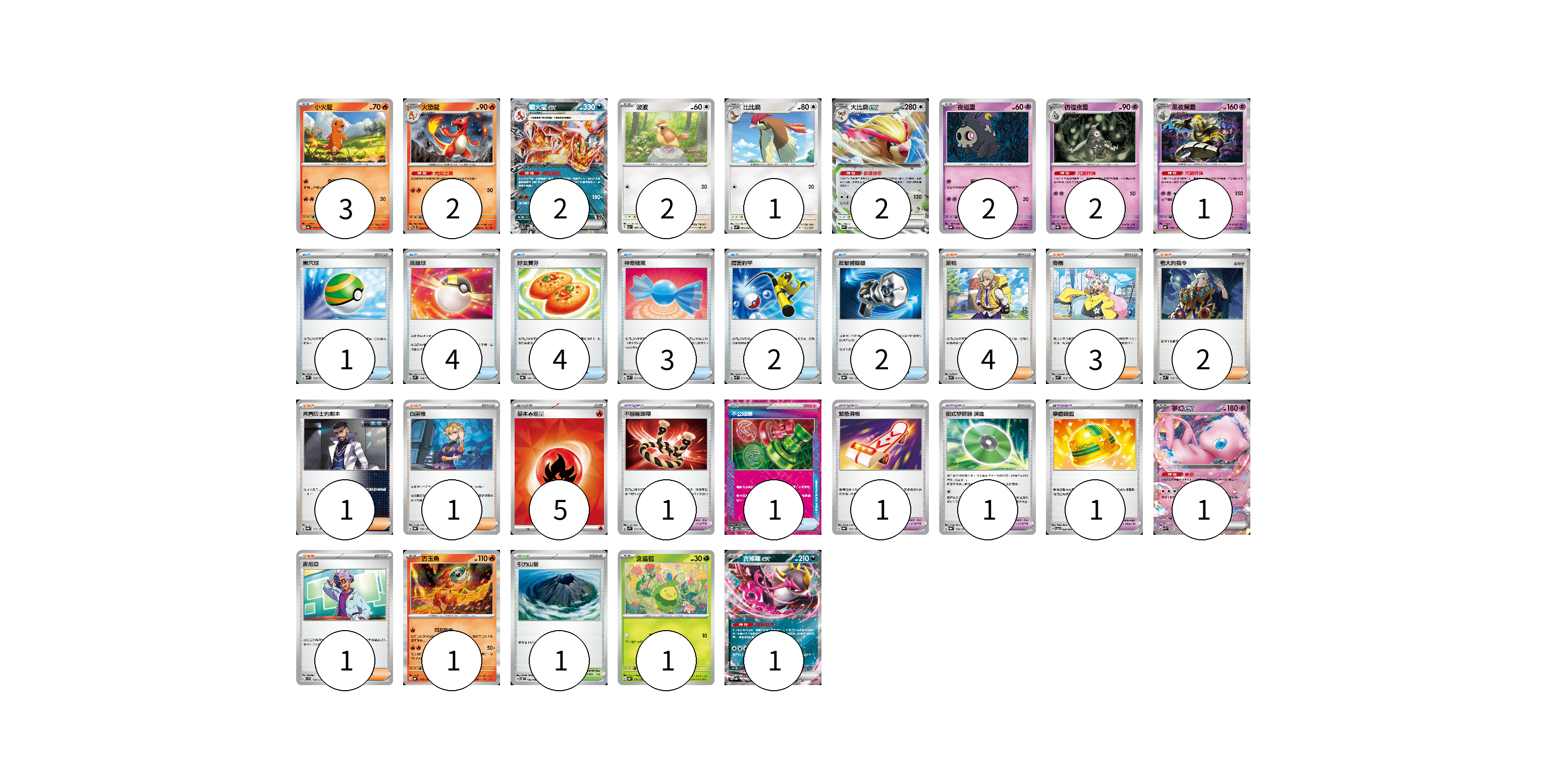 牌組構築方案 以此牌組為基礎新構築牌組 顯示卡面 顯示列表 寶可夢卡(21) 3 2 2 2 1 2 2 2 1 1 1 1 1 寶可夢道具(4) 1 1 1 1 物品卡(17) 1 4 4 3 2 2 1 支援者卡(12) 4 3 2 1 1 1 競技場卡(1) 1 能量卡(5) 5 寶可夢卡(21) 卡牌名稱 張數 卡牌名稱 張數 小火龍 SV4a 025/190 03 火恐龍 SVTL 002/021 02 噴火龍ex SVTL 006/021 02 波波 SV3 087/108 02 比比鳥 SVK 004/042 01 大比鳥ex SVK 005/042 02 夜巡靈 SV8a 064/187 02 彷徨夜靈 SV8a 065/187 02 黑夜魔靈 SV8a 066/187 01 夢幻ex SVK 001/042 01 古玉魚 SV8a 025/187 01 含羞苞 SV8a 001/187 01 吉雉雞ex SV8a 104/187 01 寶可夢道具(4) 卡牌名稱 張數 卡牌名稱 張數 不服輸頭帶 SV1S 073/078 01 緊急滑板 SV8a 153/187 01 招式學習器 演進 SV8a 160/187 01 幸運頭盔 SV5a 060/066 01 物品卡(17) 卡牌名稱 張數 卡牌名稱 張數 巢穴球 SVM 133/175 01 高級球 SVM 134/175 04 好友寶芬 SV8a 147/187 04 神奇糖果 SVK 019/042 03 厲害釣竿 SVK 011/042 02 反擊捕捉器 SV8a 139/187 02 不公印章 SV5a 053/066 01 支援者卡(12) 卡牌名稱 張數 卡牌名稱 張數 派帕 SVK 035/042 04 奇樹 SVM 160/175 03 老大的指令 SVM 172/175 02 弗圖博士的劇本 SV8a 175/187 01 白蕾雅 SV8a 176/187 01 吉尼亞 SVD 129/139 01 競技場卡(1) 卡牌名稱 張數 卡牌名稱 張數 引力山岳 SV8 106/106 01 能量卡(5) 卡牌名稱 張數 卡牌名稱 張數 基本【火】能量 SVK FIR 05 以此牌組為基礎新構築牌組 牌組編碼 DWHBsL-TnlXDz-XCaadt copy 列印牌組單 牌組編碼已複製 分享至SNS